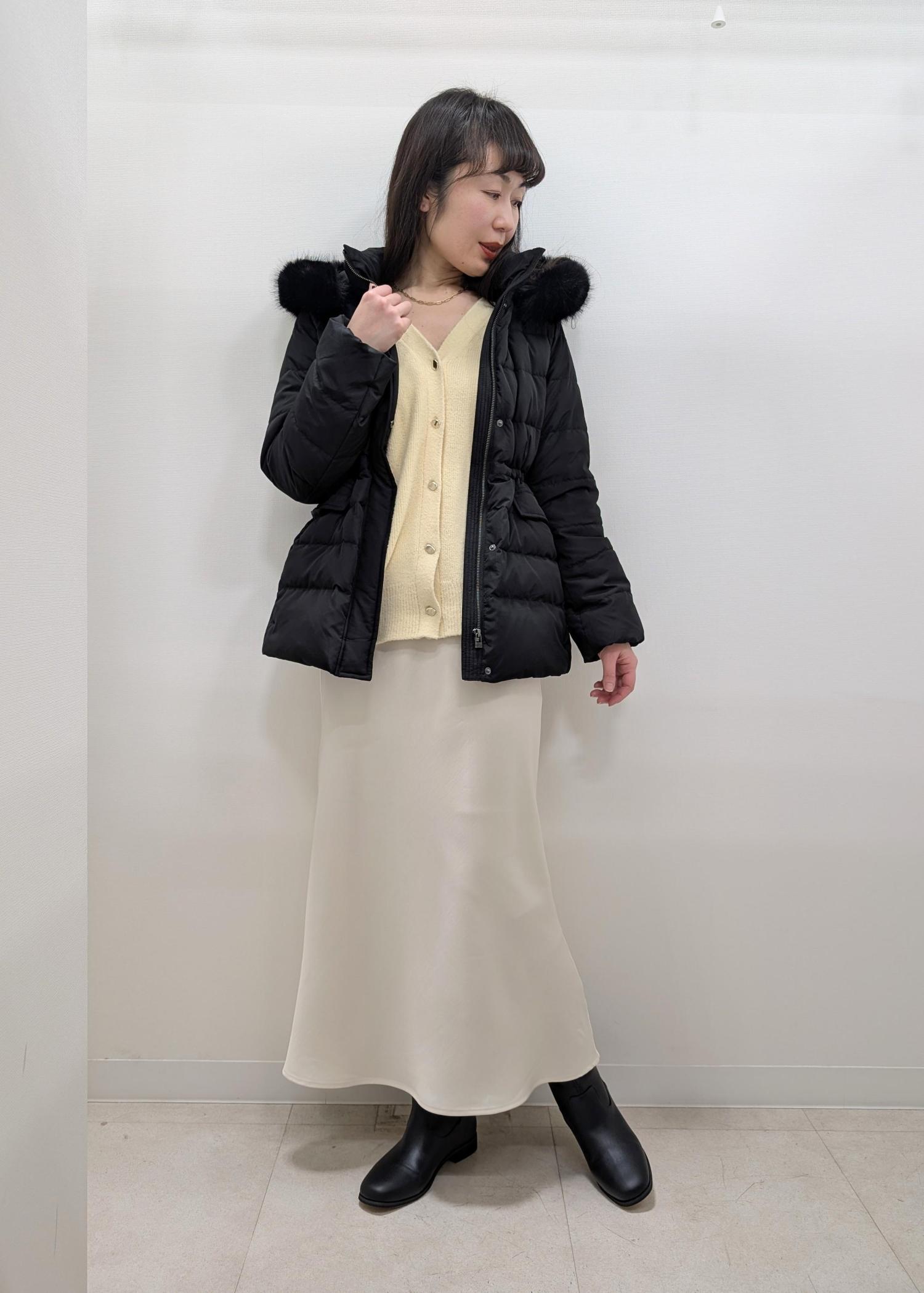 私は骨格ウェーブで長めのダウンコートは膨張して見えることが多いですが、こちらは切り替えがあるのでスッキリ見えました! -