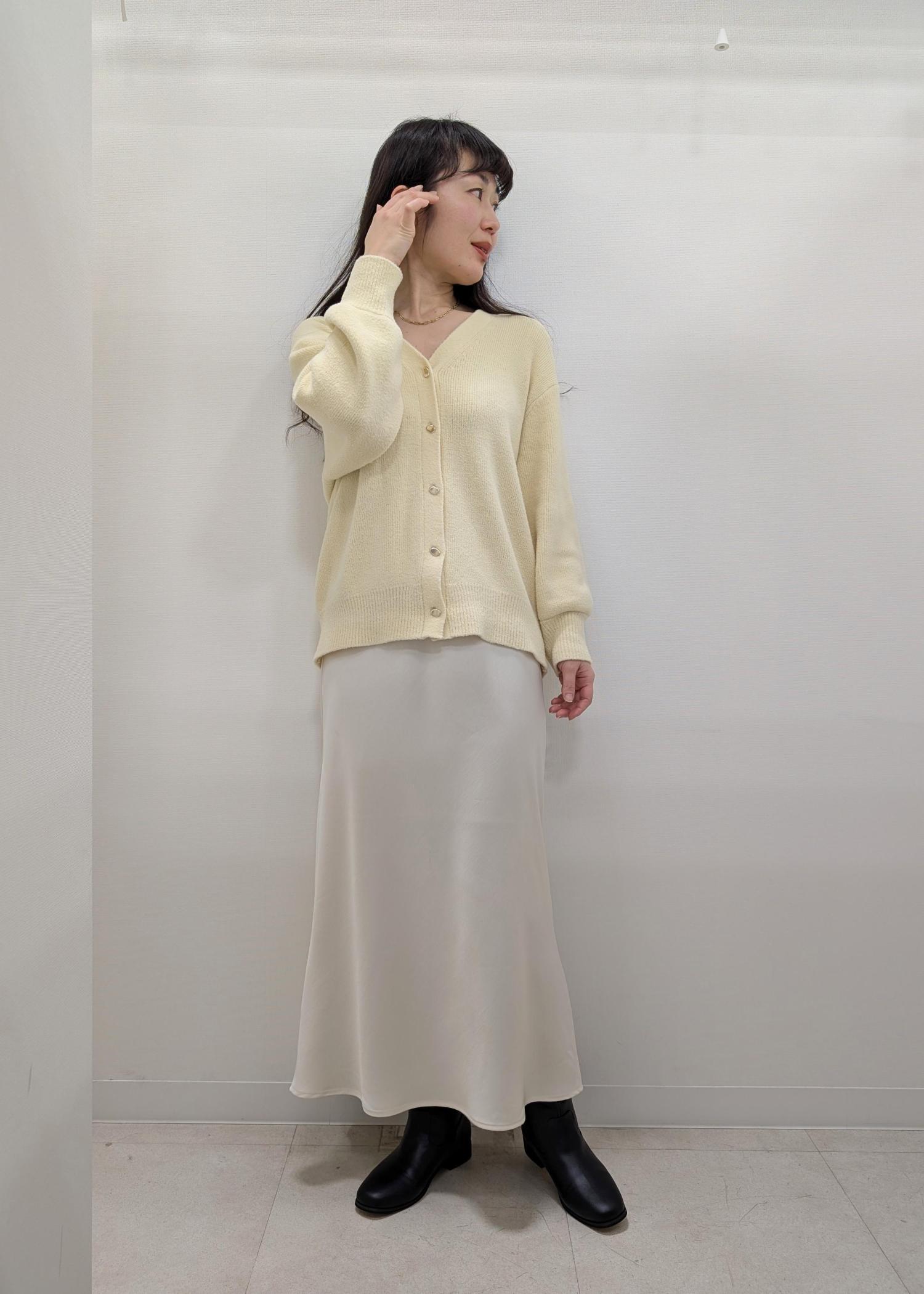 ウエストを絞りペプラムシルエットにして、ボトムを艶感のあるサテンスカートにすることで、女性らしいコーディネートにまとめました★