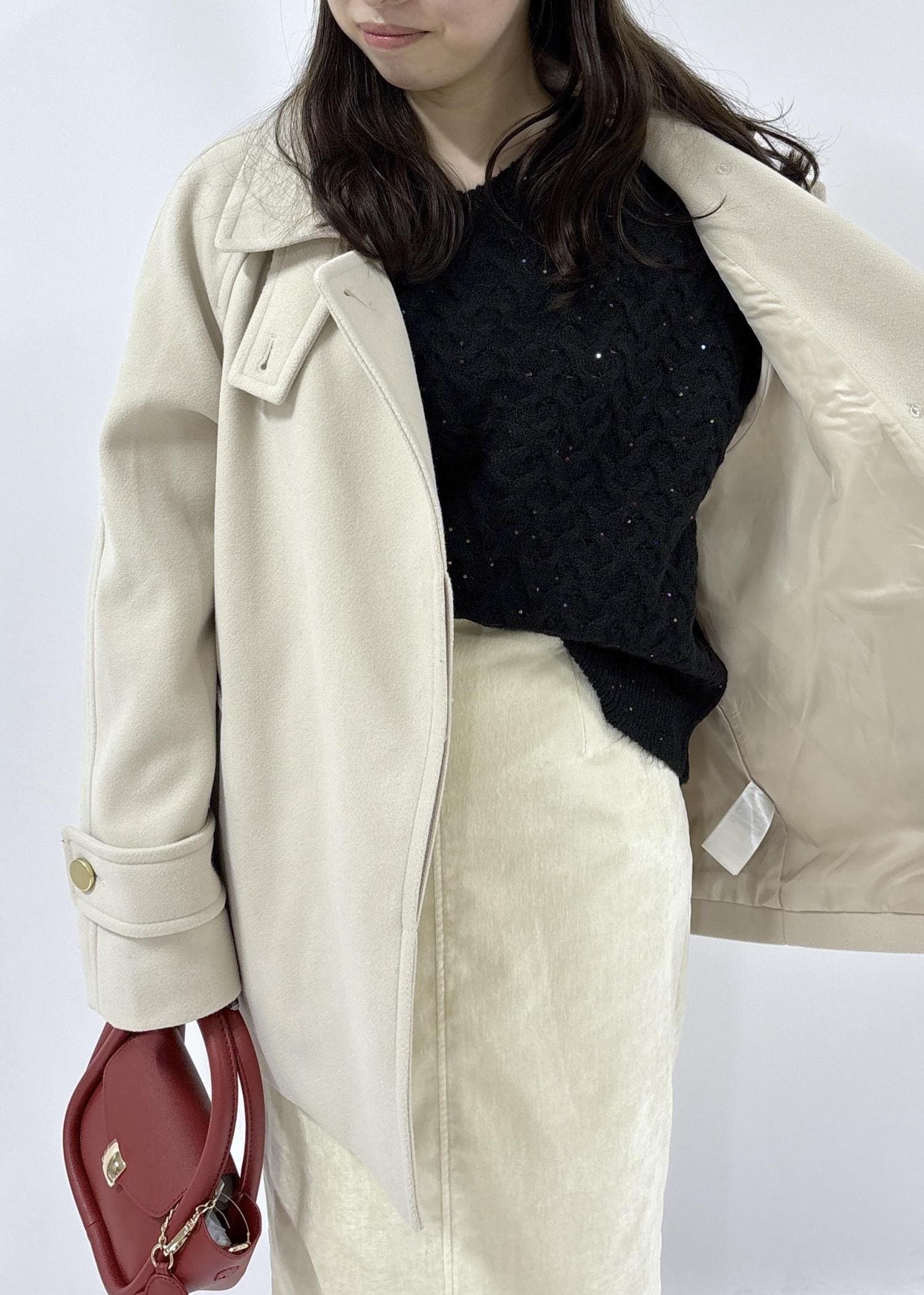 ROPÉ PICNICジャージーメルトンシリーズ 金ボタンミドル丈コート/リンクコーデベージュ / F¥7,692レビューオーバーサイズのサイズ感でしたが、カジュアル過ぎずキレイめに着用出来ます。