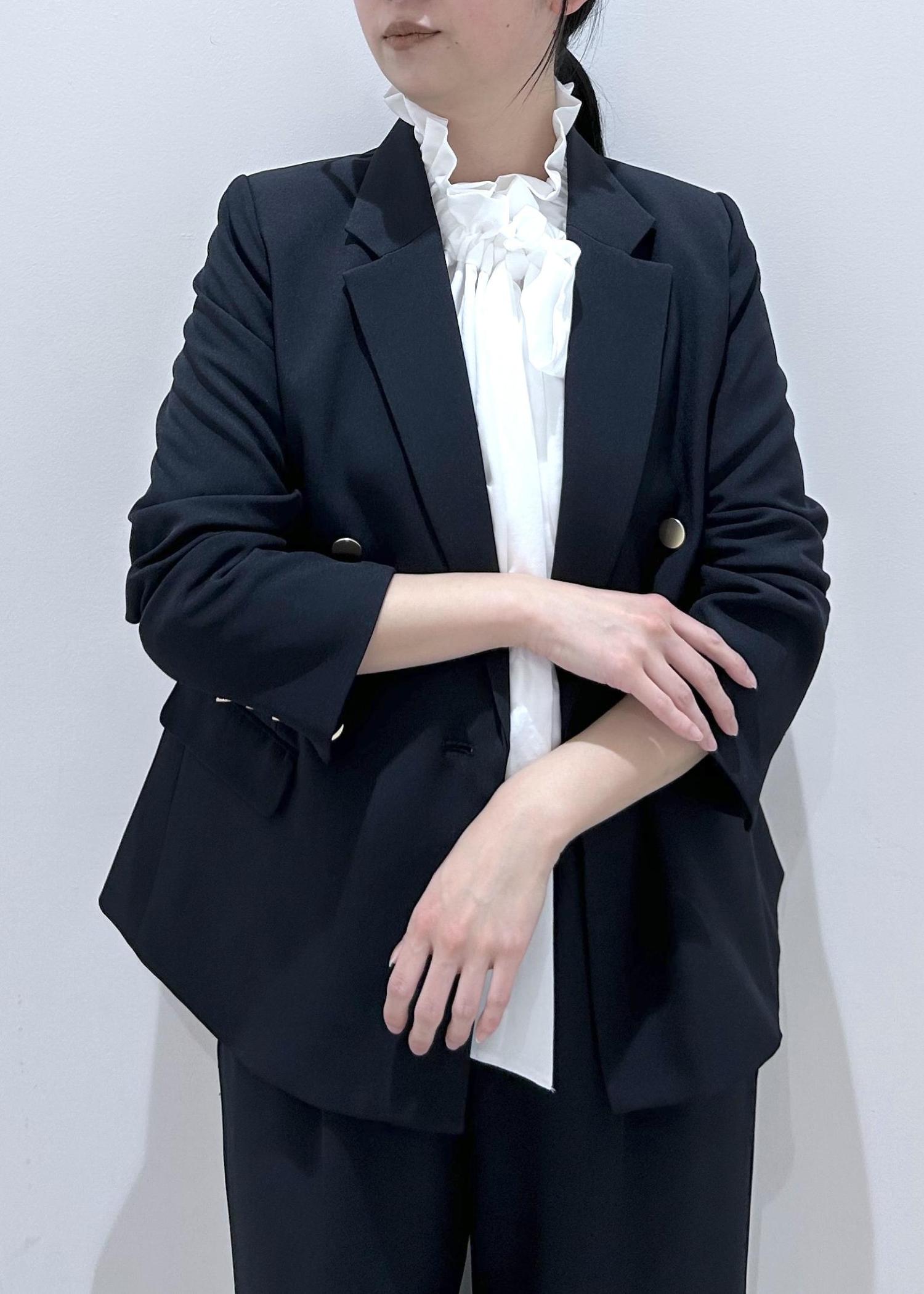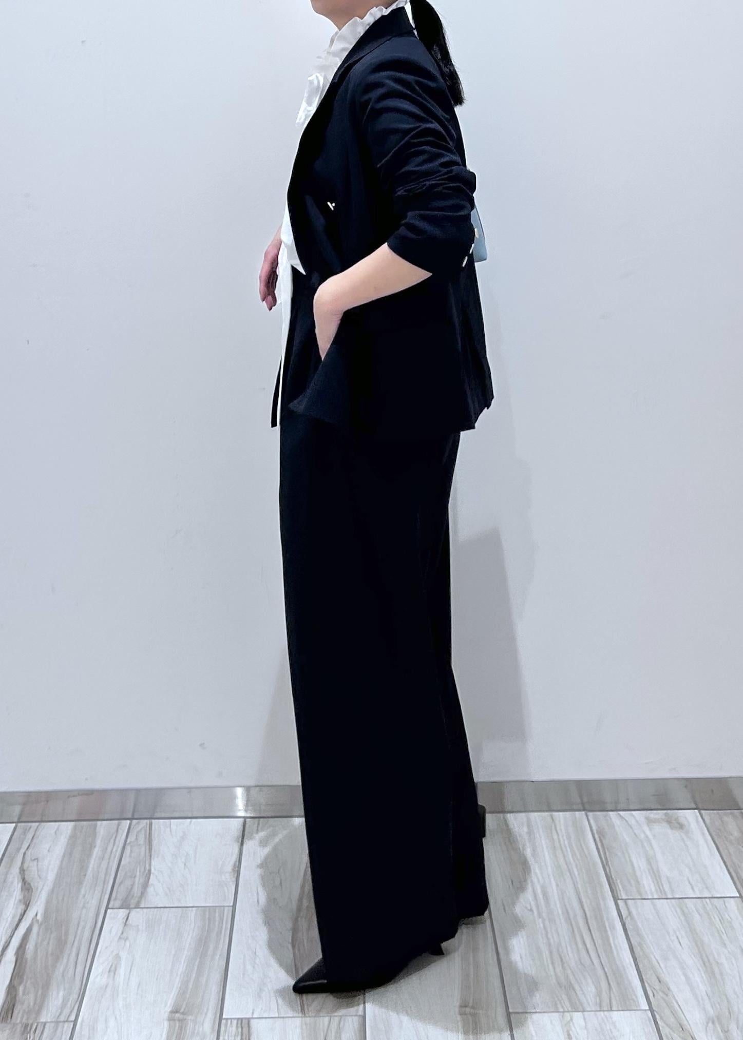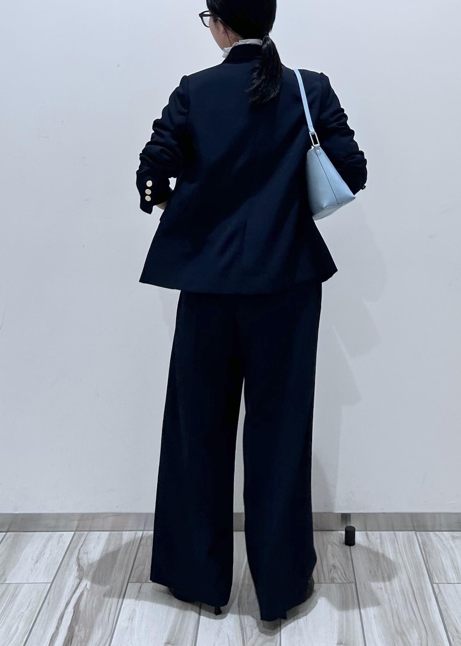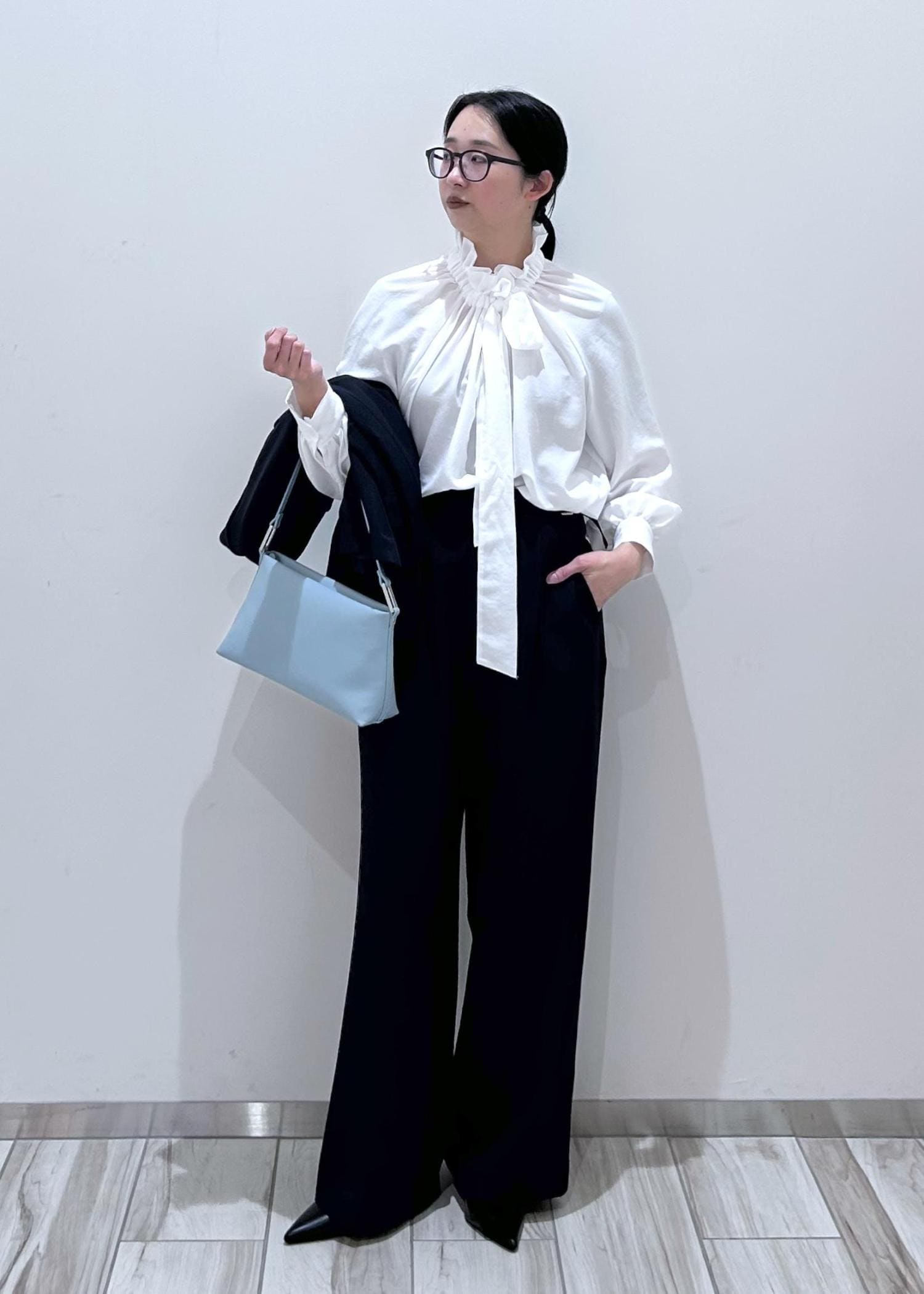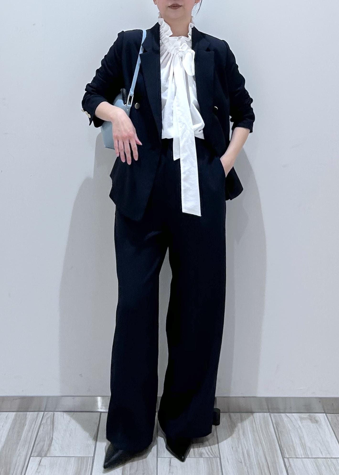端正なネイビーのジャケット×パンツのセットアップに、白のボウタイブラウスで柔らかな華やぎをプラス。顔まわりを明るく見せつつ、きちんと感のある印象に仕上げました。