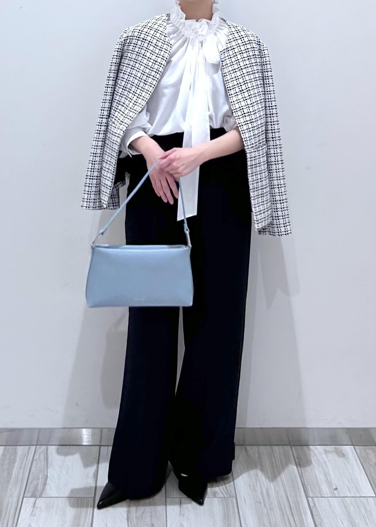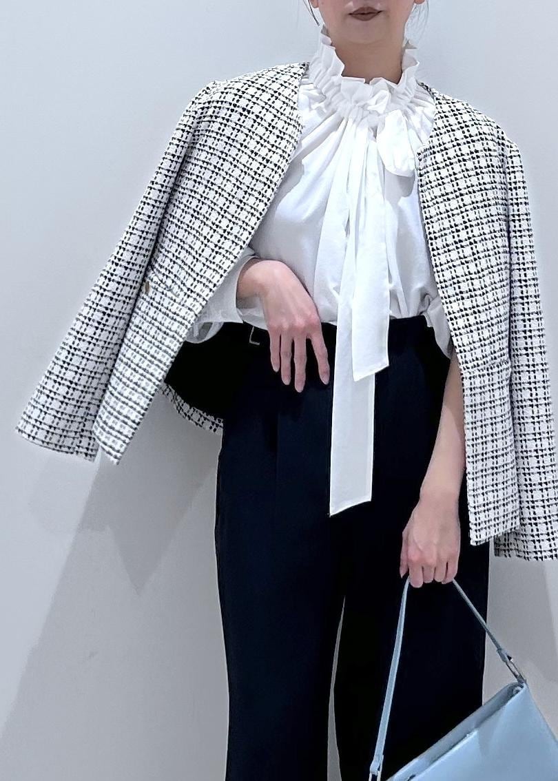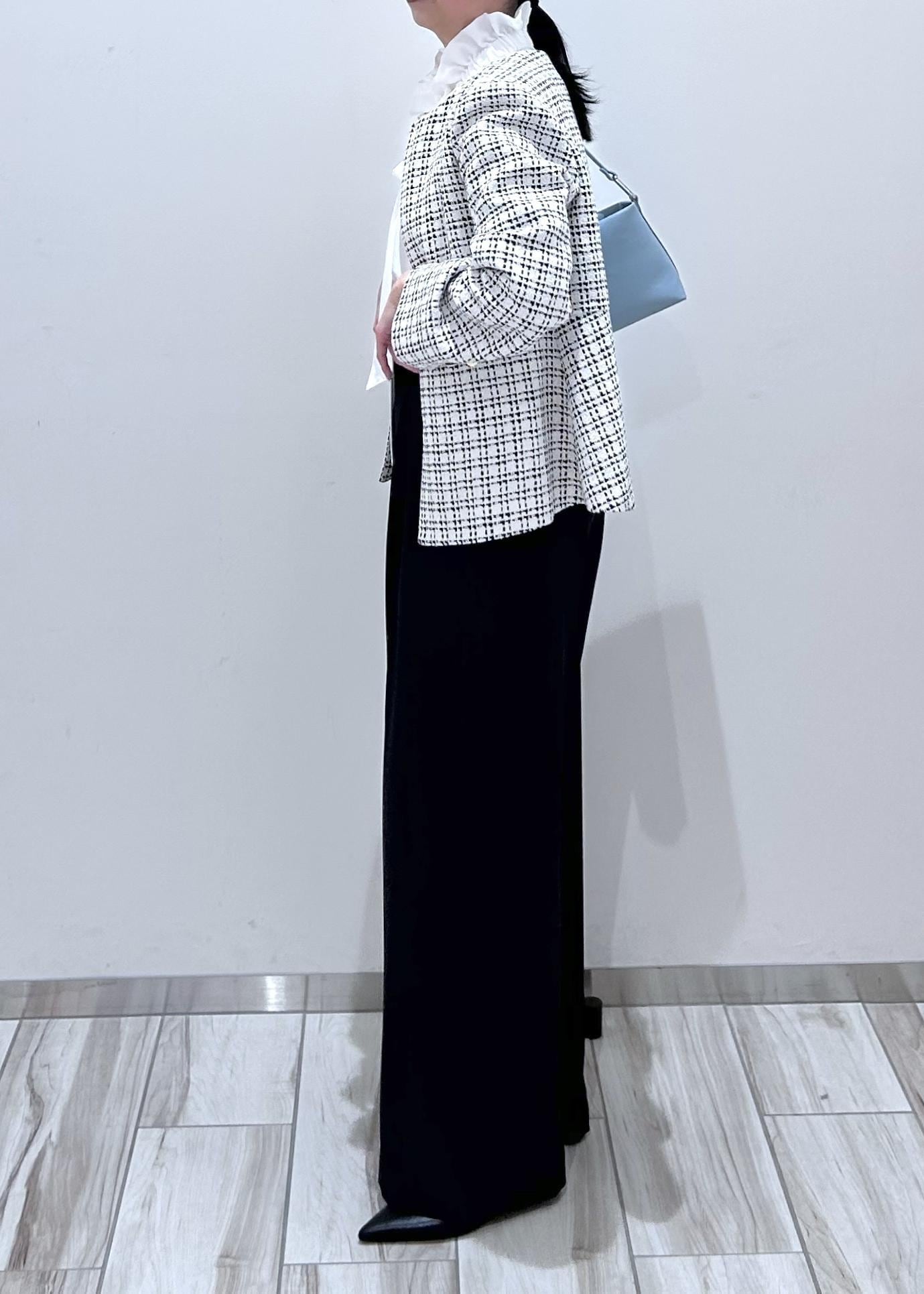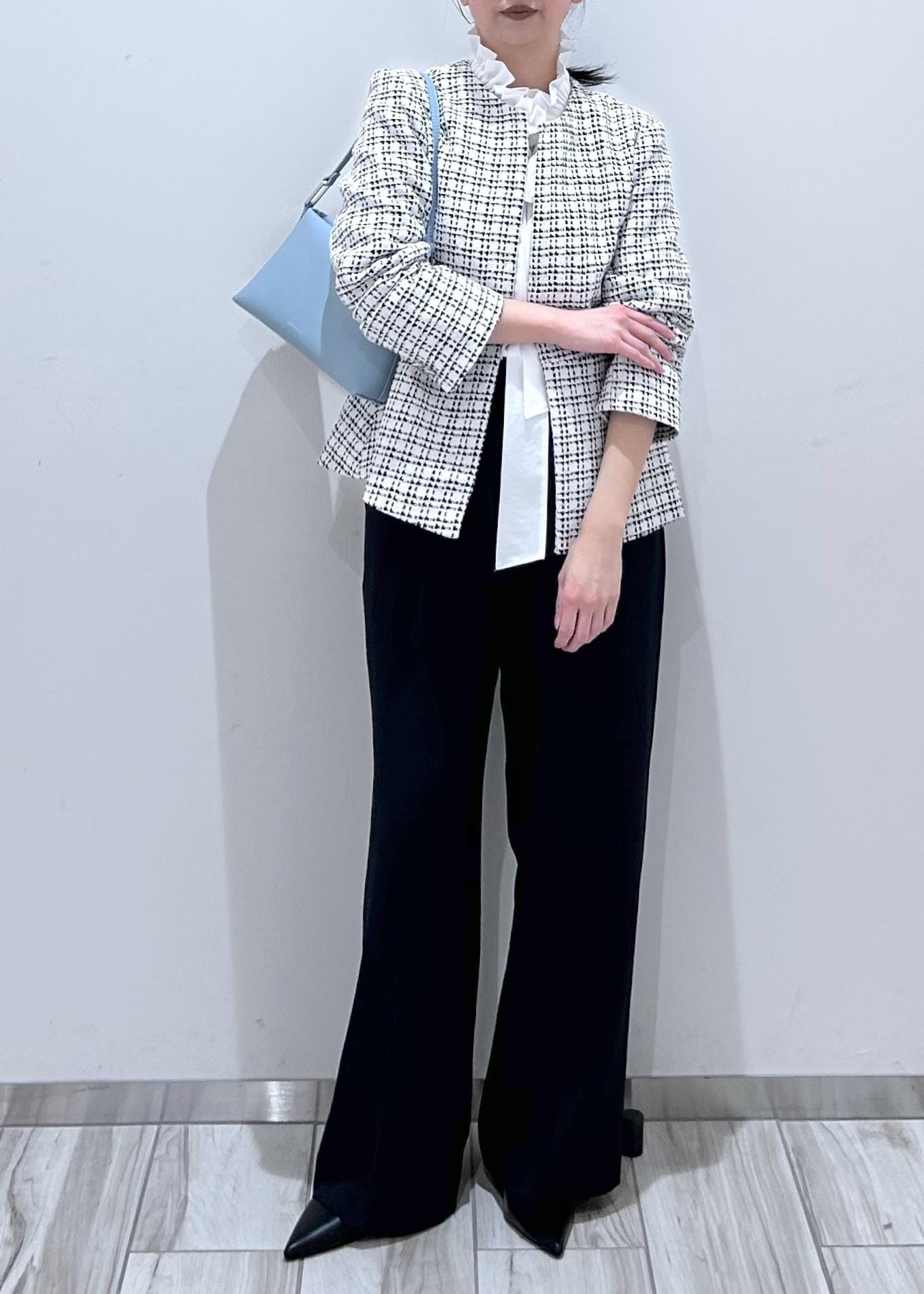 華やかさのある白のツィードジャケットに、ネイビーパンツを合わせて甘さを程よく引き締めたセレモニーコーデ。