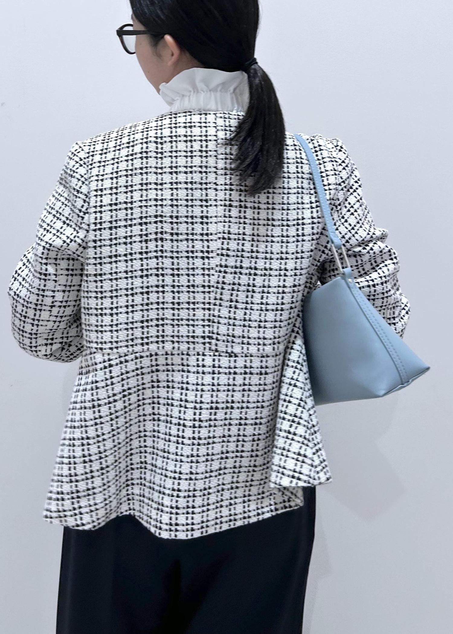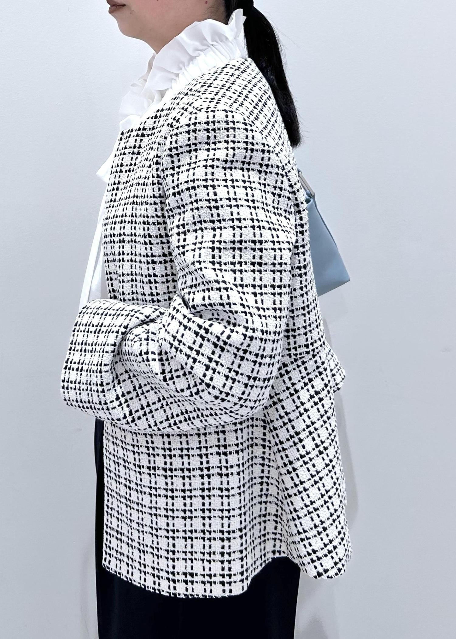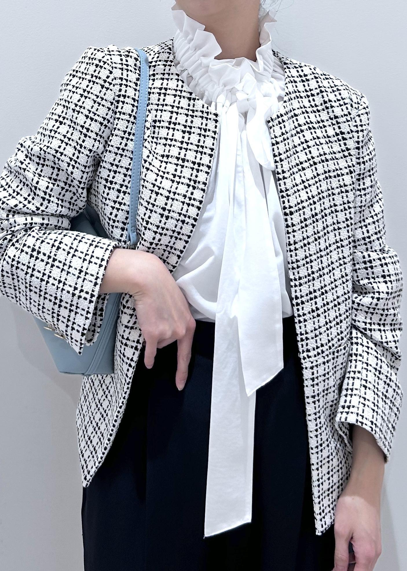 華やかさのある白のツィードジャケットに、ネイビーパンツを合わせて甘さを程よく引き締めたセレモニーコーデ。