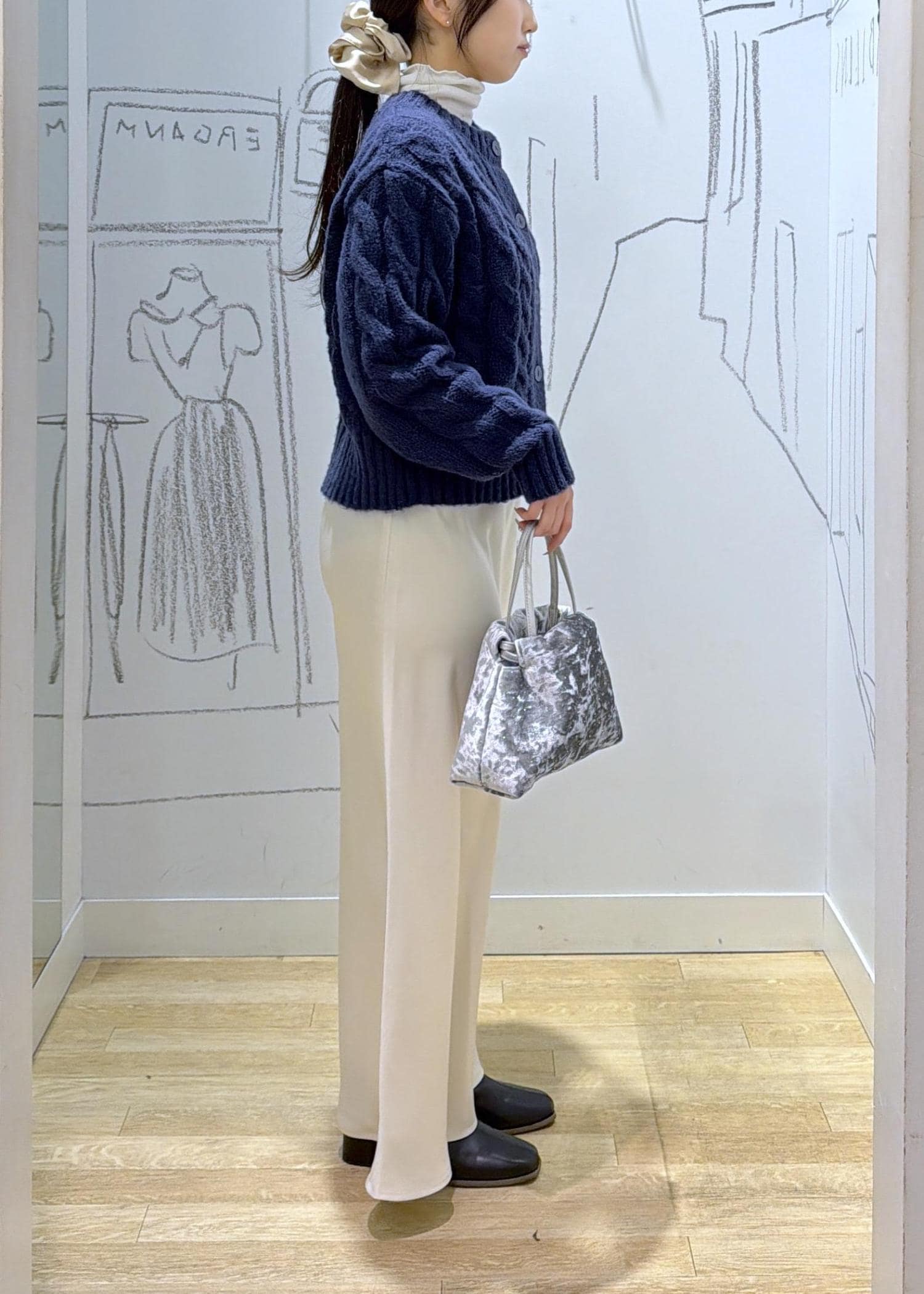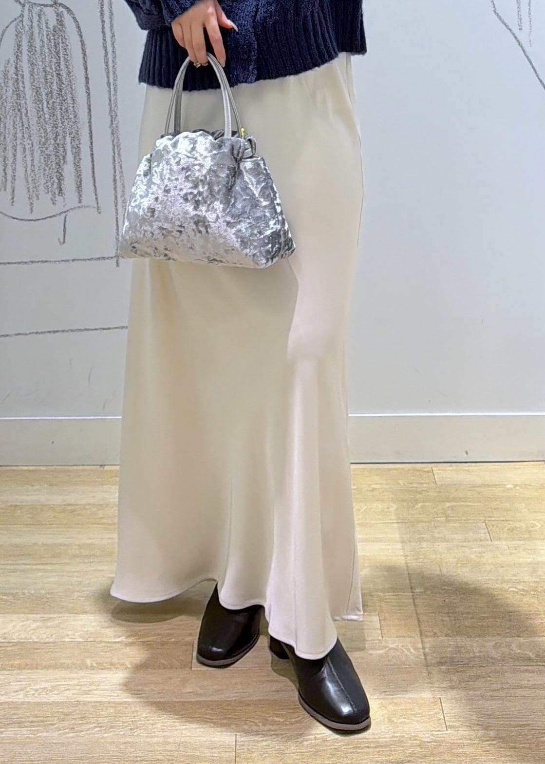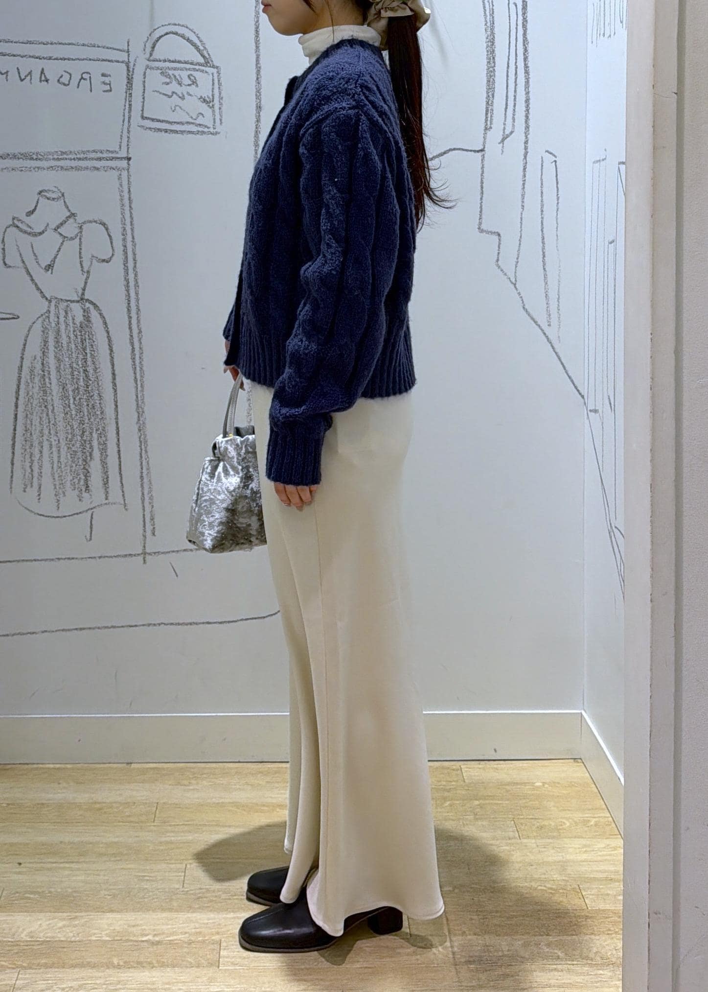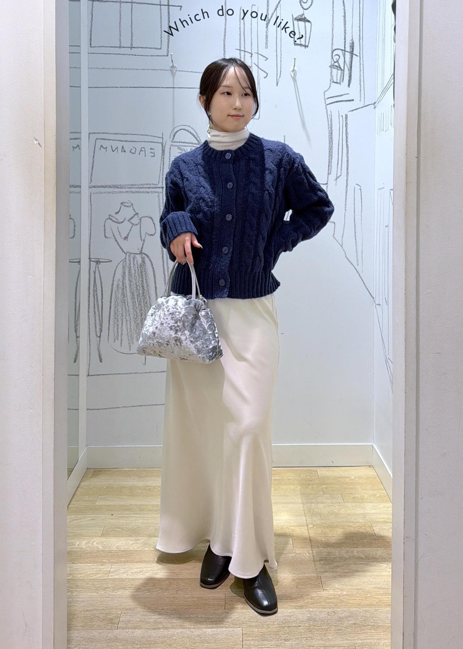 サテン生地のフレアスカートは綺麗目な印象になりやすいのであえてカーディガンを合わせ綺麗目カジュアルなイメージにしました。