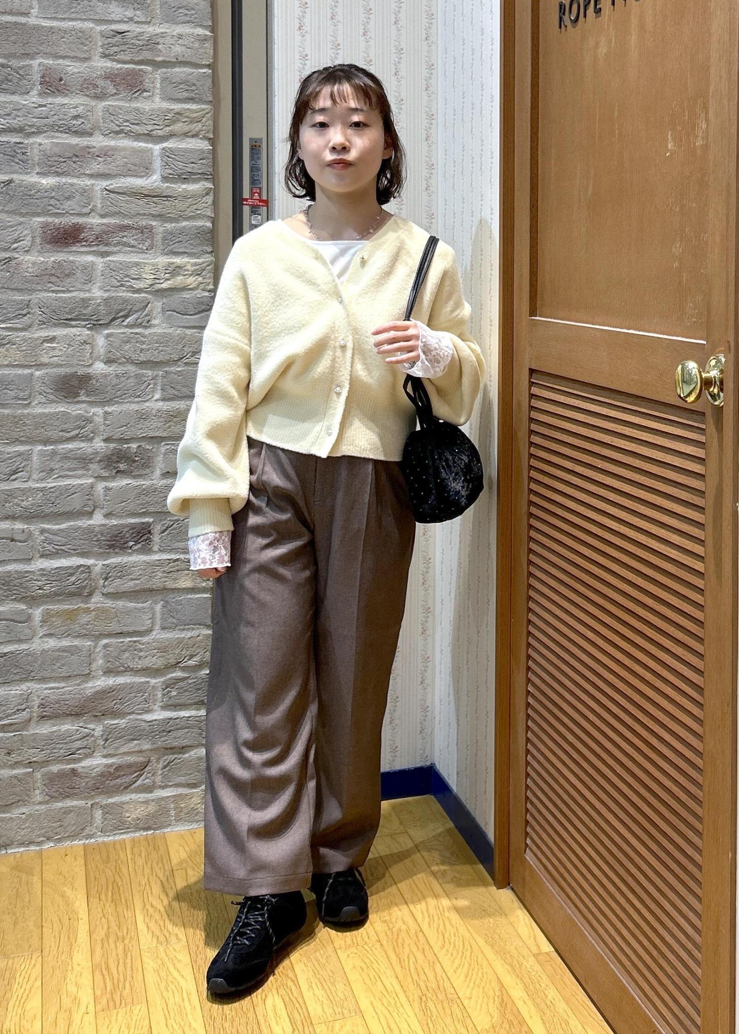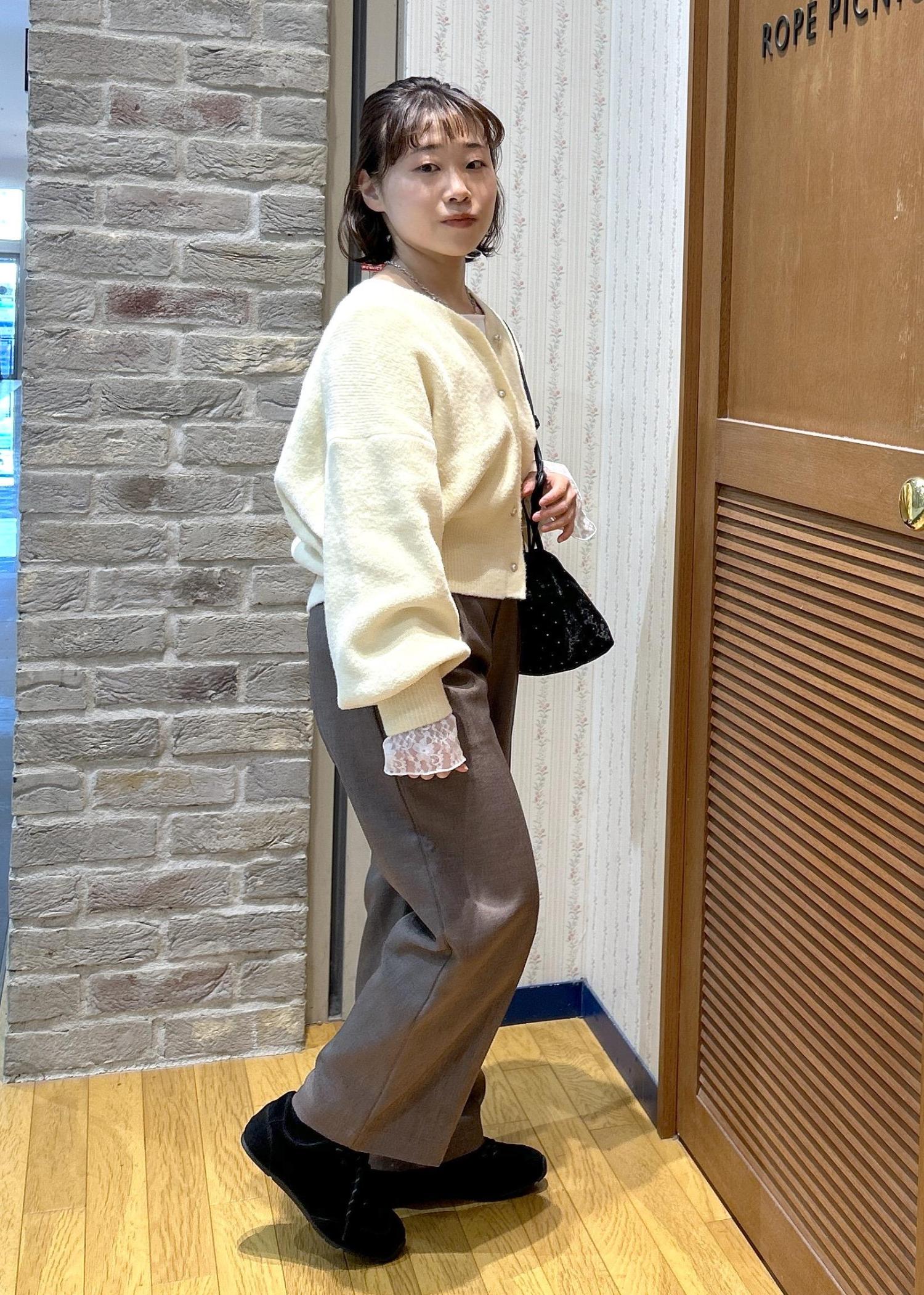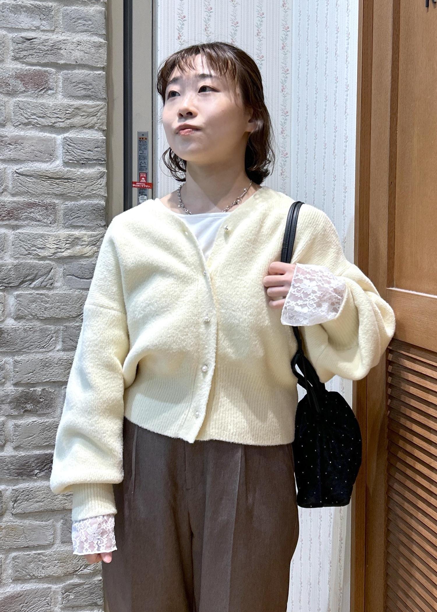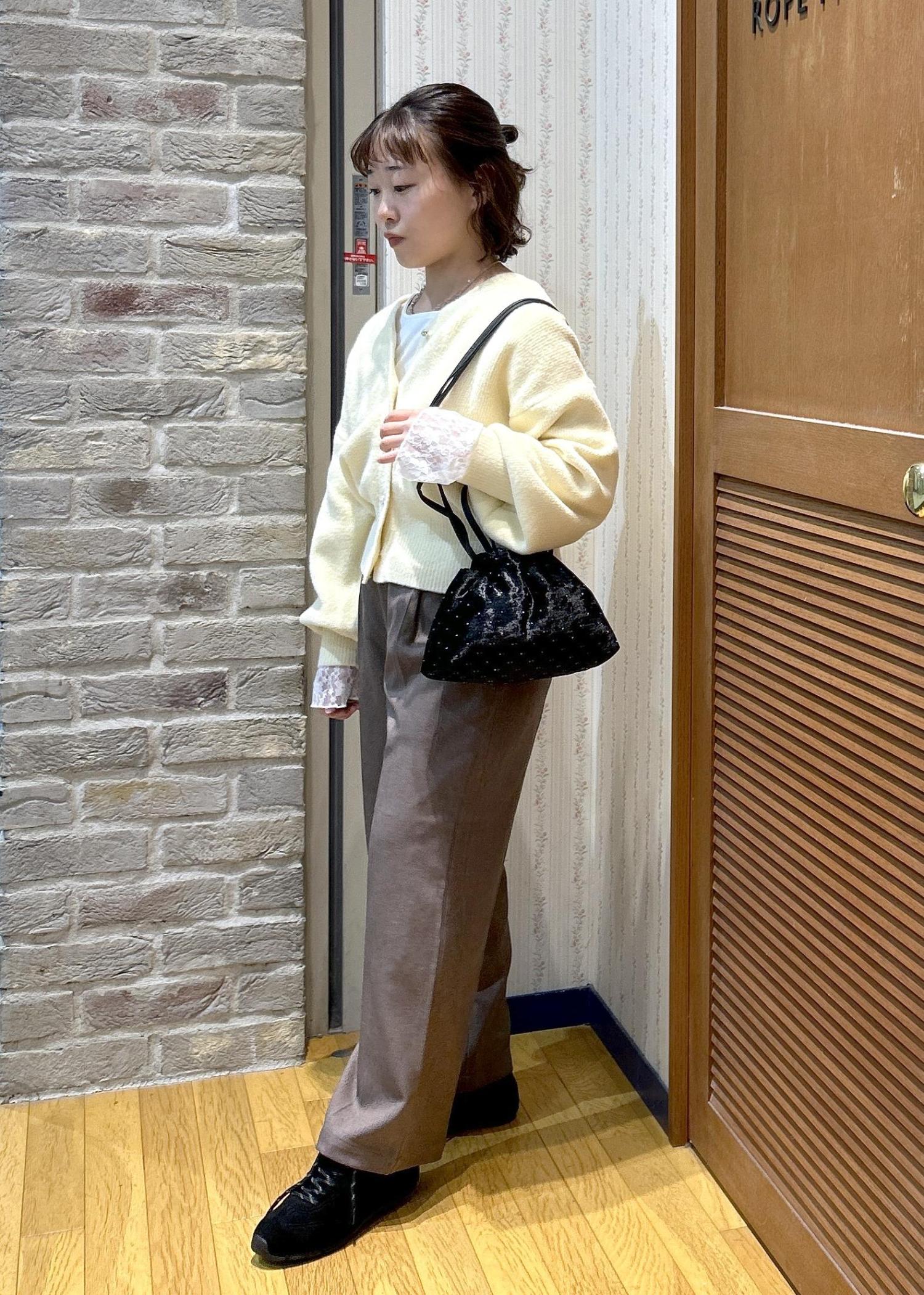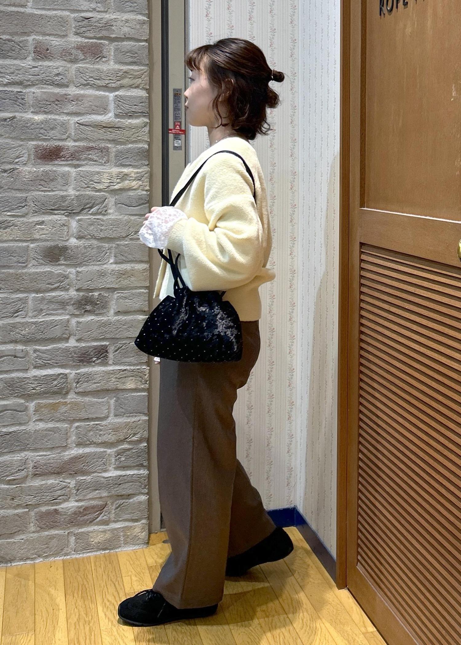 ふんわり優しい色味のカーディガンと、締めカラーのブラックの小物使いで、メリハリを付けて合わせてみました!