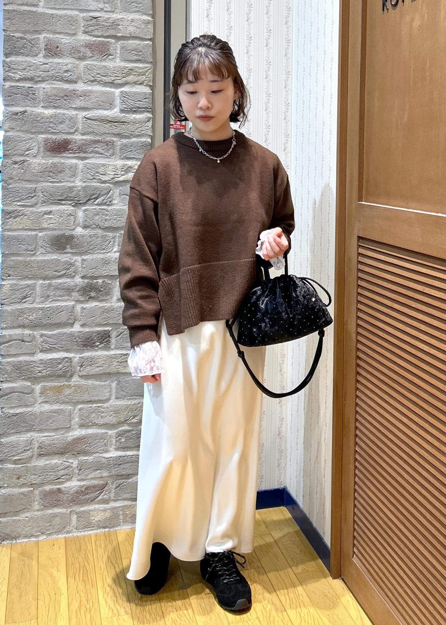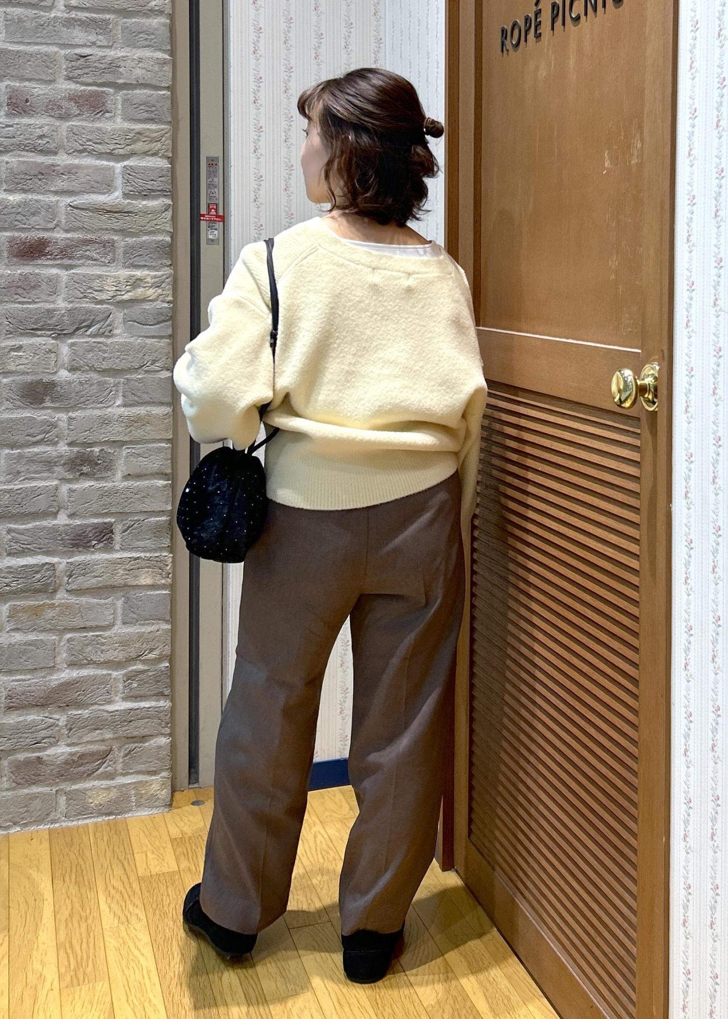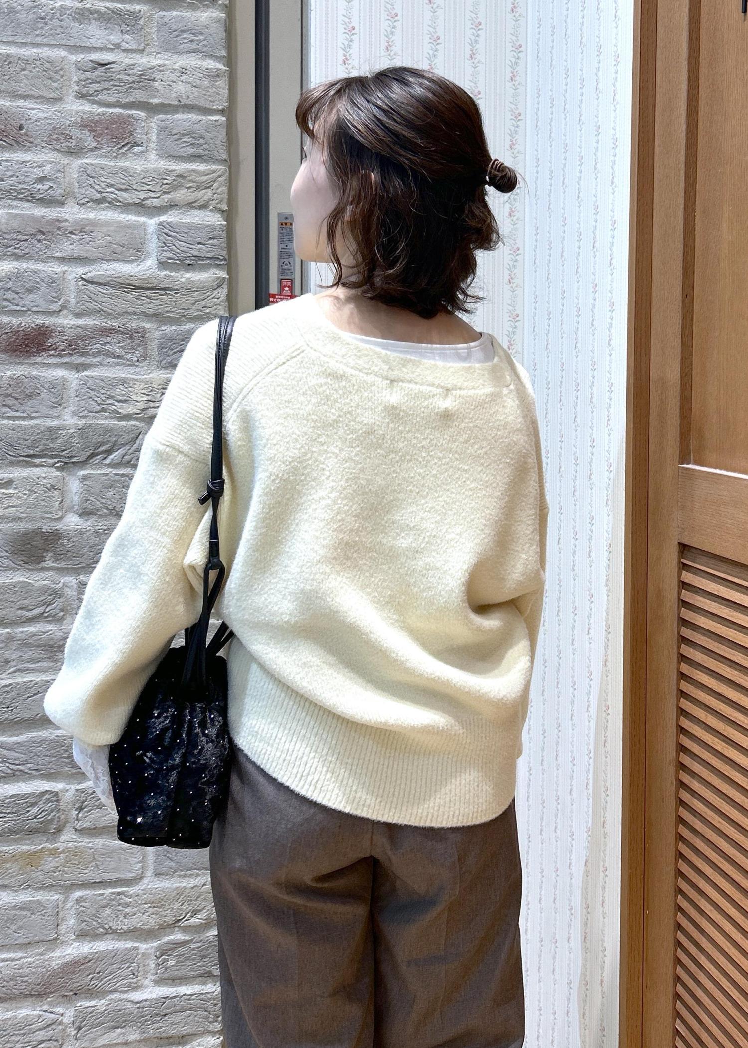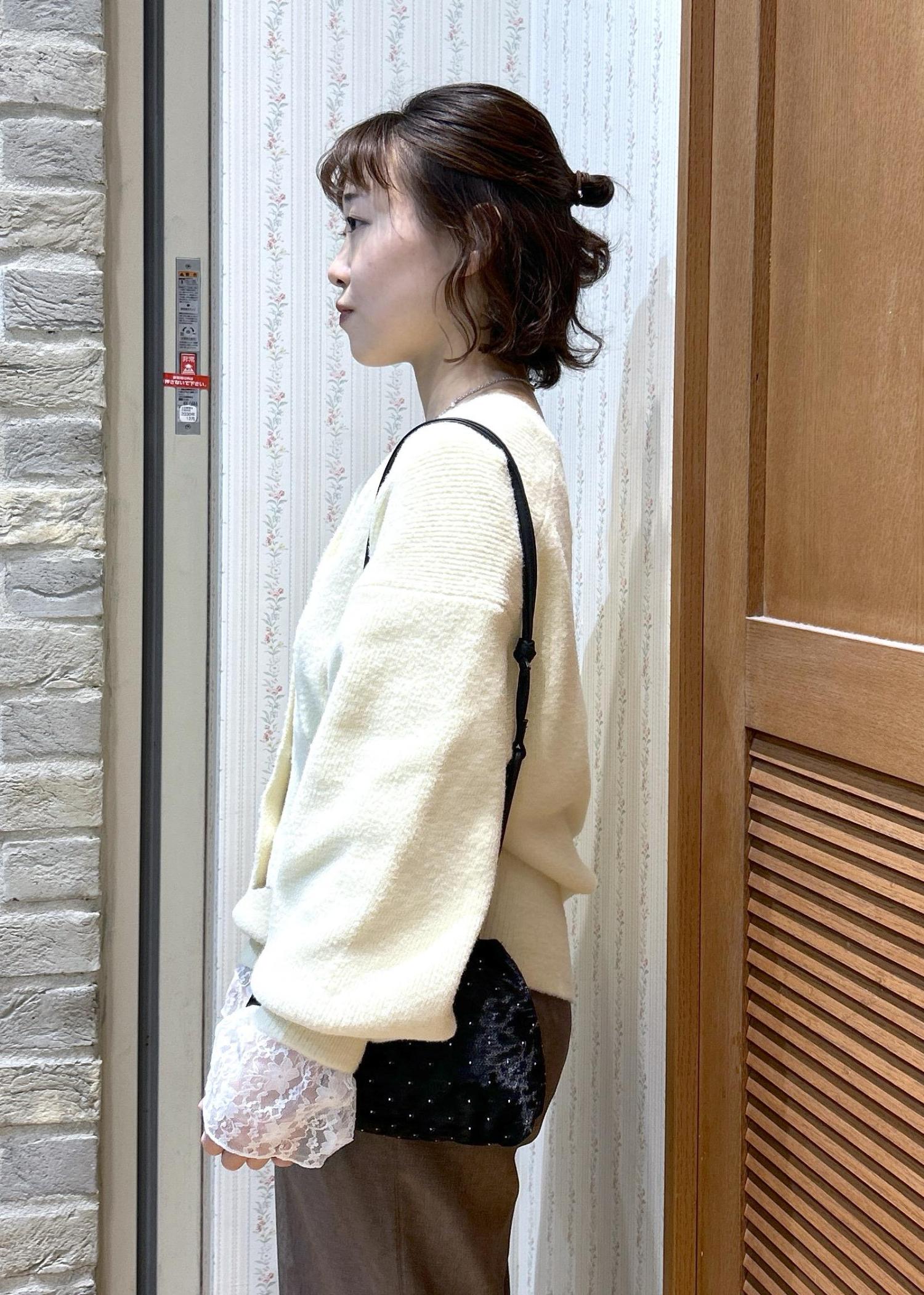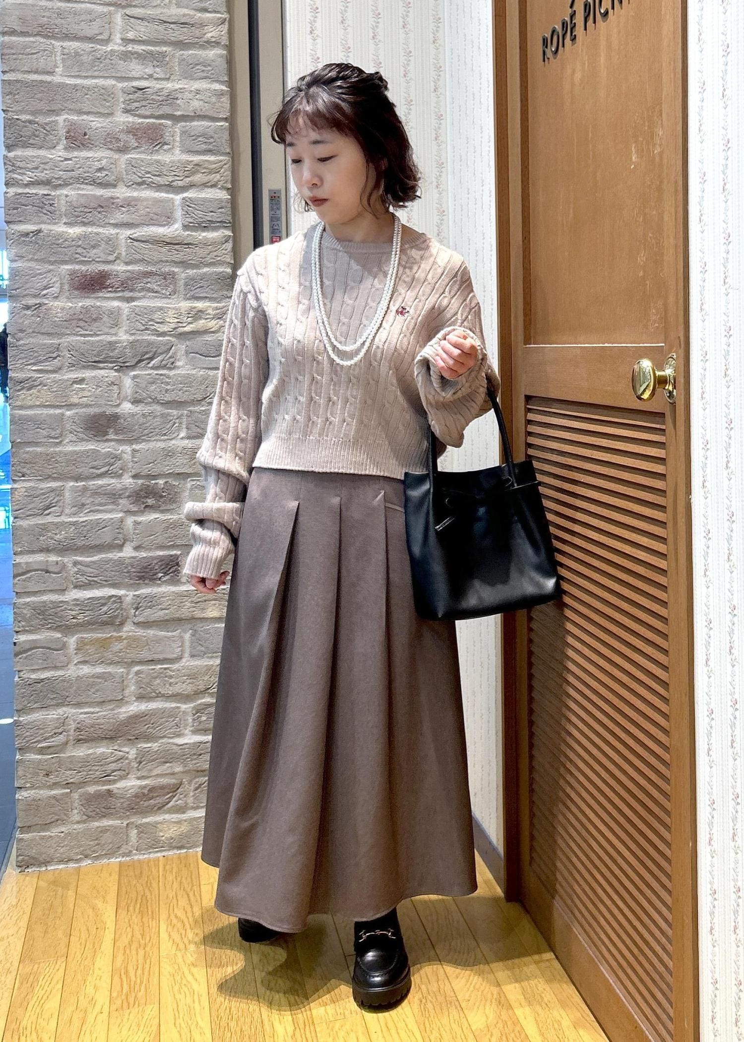 ふんわり優しい色味のカーディガンと、締めカラーのブラックの小物使いで、メリハリを付けて合わせてみました!