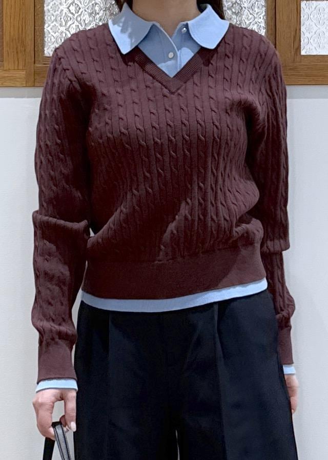ダークブラウン(20)は、ブラウンのニットにブルーのシャツをレイヤードしているように見えるトップスで、顔周りが暗く見えないのが嬉しいポイント◎ -
