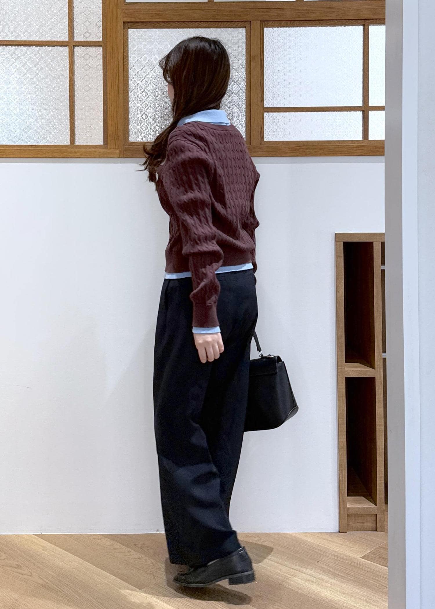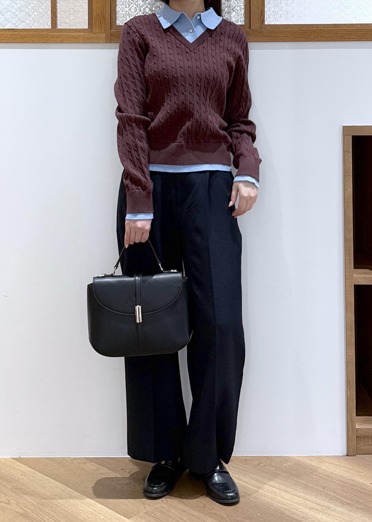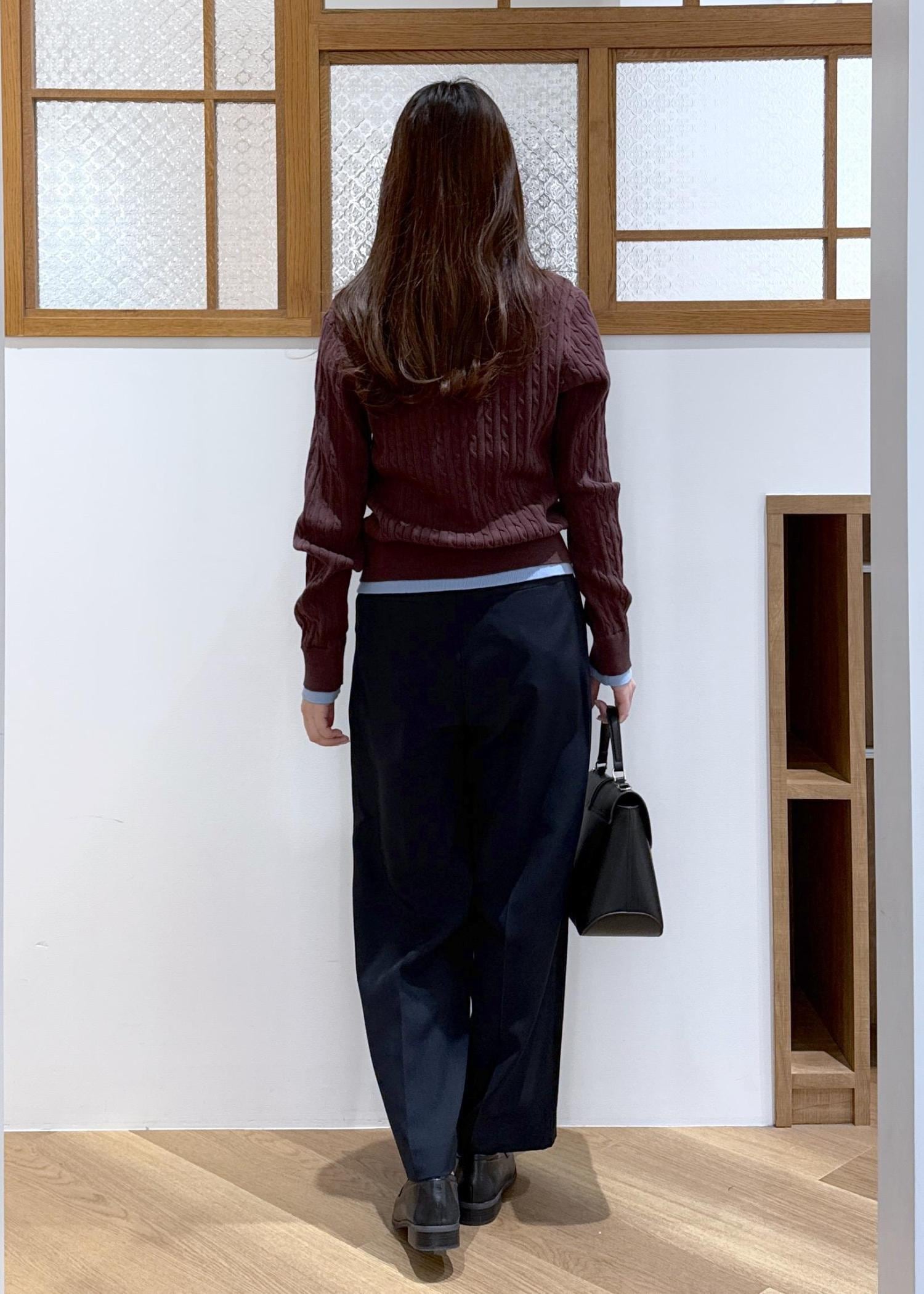ブルーのシャツをレイヤードしたようなポロニットを主役にきれいめなコーディネートを組みました。