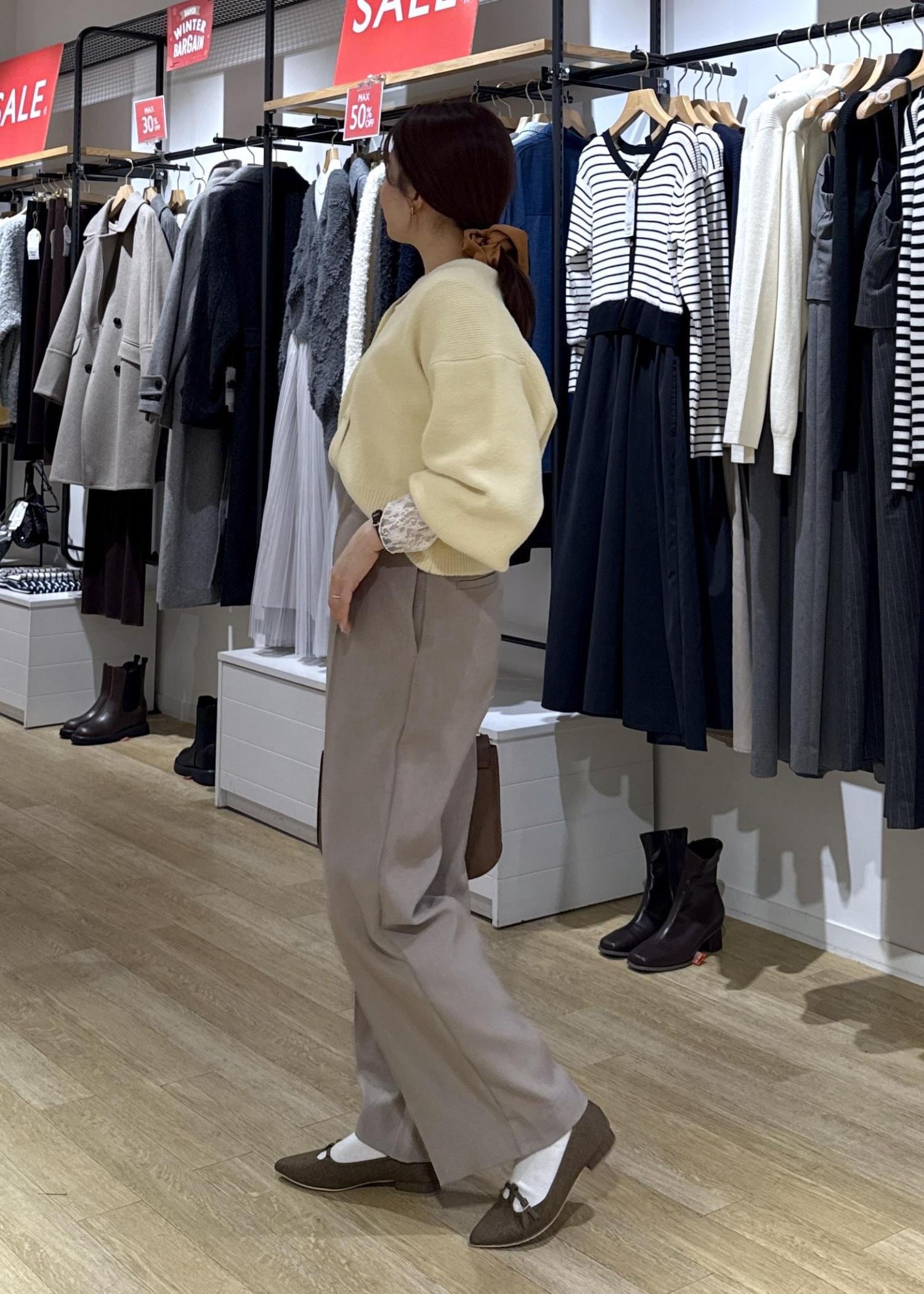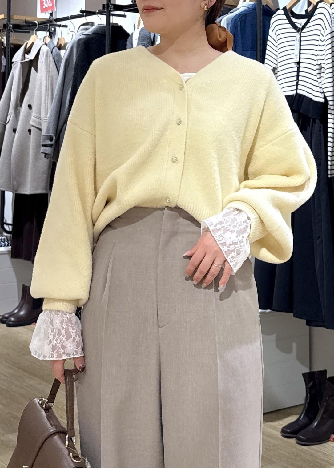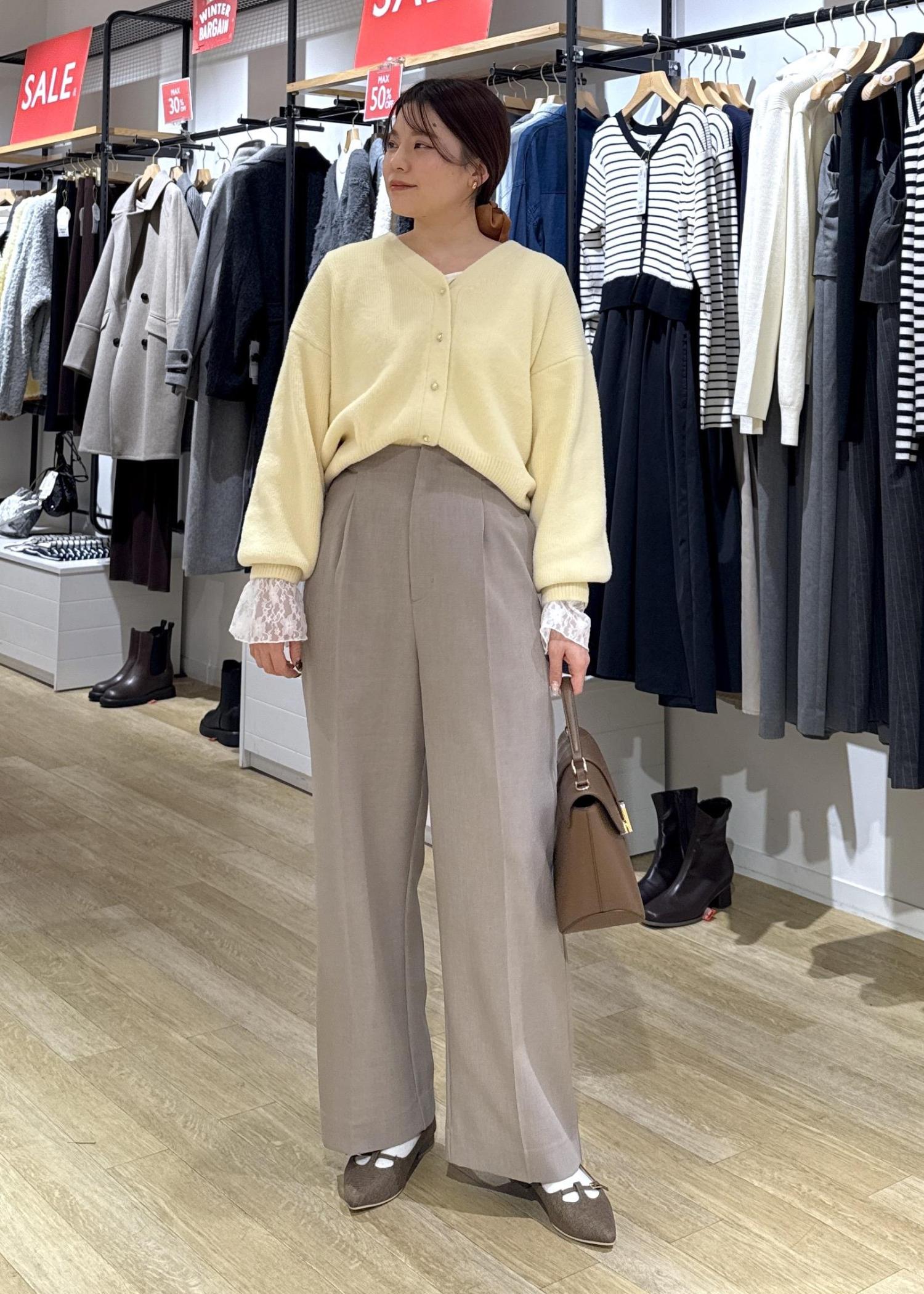 今年の春注目カラーのイエロー系のカーディガンを主役に