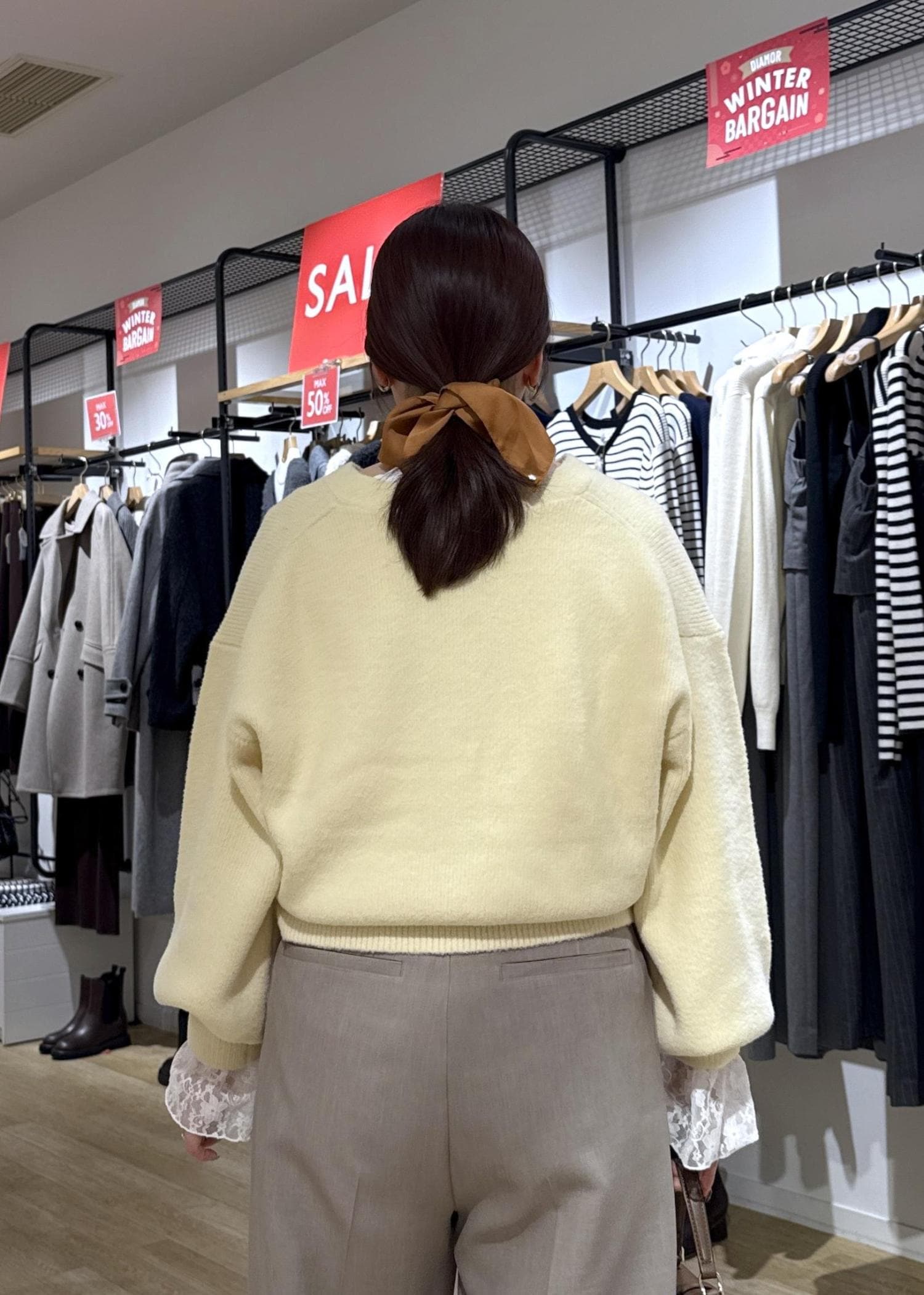 プルオーバーとしてもカーディガンとしても使えるデザインで、プルオーバーできた時とVネックが深すぎないので、インナーが見えないぐらいの開きです。 -
