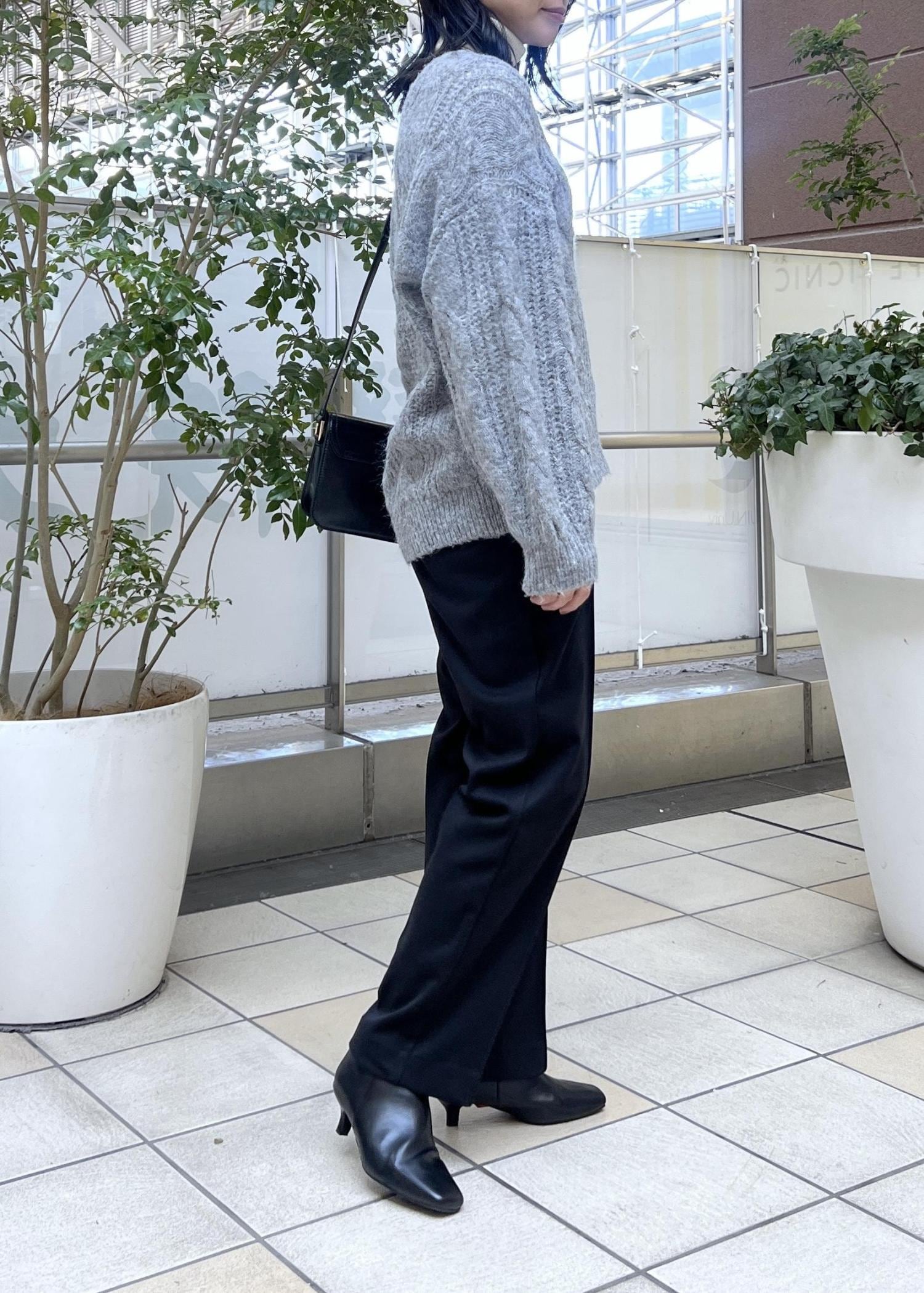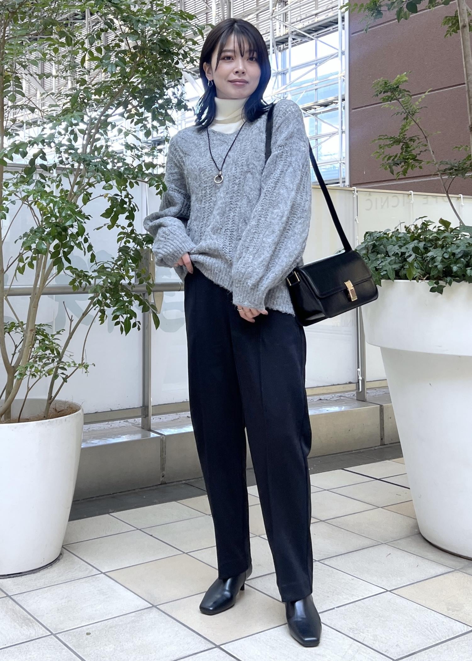 ゆったりしたシルエットのローゲージニットは、タートルネックをインして冬のきれいめカジュアルコーデに。