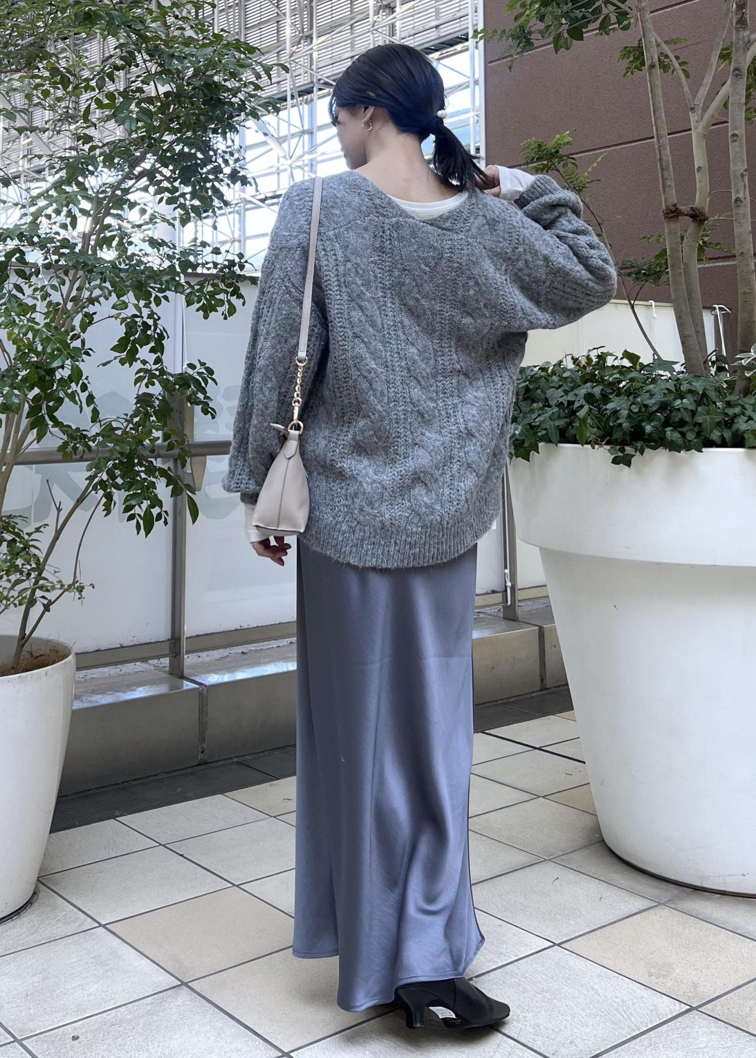 ざっくりしたローゲージニットは軽く柔らかい生地で、春まで着回しできるニットアイテム。