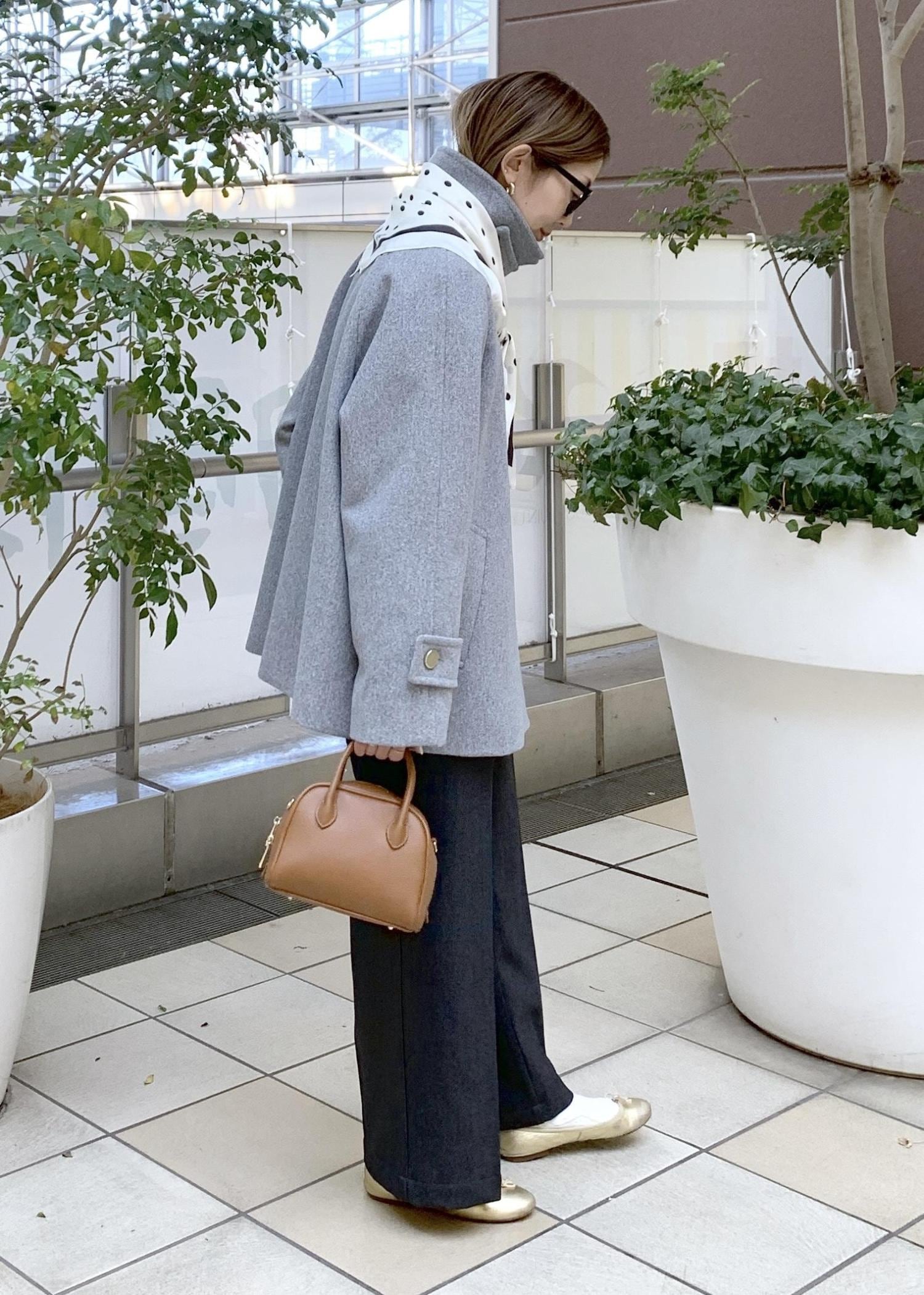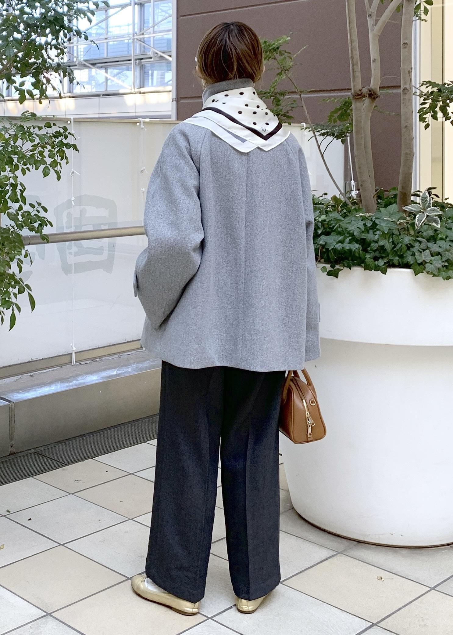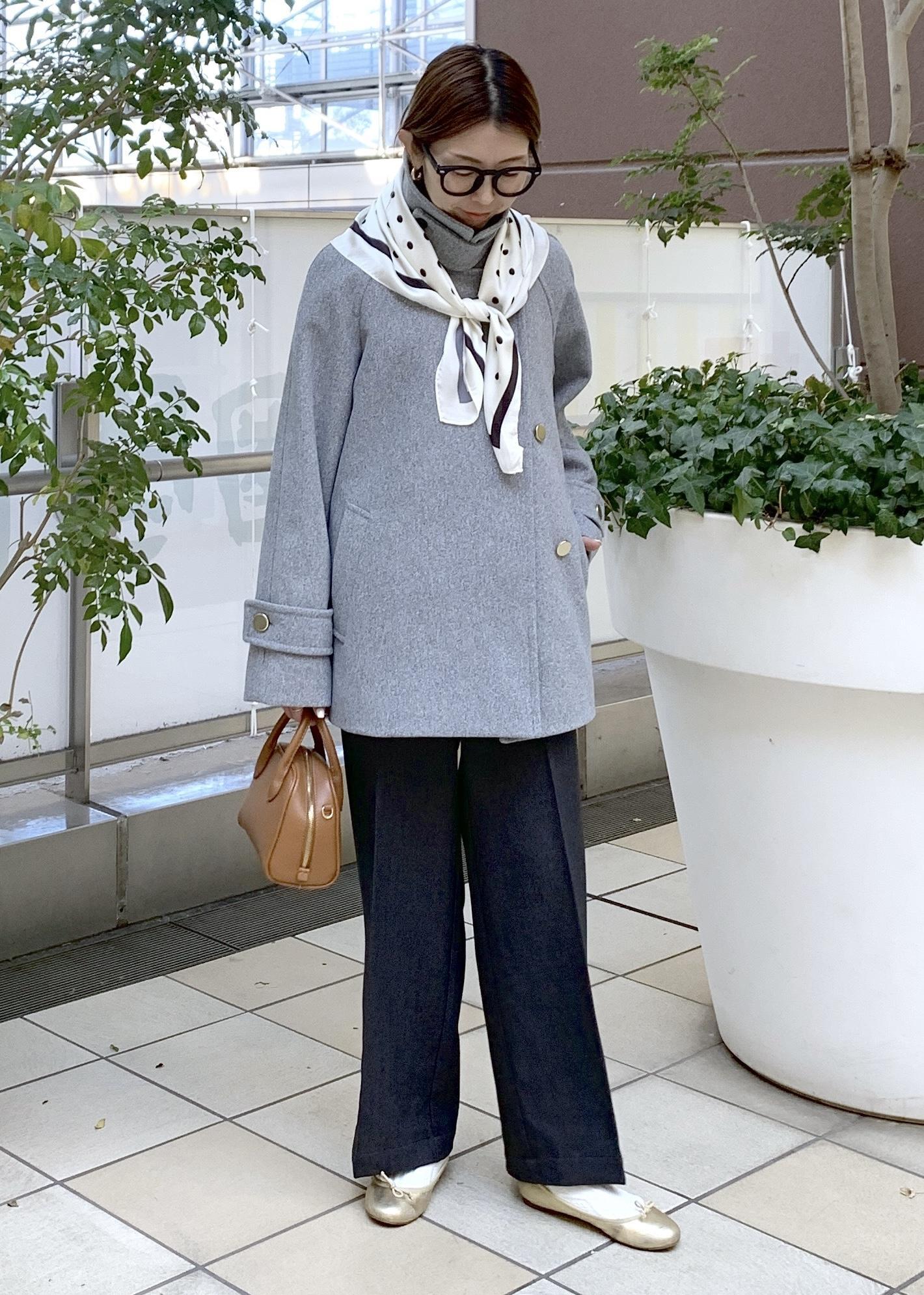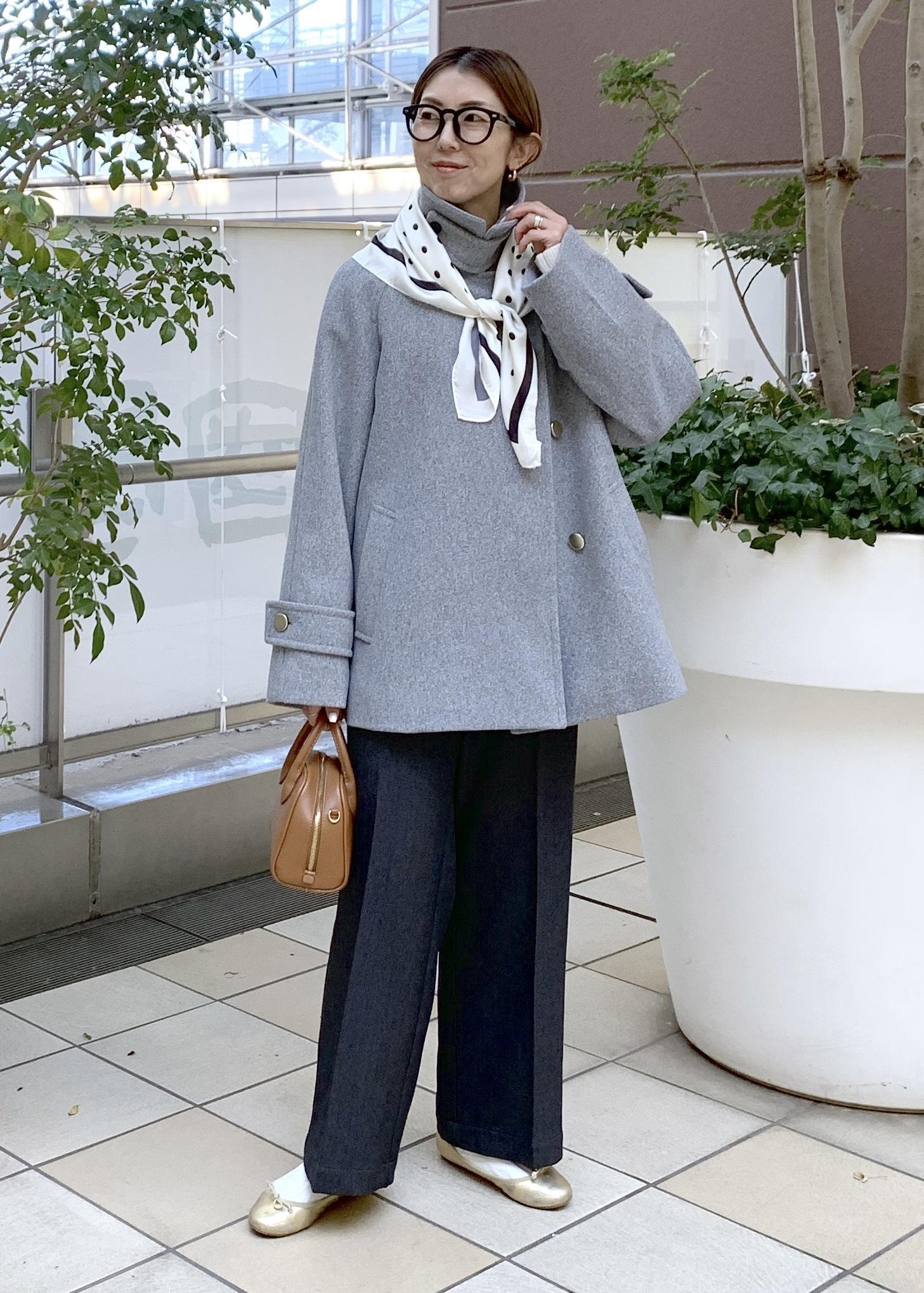 肩がけしたドットのスカーフがスタイリングのポイントです。