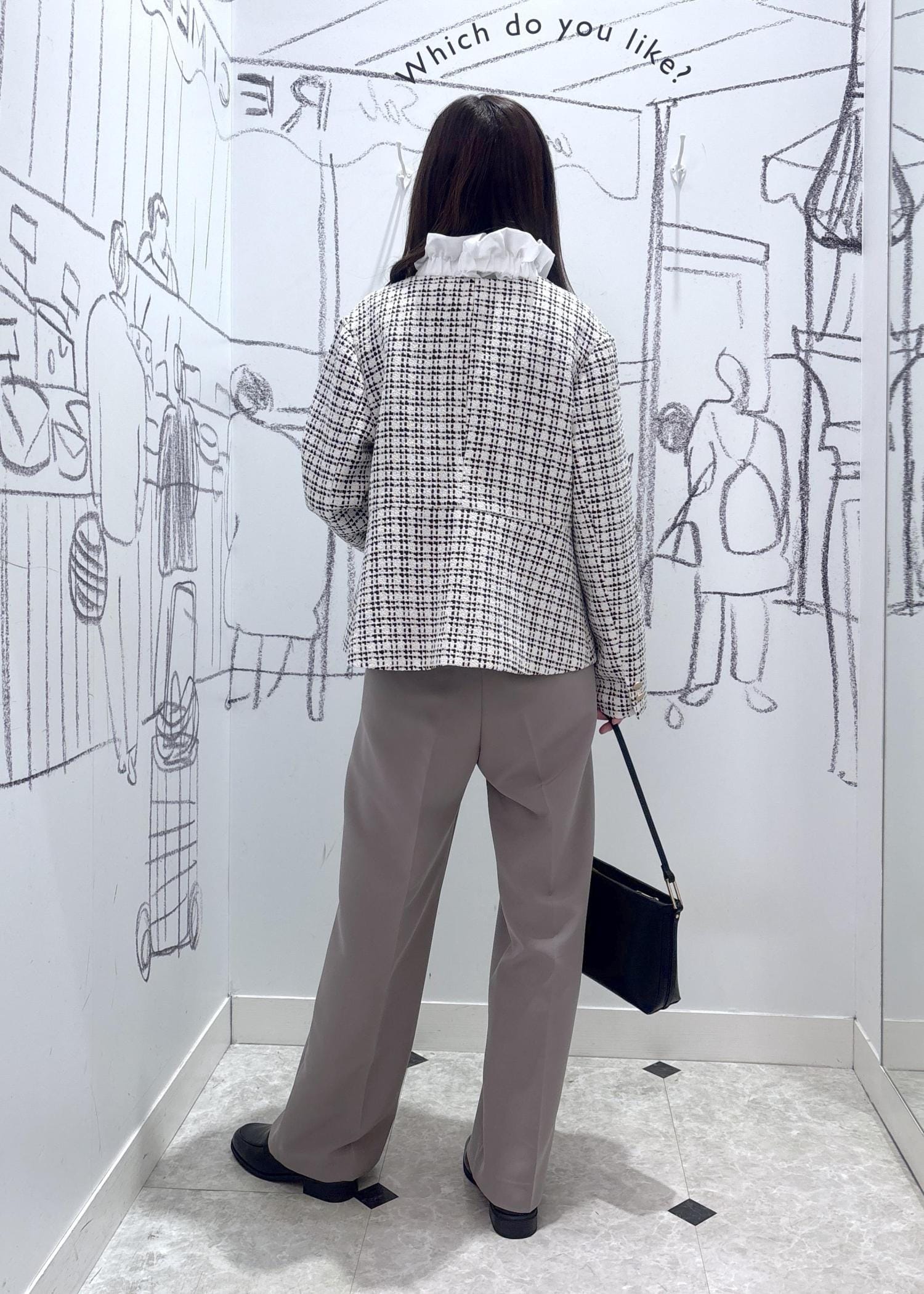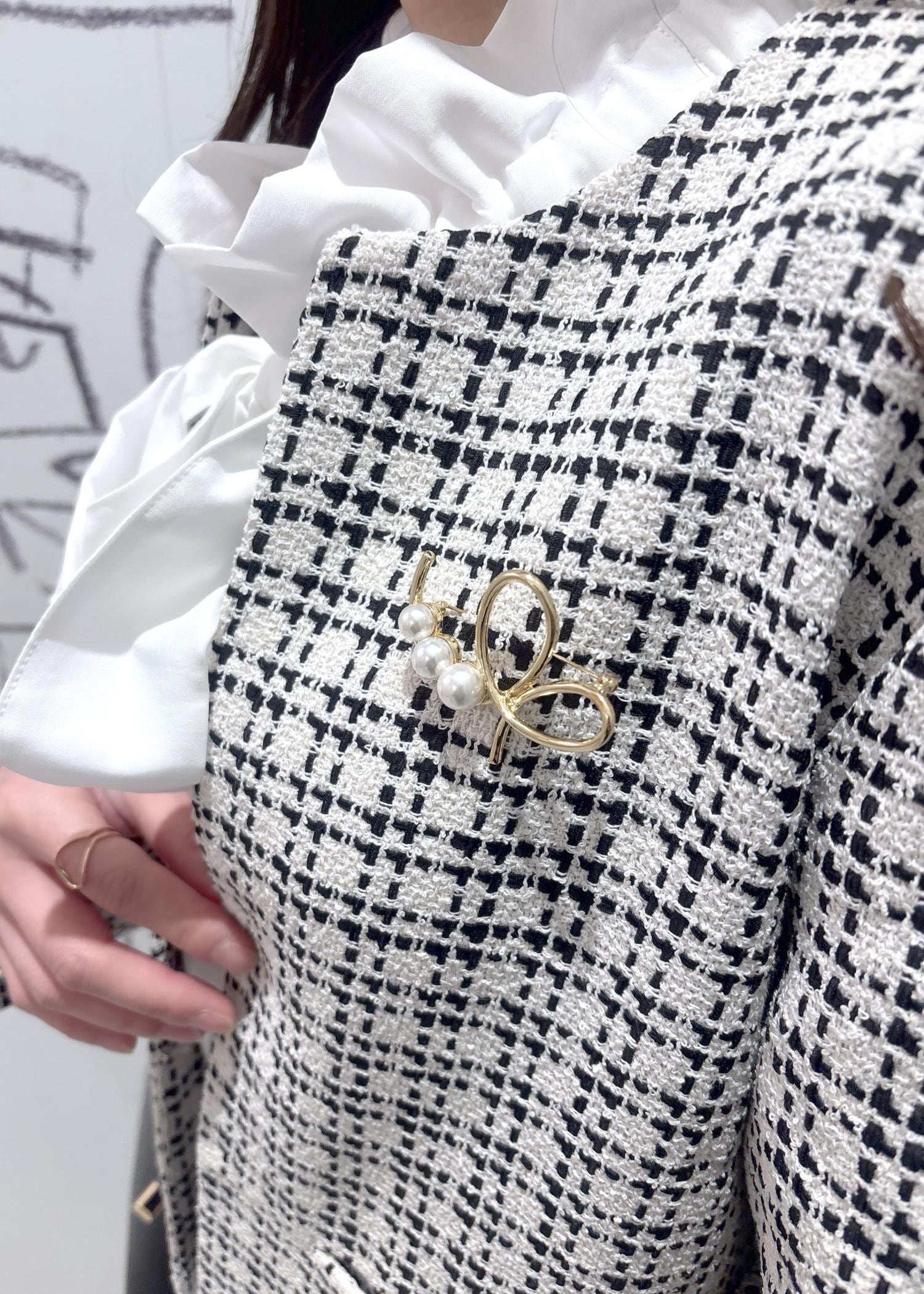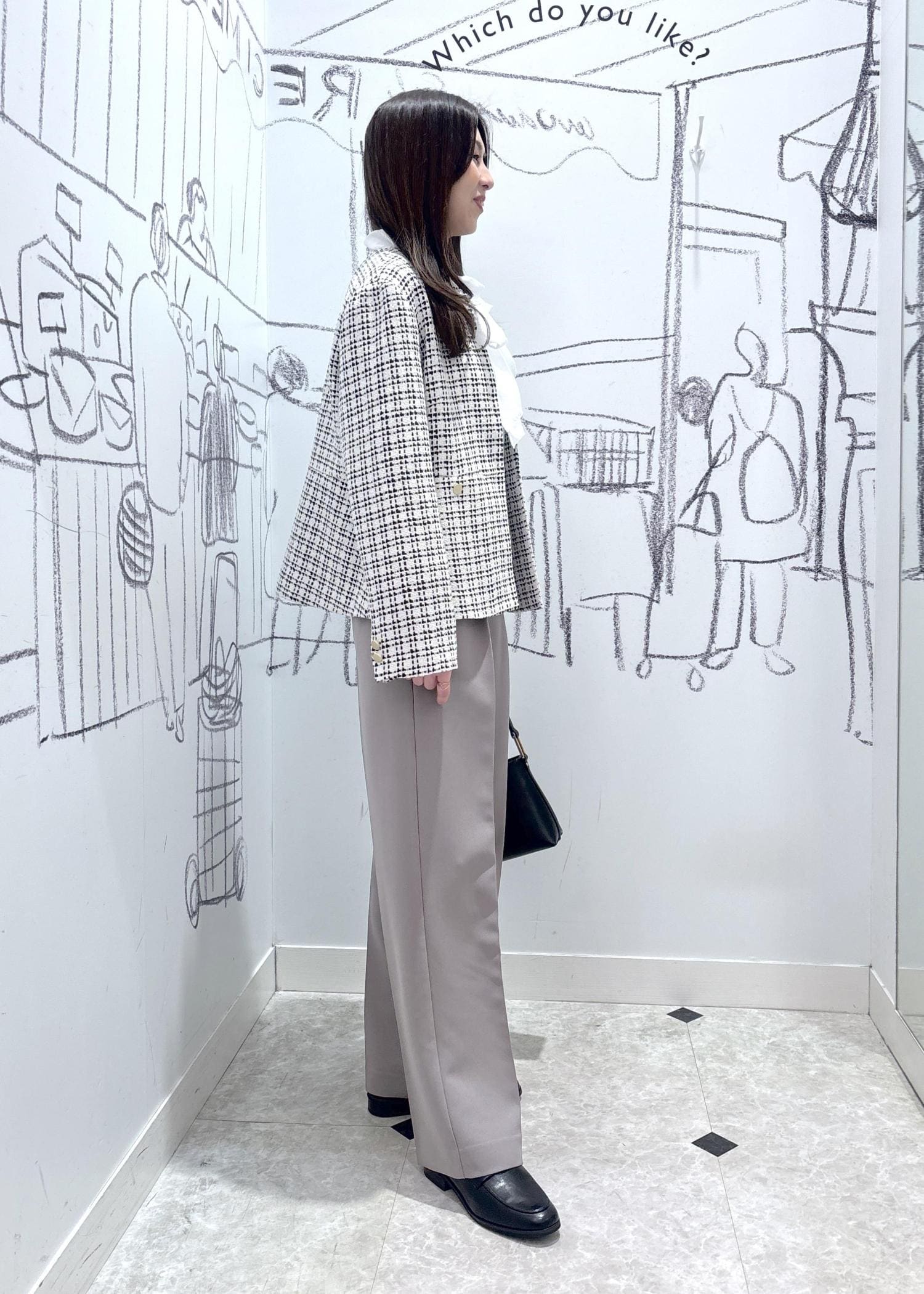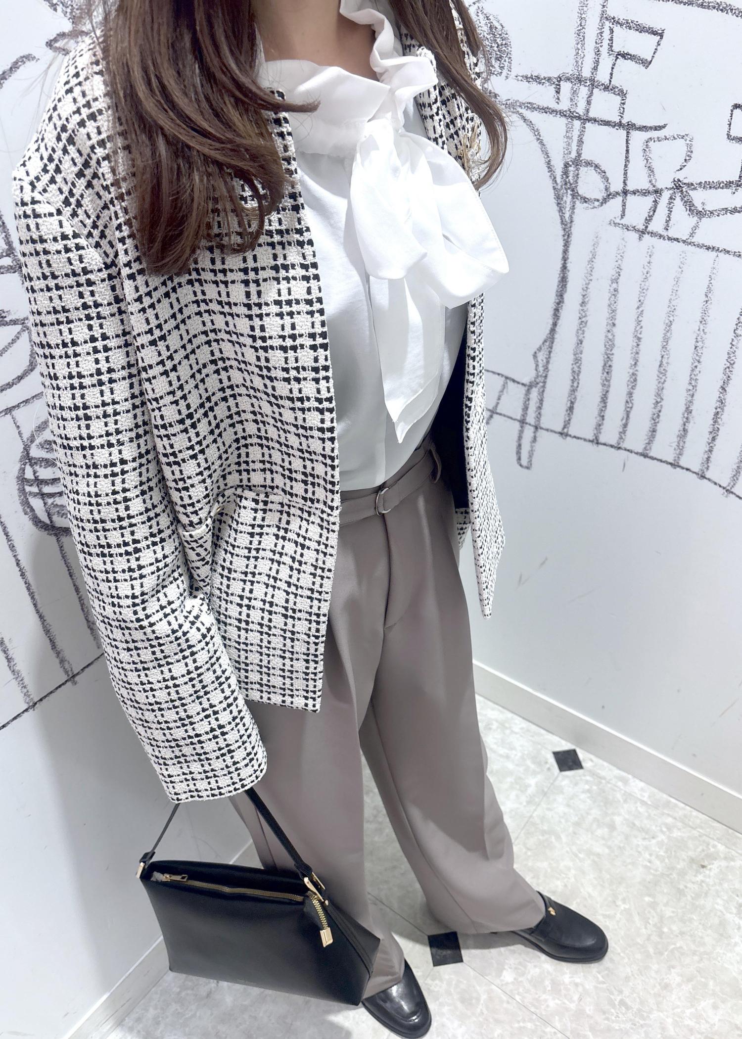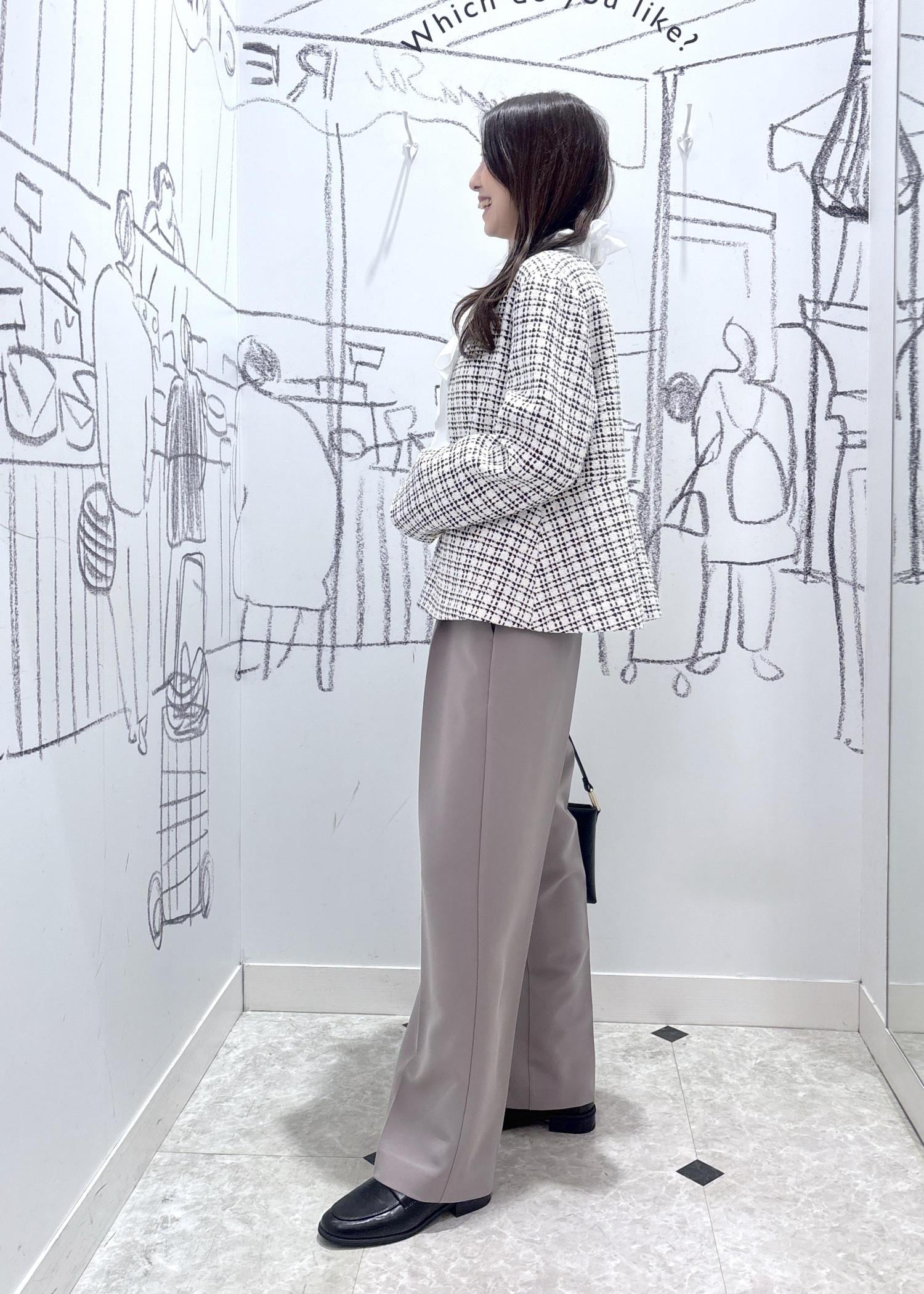様々なオケージョンにピッタリのツイードジャケットをワイドパンツと合わせたきれいめコーディネートです。