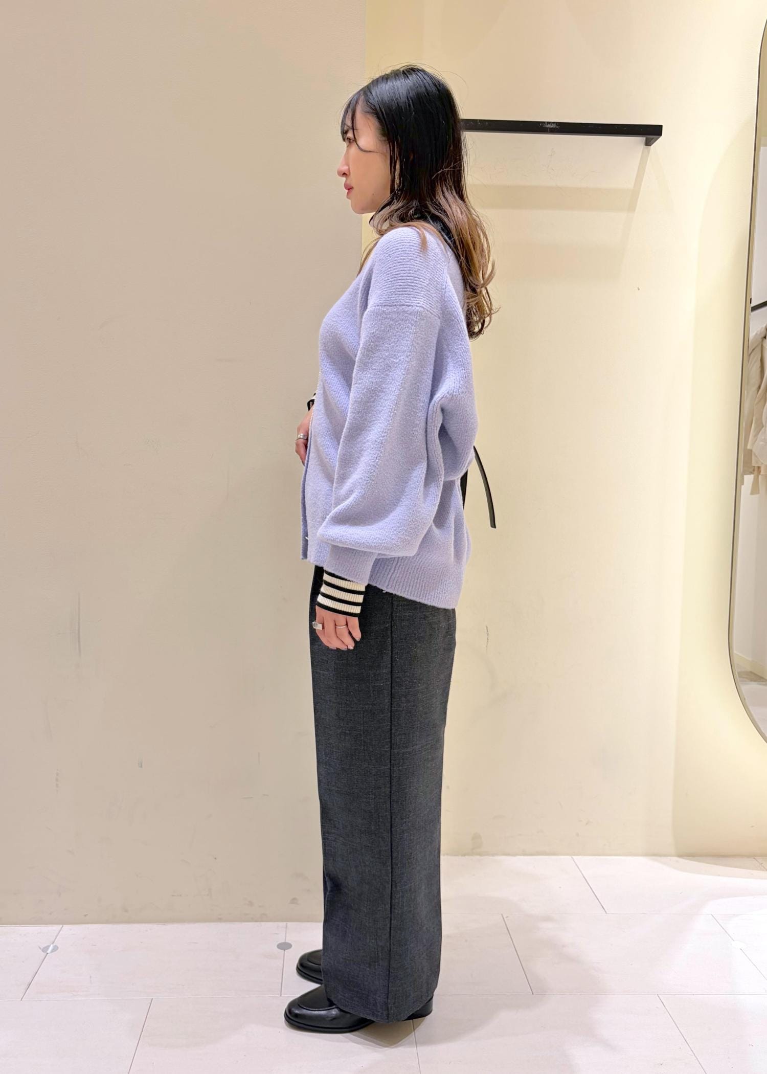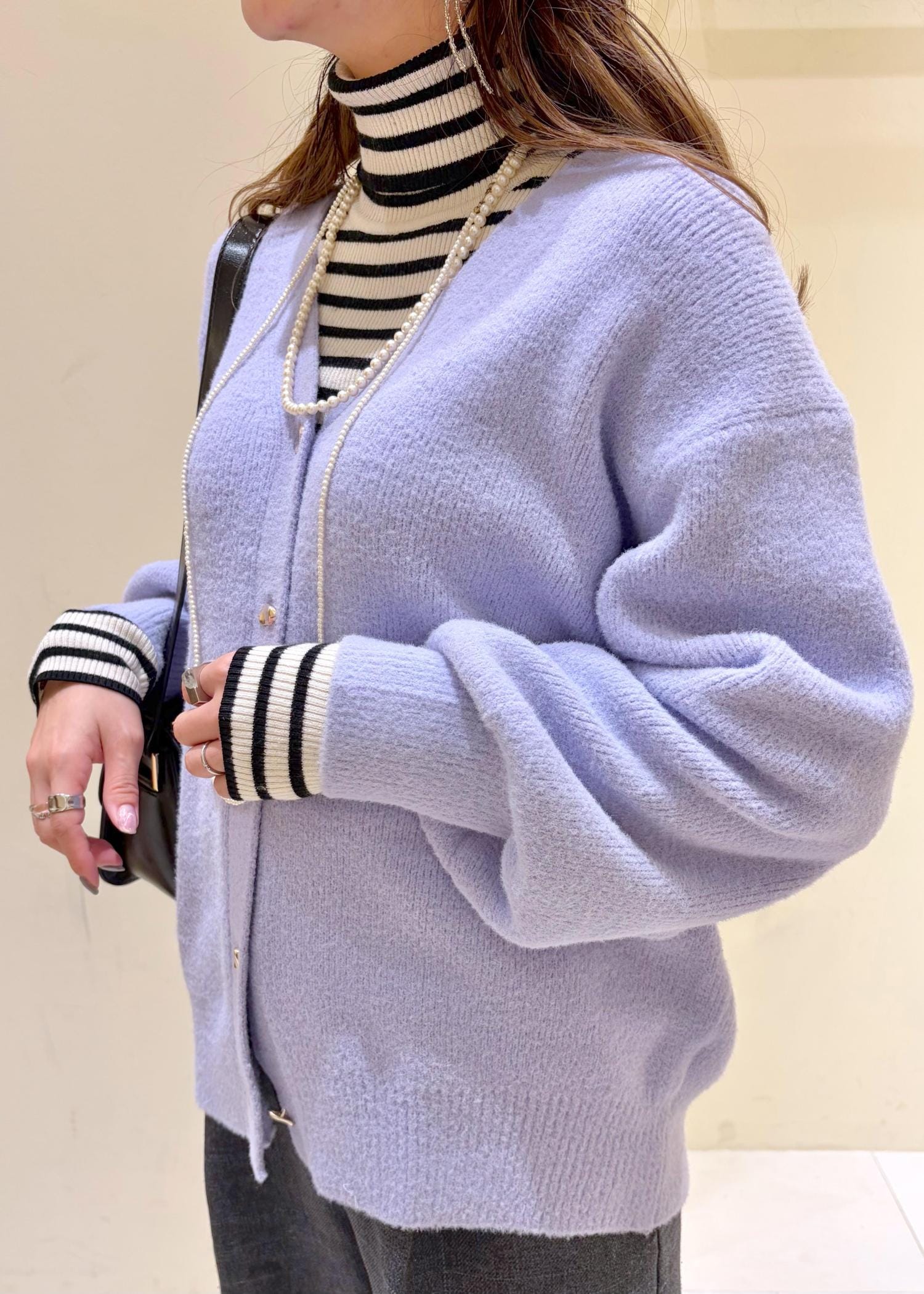 もちふわのニットカーディガンコーデ。