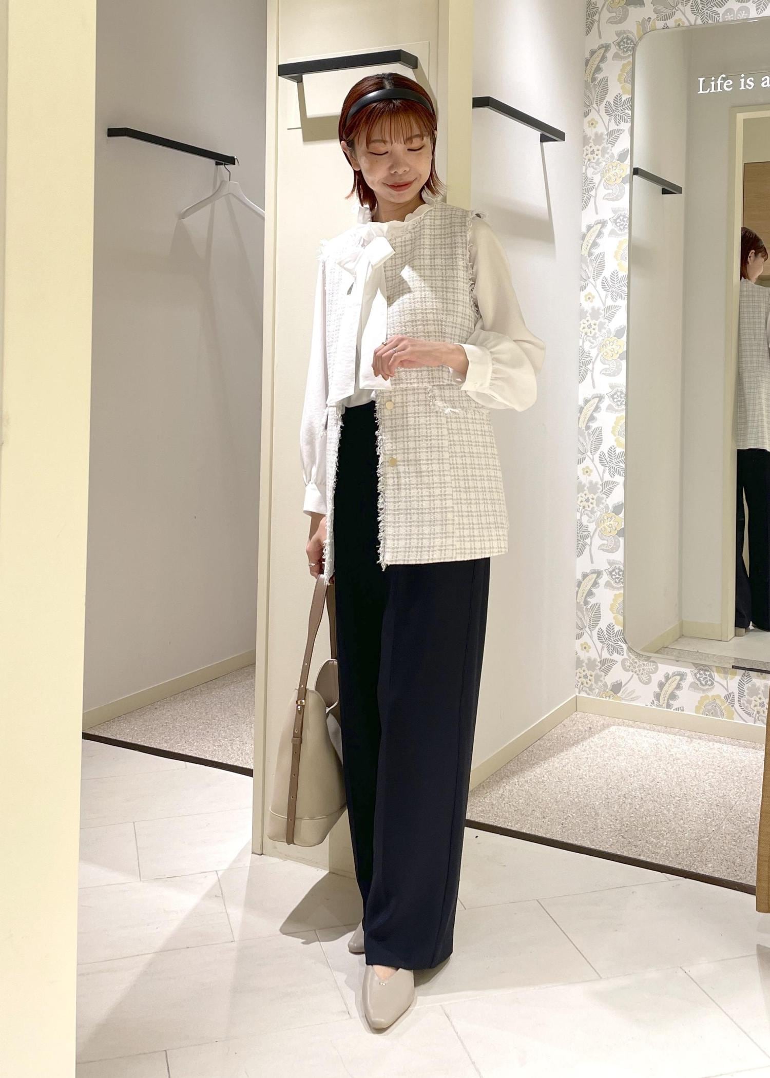 今回はフリルブラウス+ネイビーのパンツを合わせて、セレモニーにもオススメのキレイめコーディネートに◎
