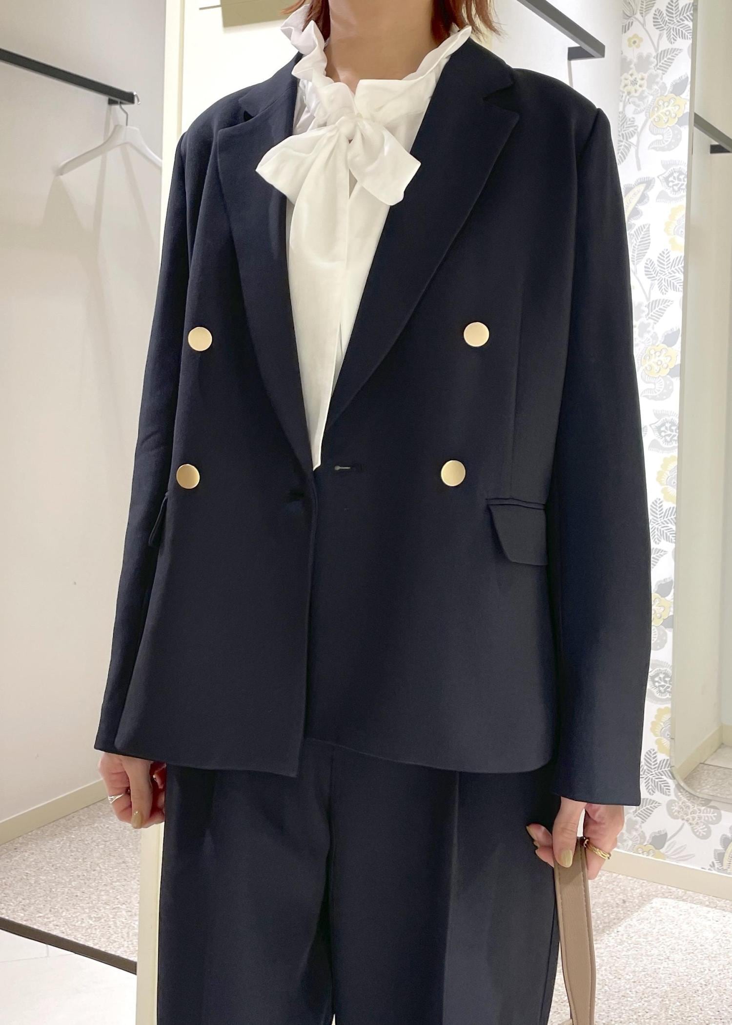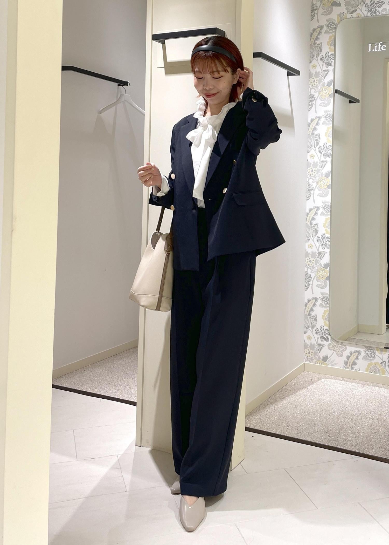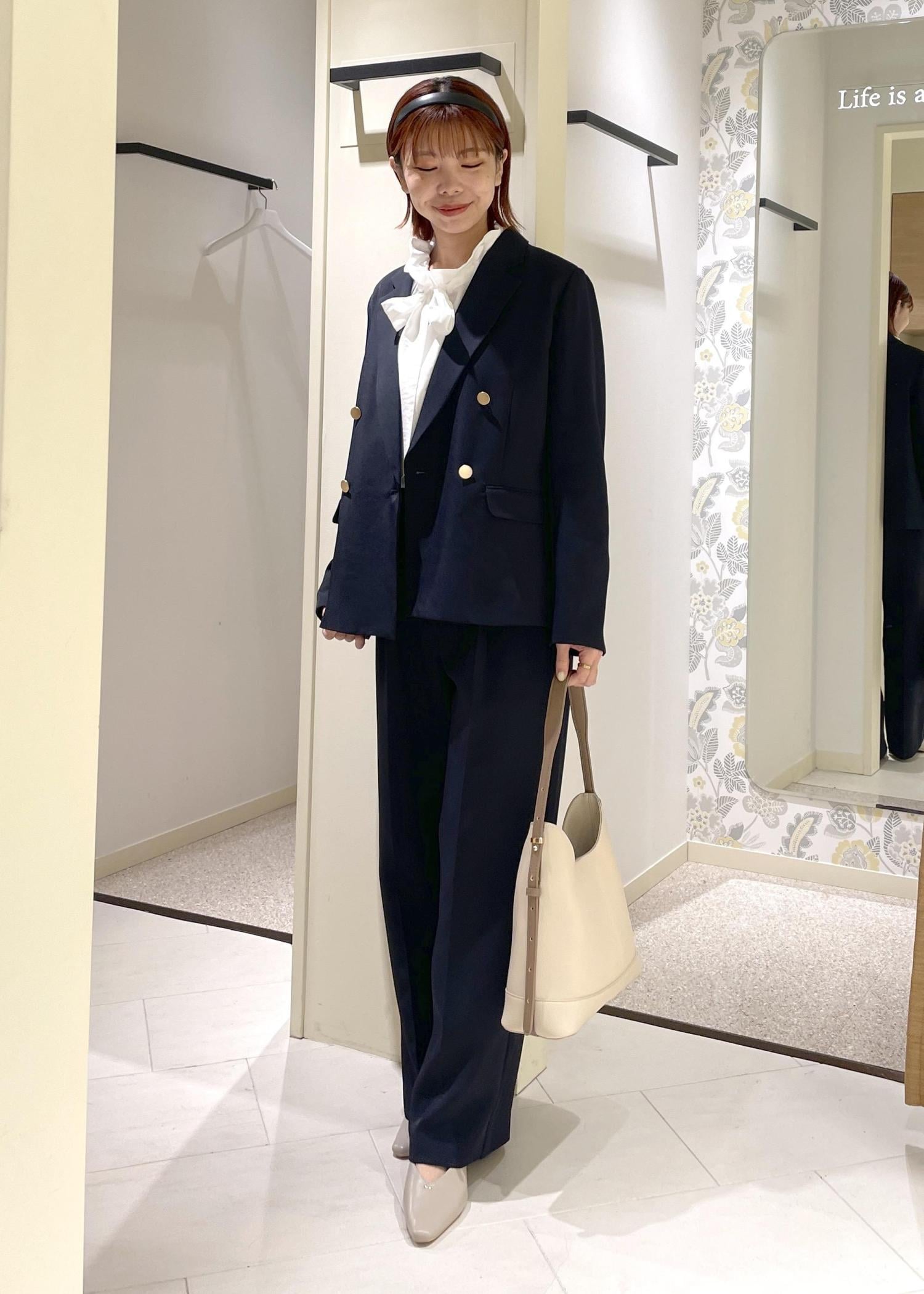 カチッと見えがちなネイビーもフリルリボンブラウスを合わせて頂くと柔らかさと女性らしい印象で着て頂けます。