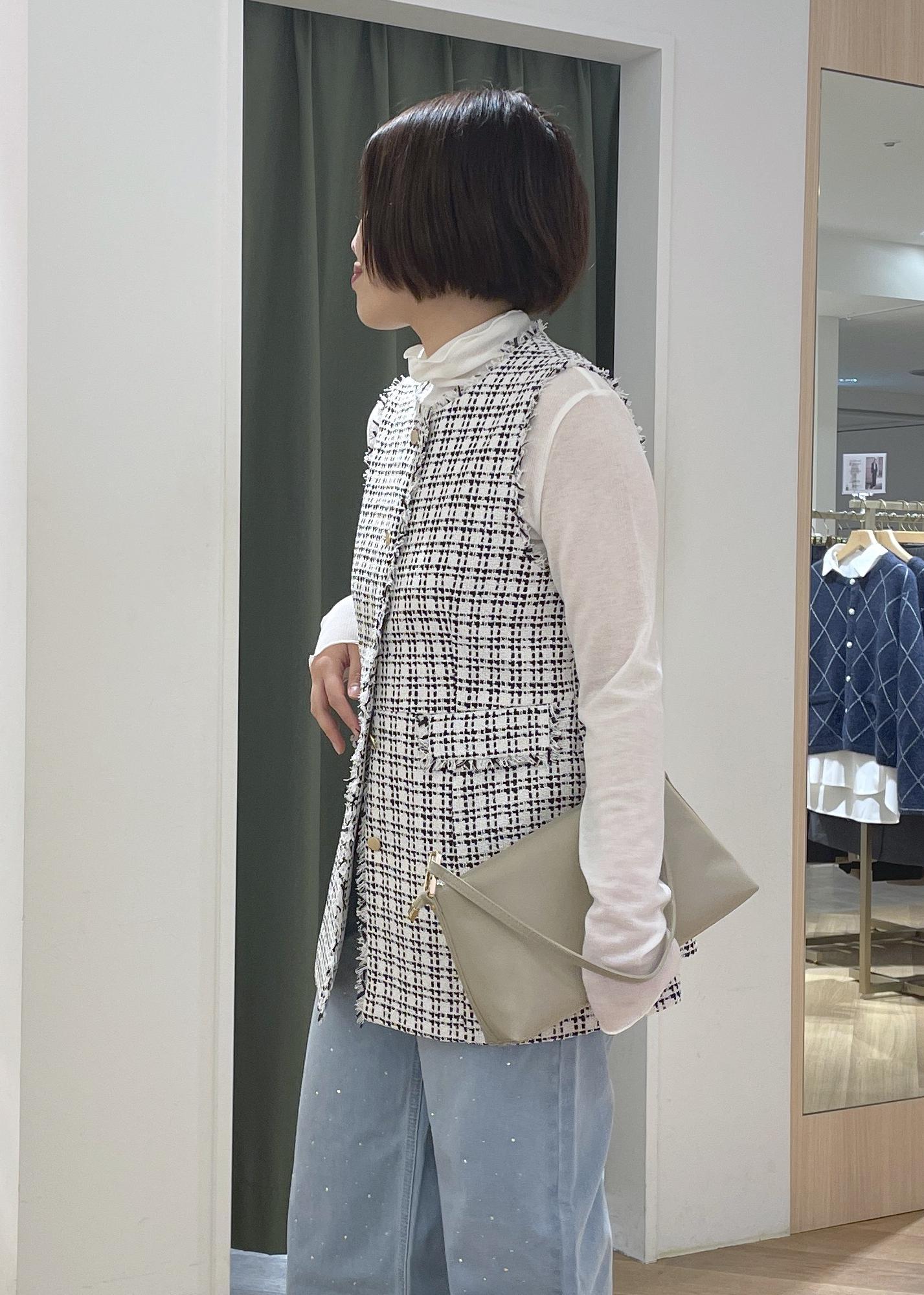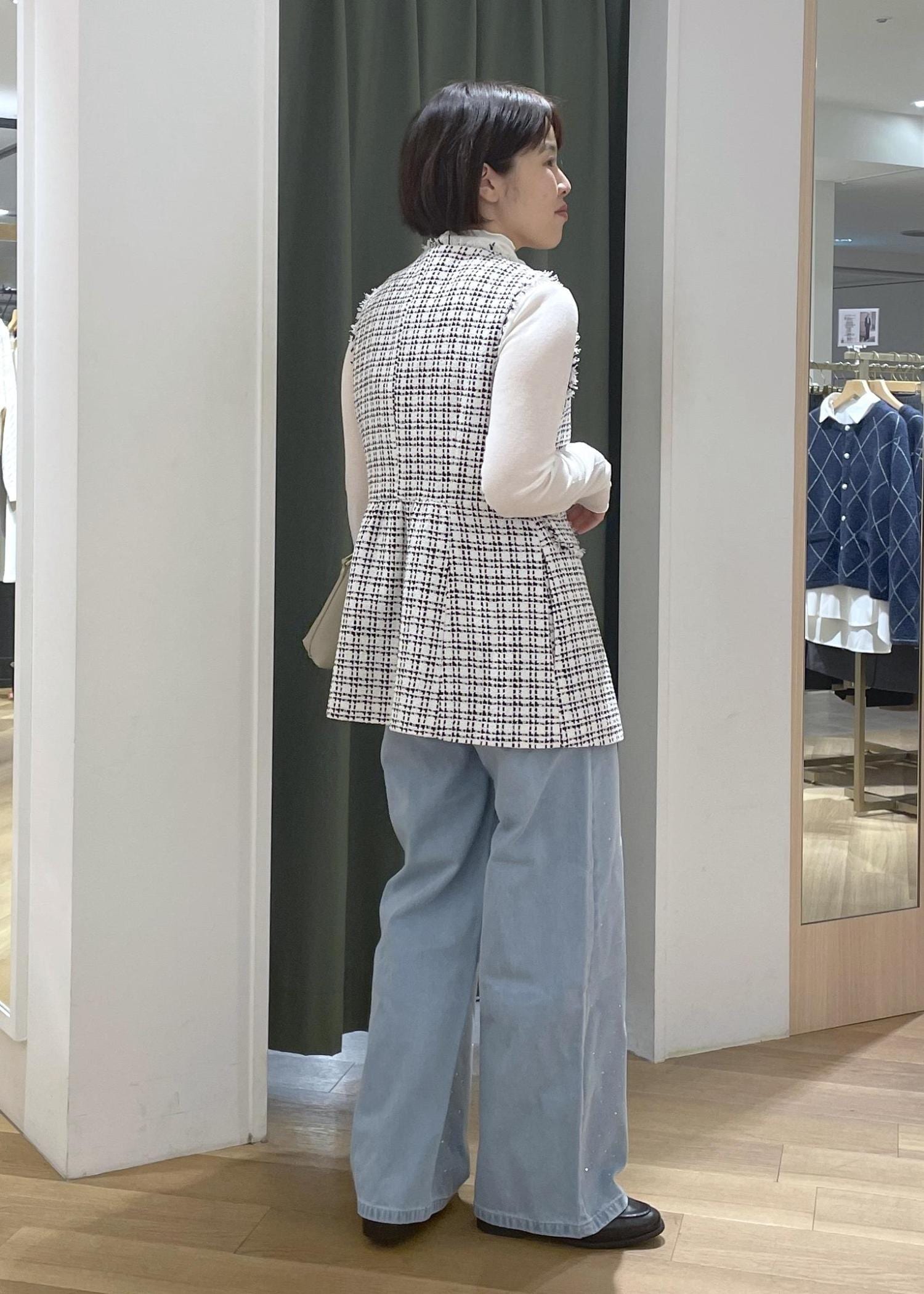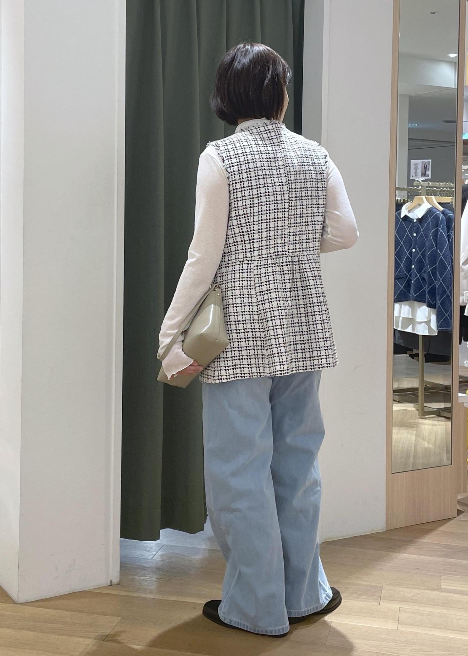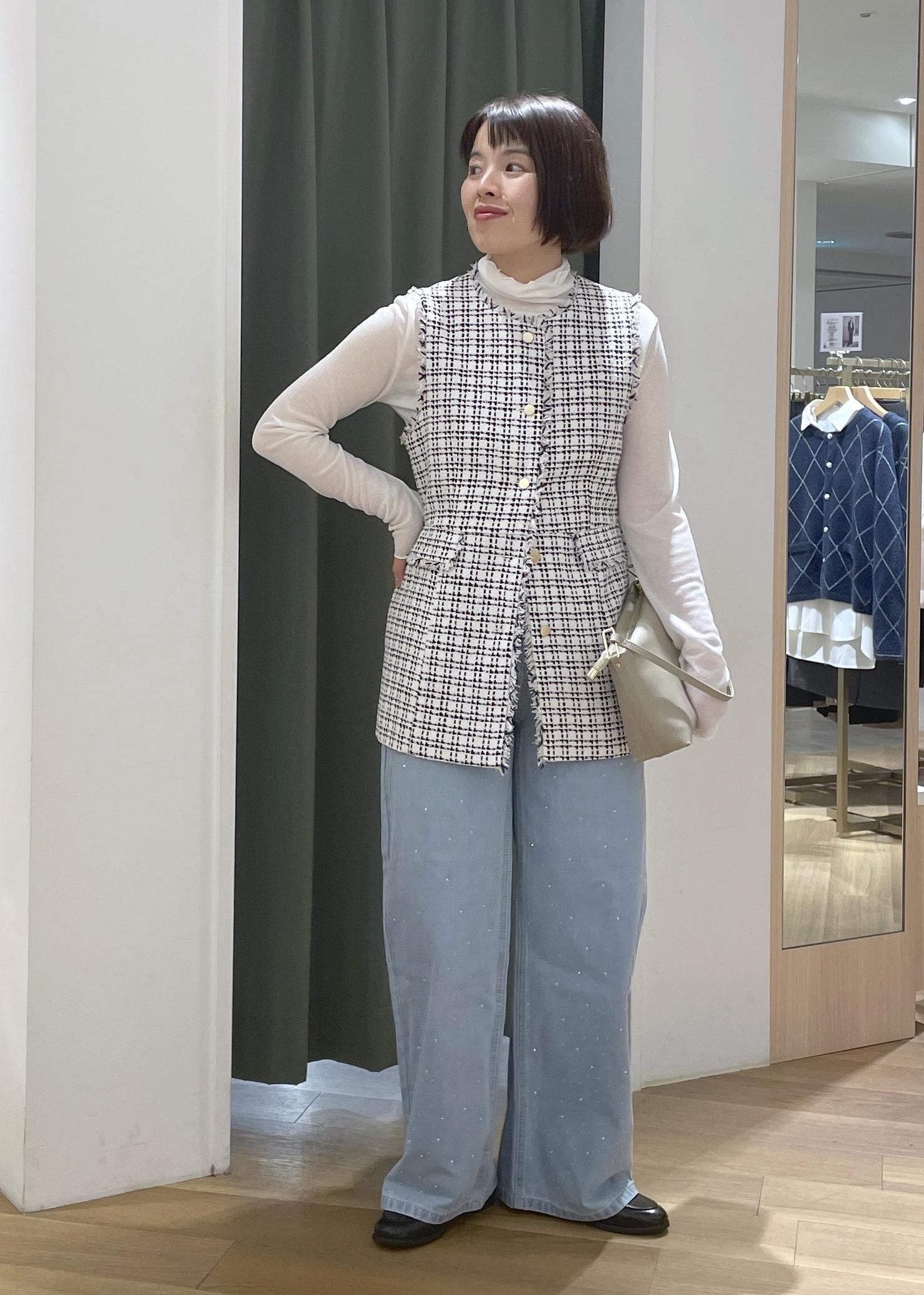セレモニーなどのイメージが強いツイードジレに、サックスブルーのデニムを合わせた、大人カジュアルコーデです!