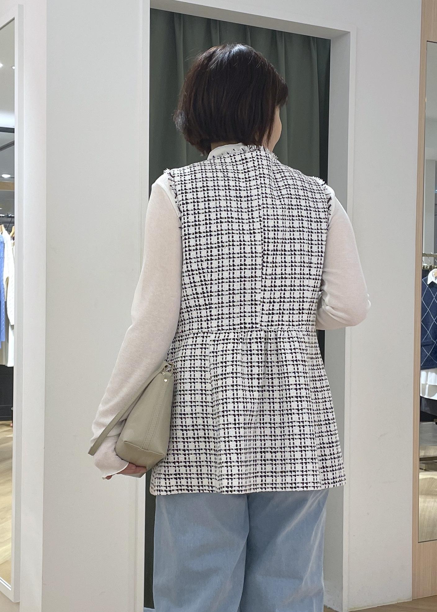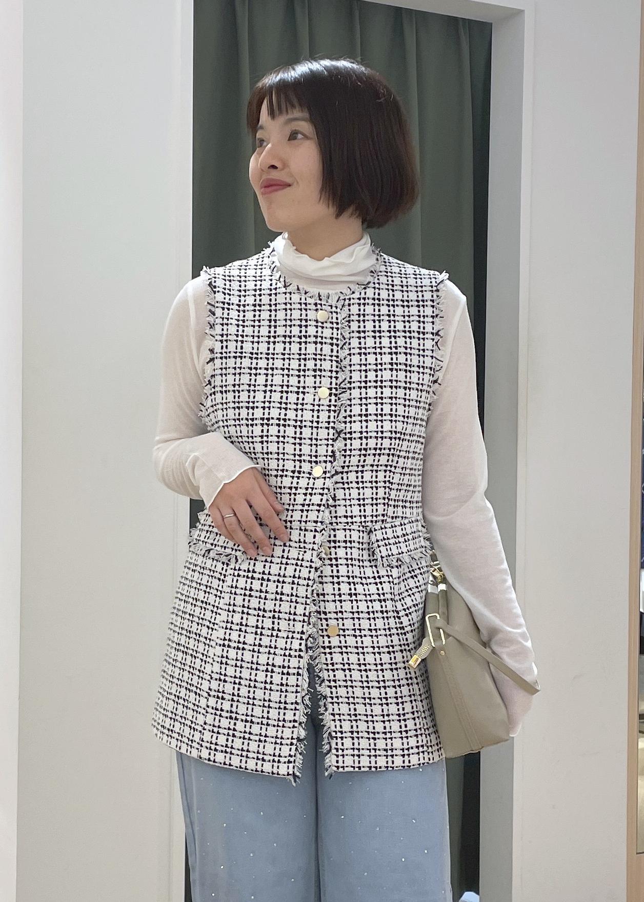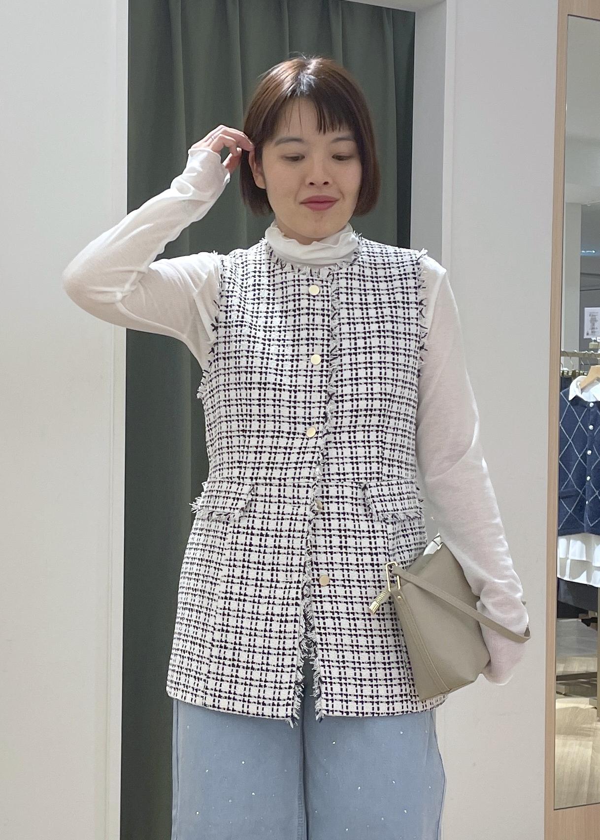 ROPÉ PICNIC【WEB限定カラー】ツイード金ボタンジレベスト/セレモニー対応・リンクコーデブラック系 / F¥8,998レビュー軽く柔らかくツイード素材のジレで、羽織り心地も良いです。裾がペプラムシルエットになっているので腰回りなどをカバーしてくれます。着丈はヒップが隠れるくらいの長さで、身頃は程良くゆとりもあり、薄めのニットもインナーに合わせることができます。