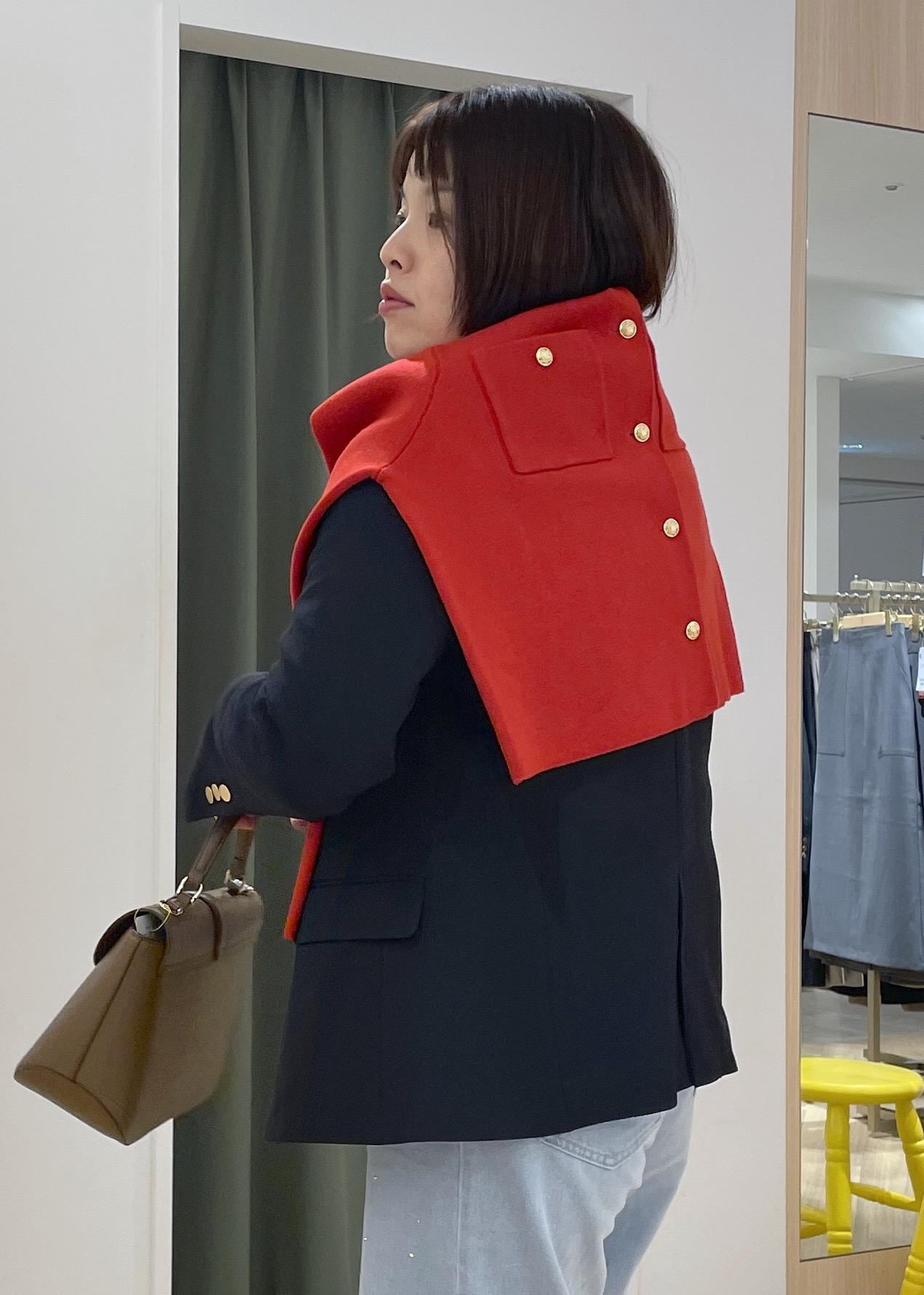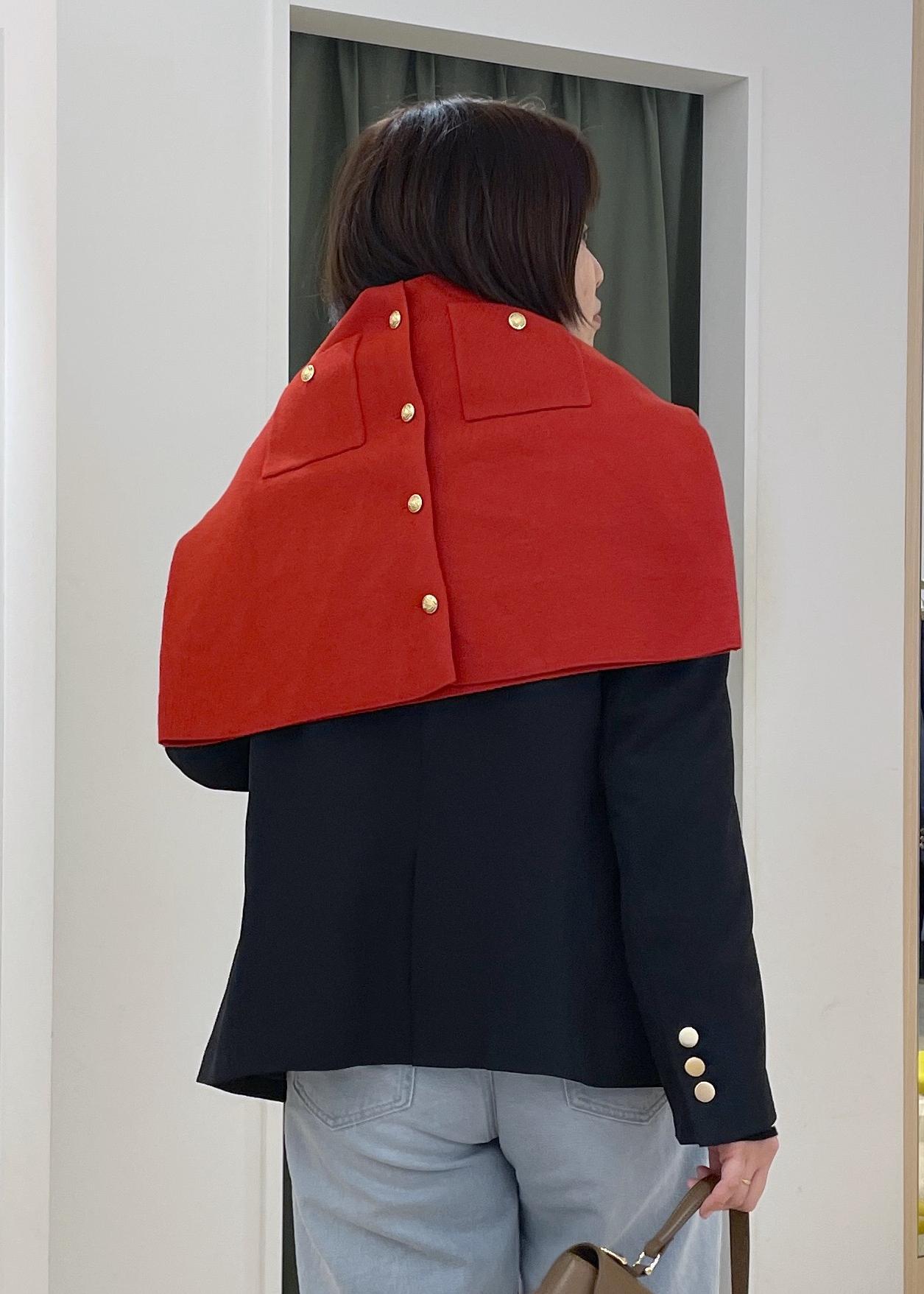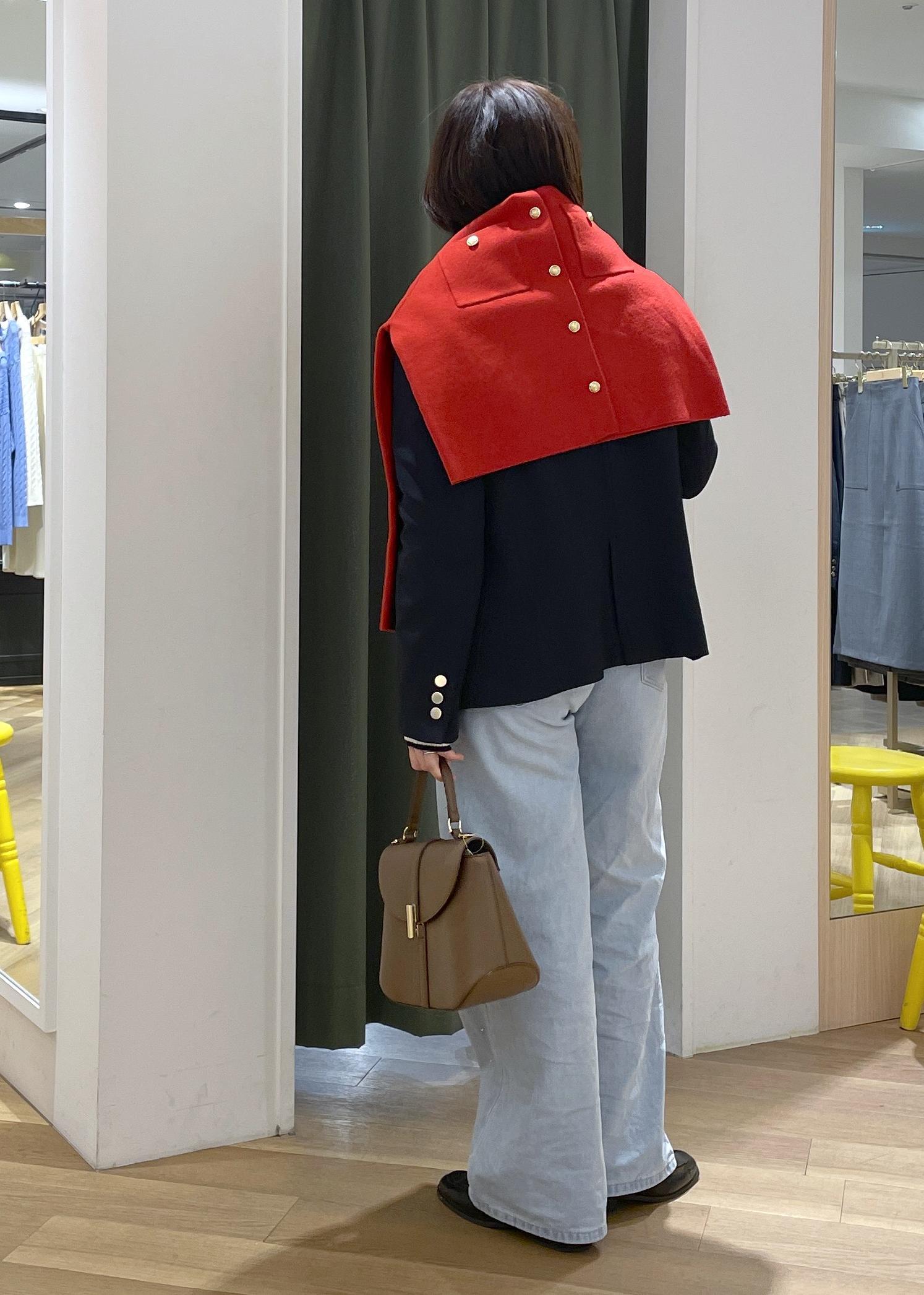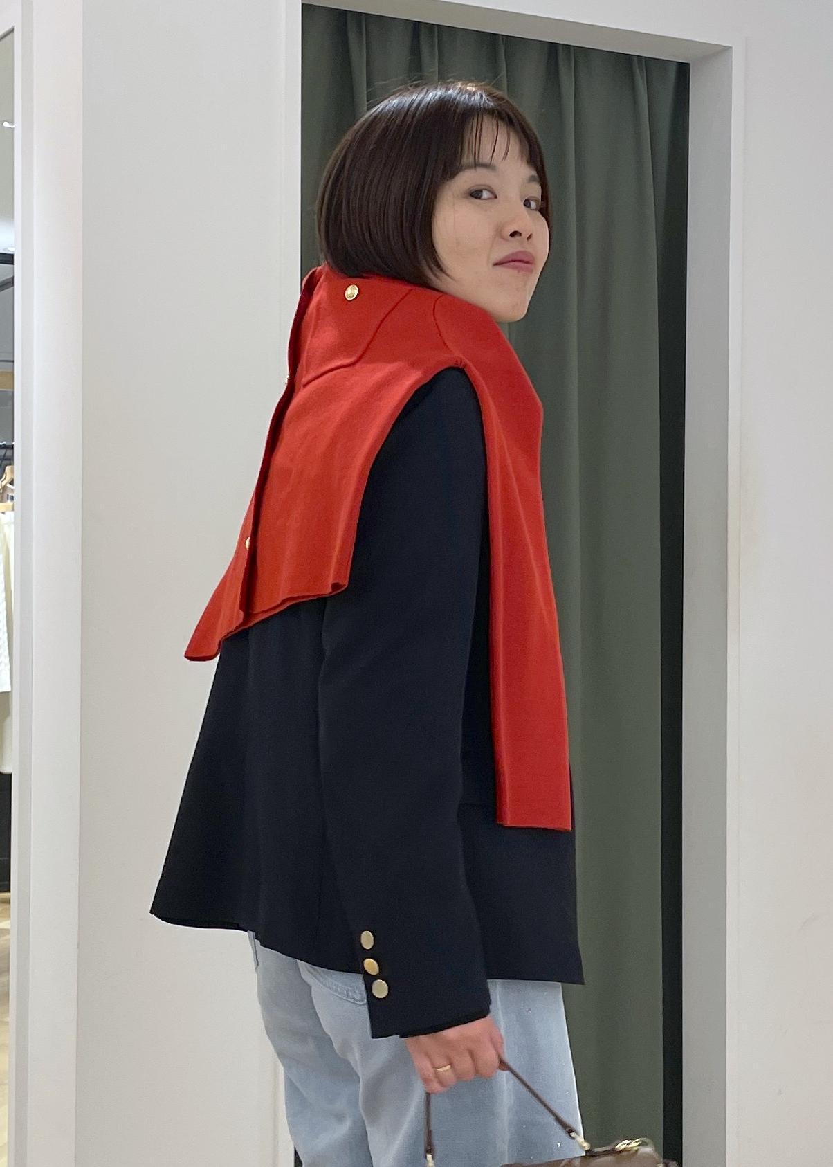ジャケットの上から赤のニットカーディガンを巻いて、コーデのポイントカラーに◎