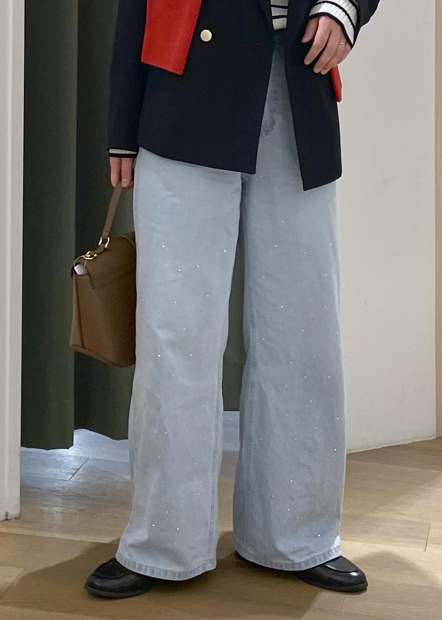 2BUY10%OFFROPÉ PICNICキラキラビジューデニムブルー / 40¥5,244レビュービジュー使いがいつものデニムスタイルをアップデートしてくれる、主役になるデニムです。細かなビジューなので、そこまで派手過ぎずコーディネートにも取り入れやすいです。シルエットは脚のラインを拾わないワイドシルエットです。少しルーズに履きたかったので、40サイズを着用しています。ウエストや腰回りはゆとりがあり、着丈はフラットシューズだと少し地面に擦りそうな長さです。