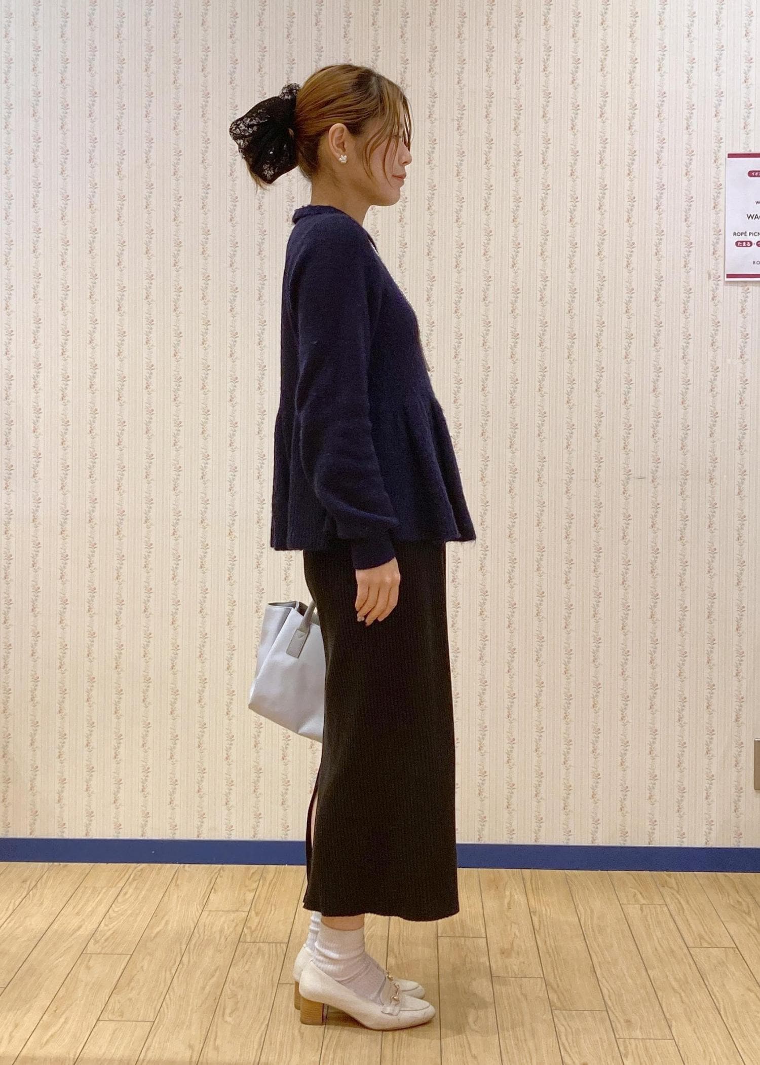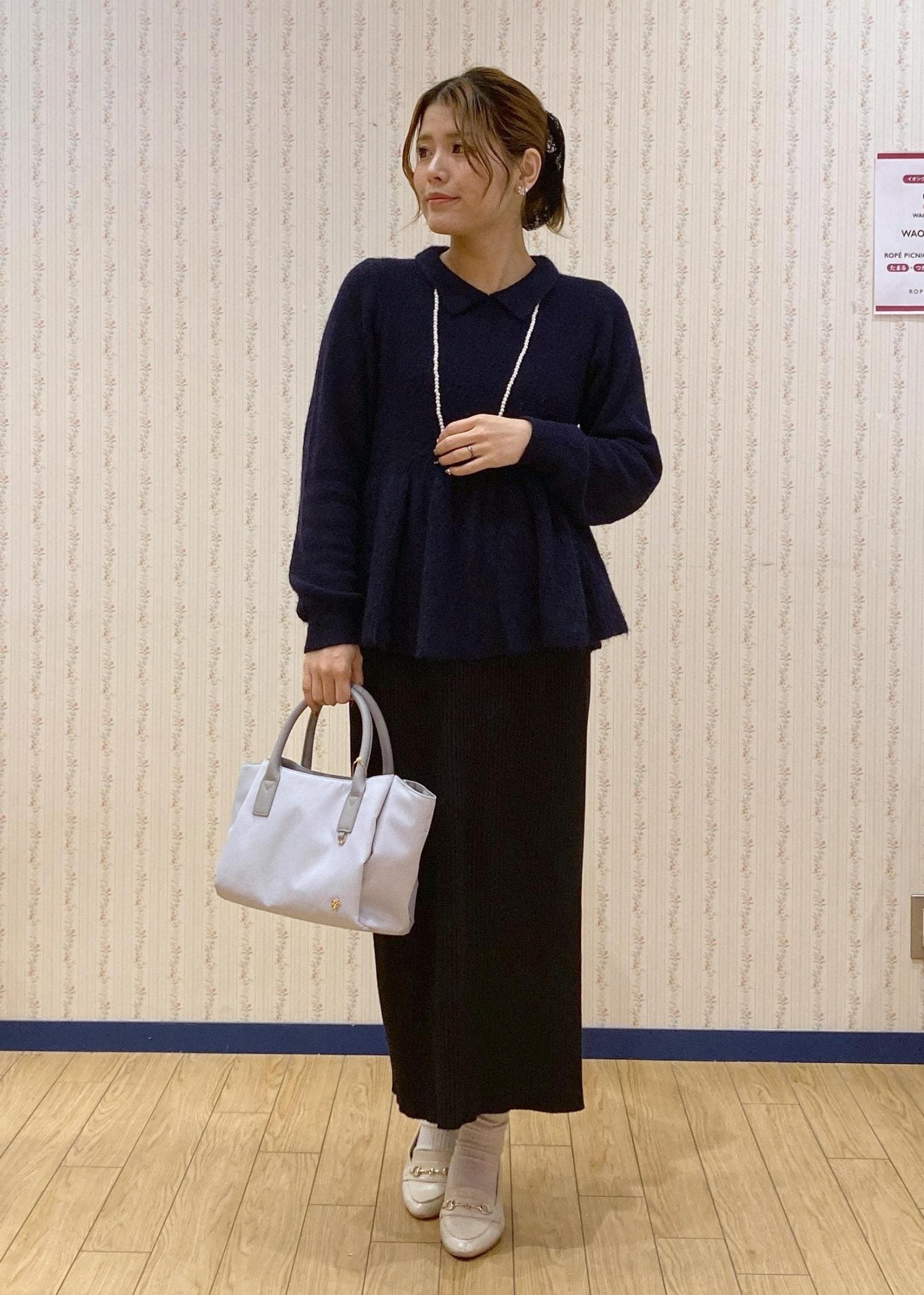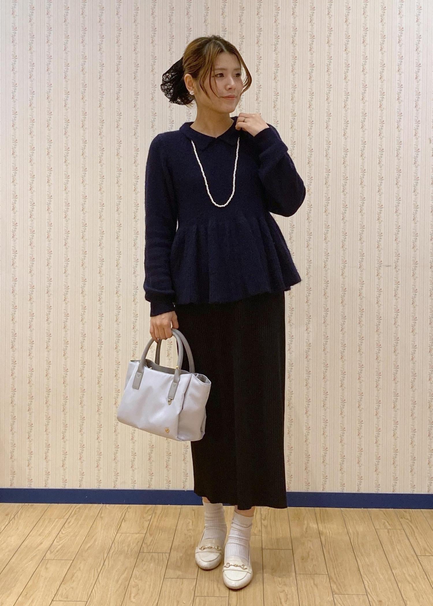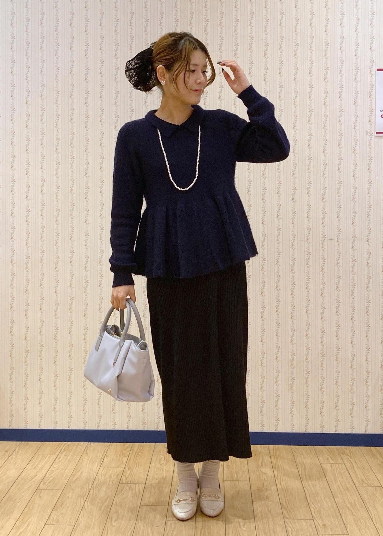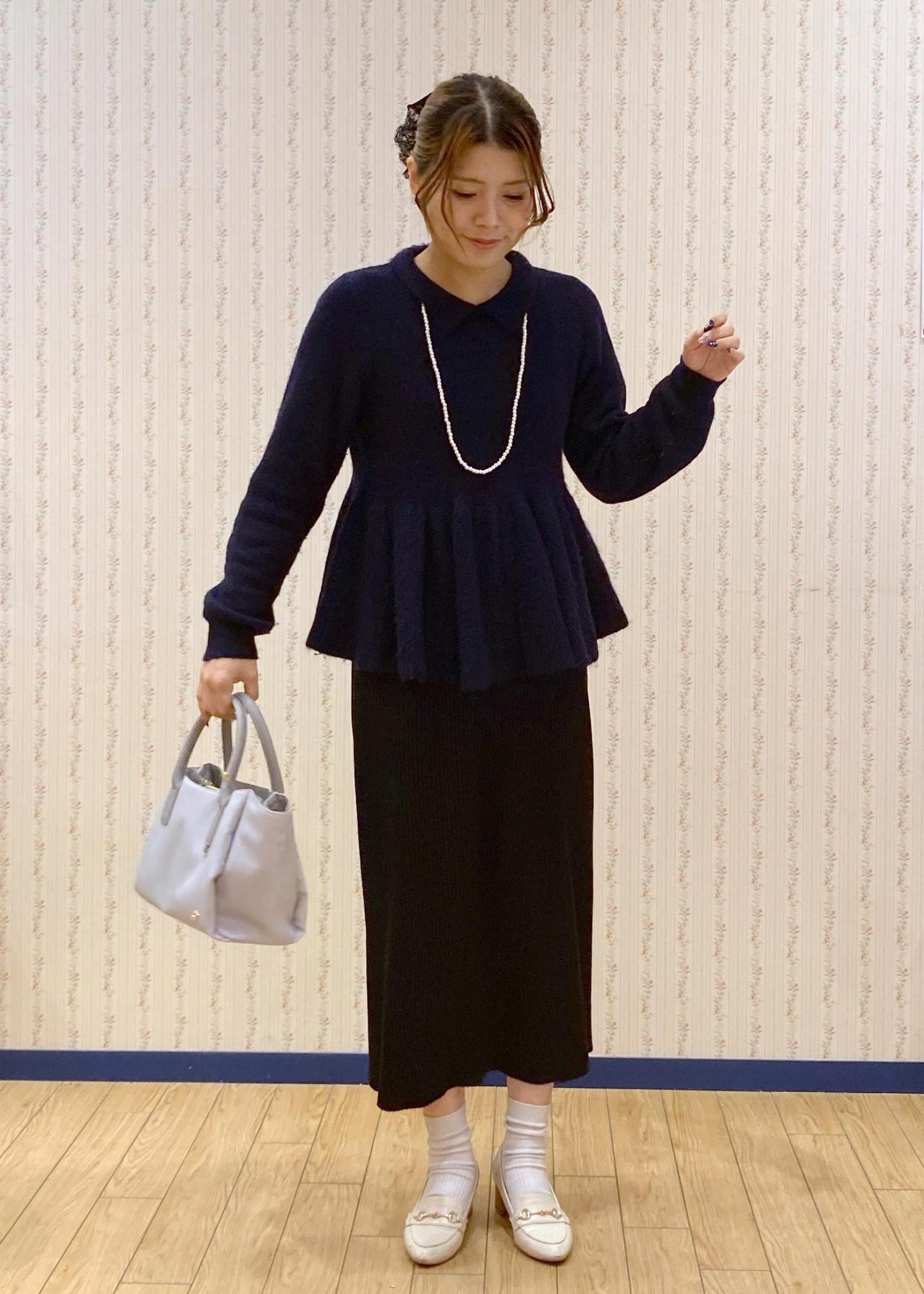 ペプラムニット×アイラインスカートで縦のラインを意識きたスタイルアップコーディネートです。