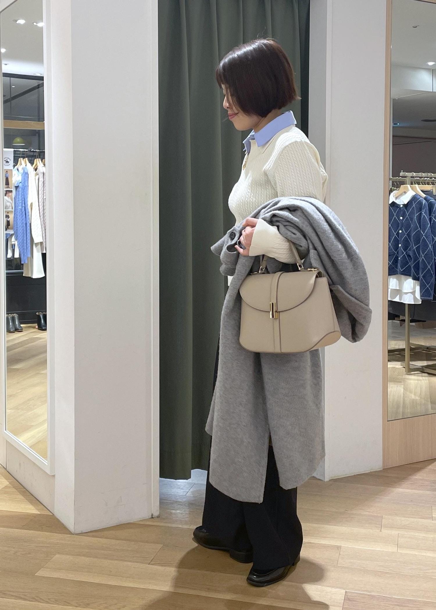ダブルカラーがポイントのミニケーブルニットにグレーのロングコートを合わせた、シンプルカジュアルコーデです!