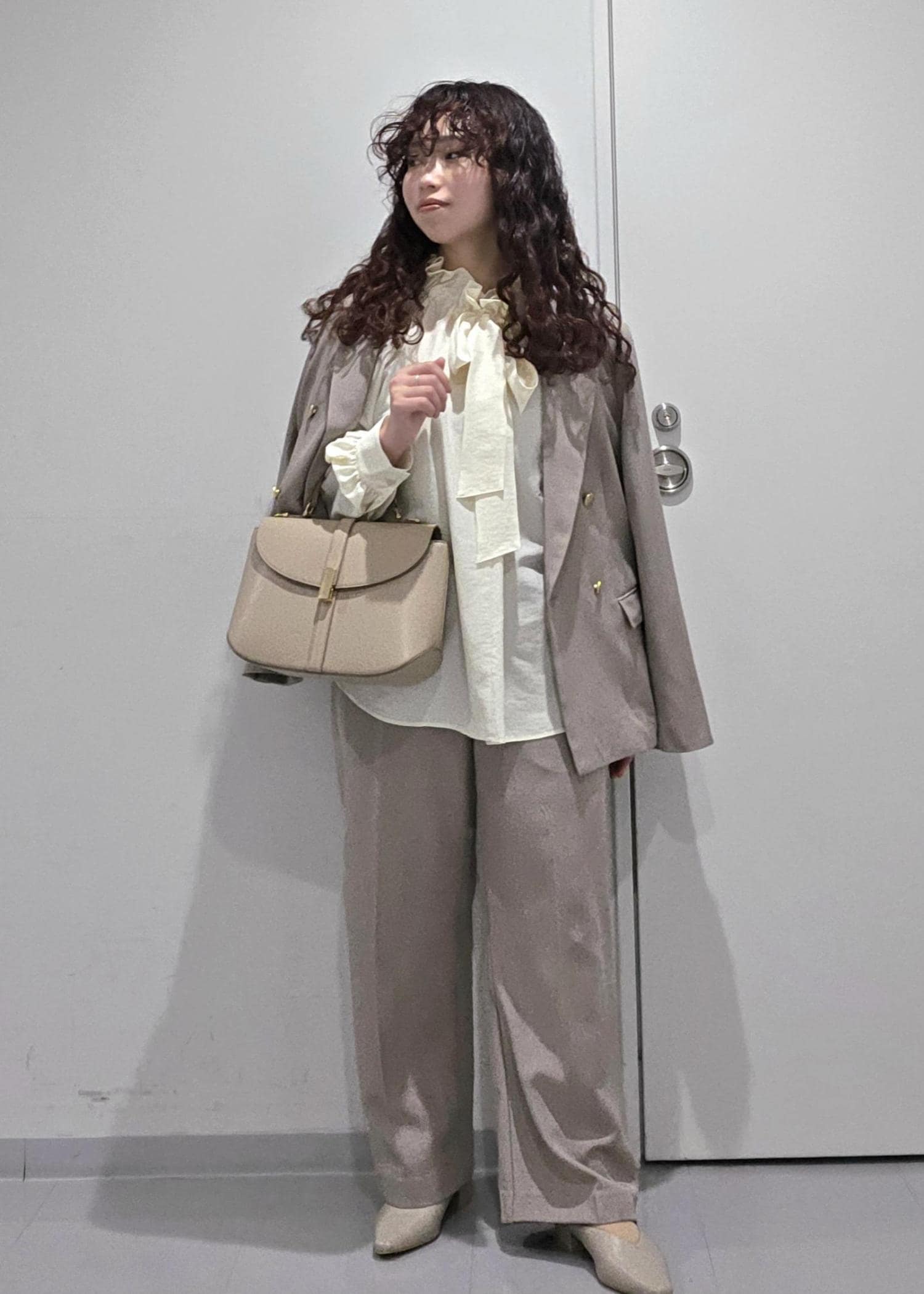 明るいベージュカラーで柔らかさもありつつ、カチッとジャケットスタイルでしっかり見せ。