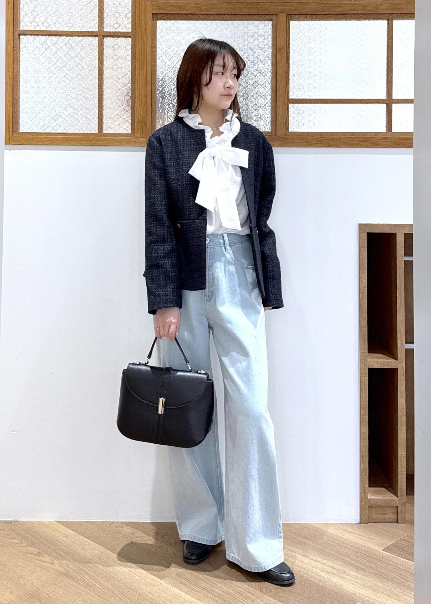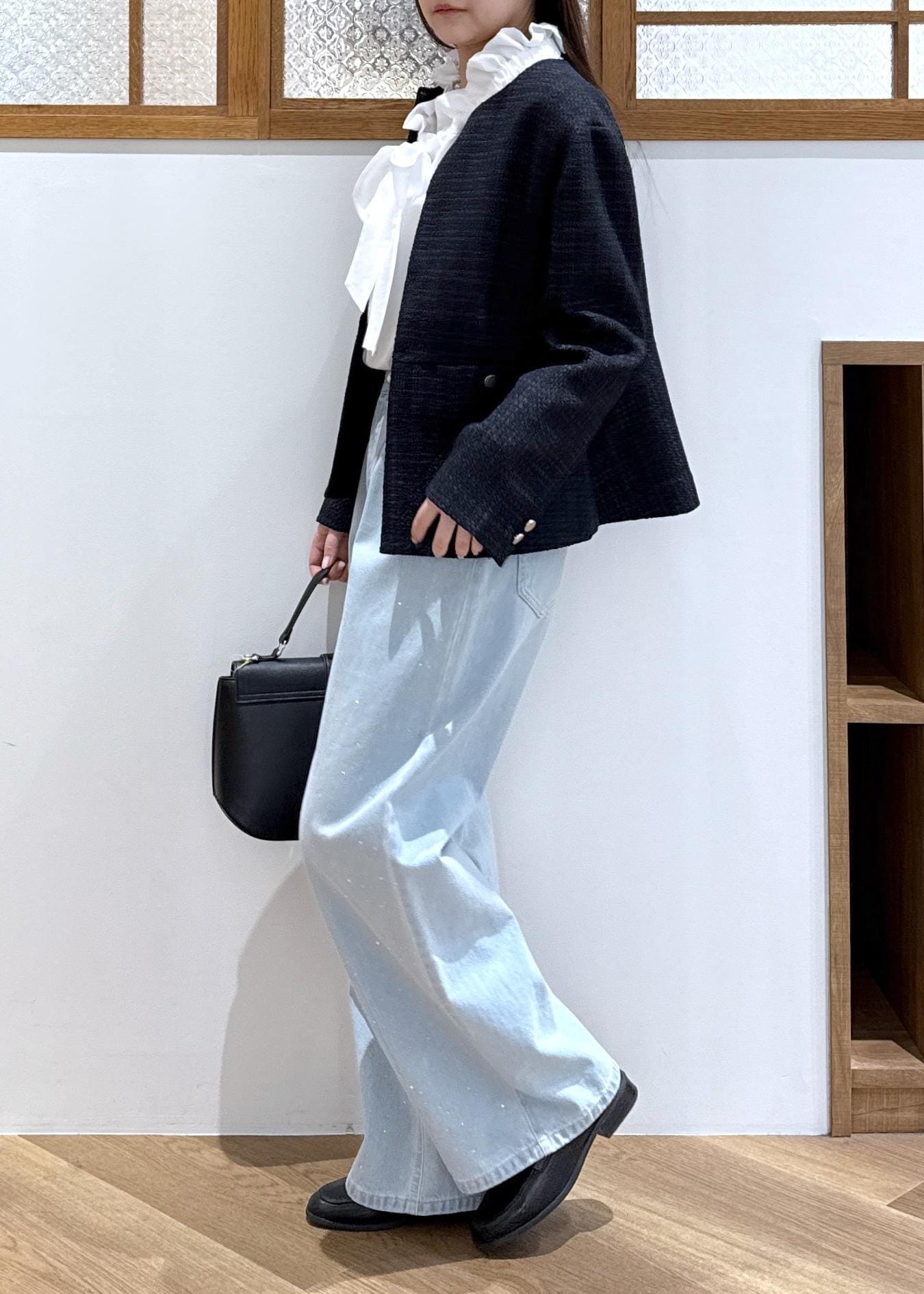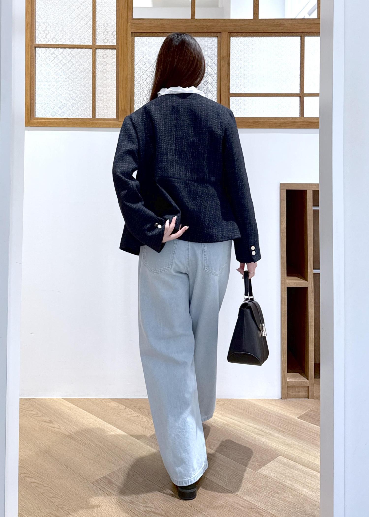 ツイードジャケットにデニムを合わせたきれいめカジュアルなコーディネートです。