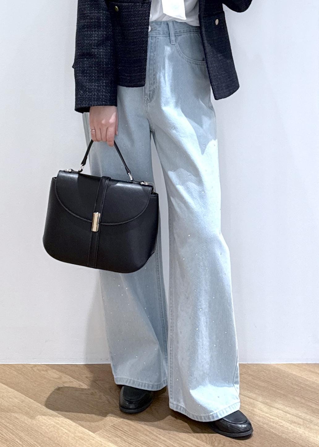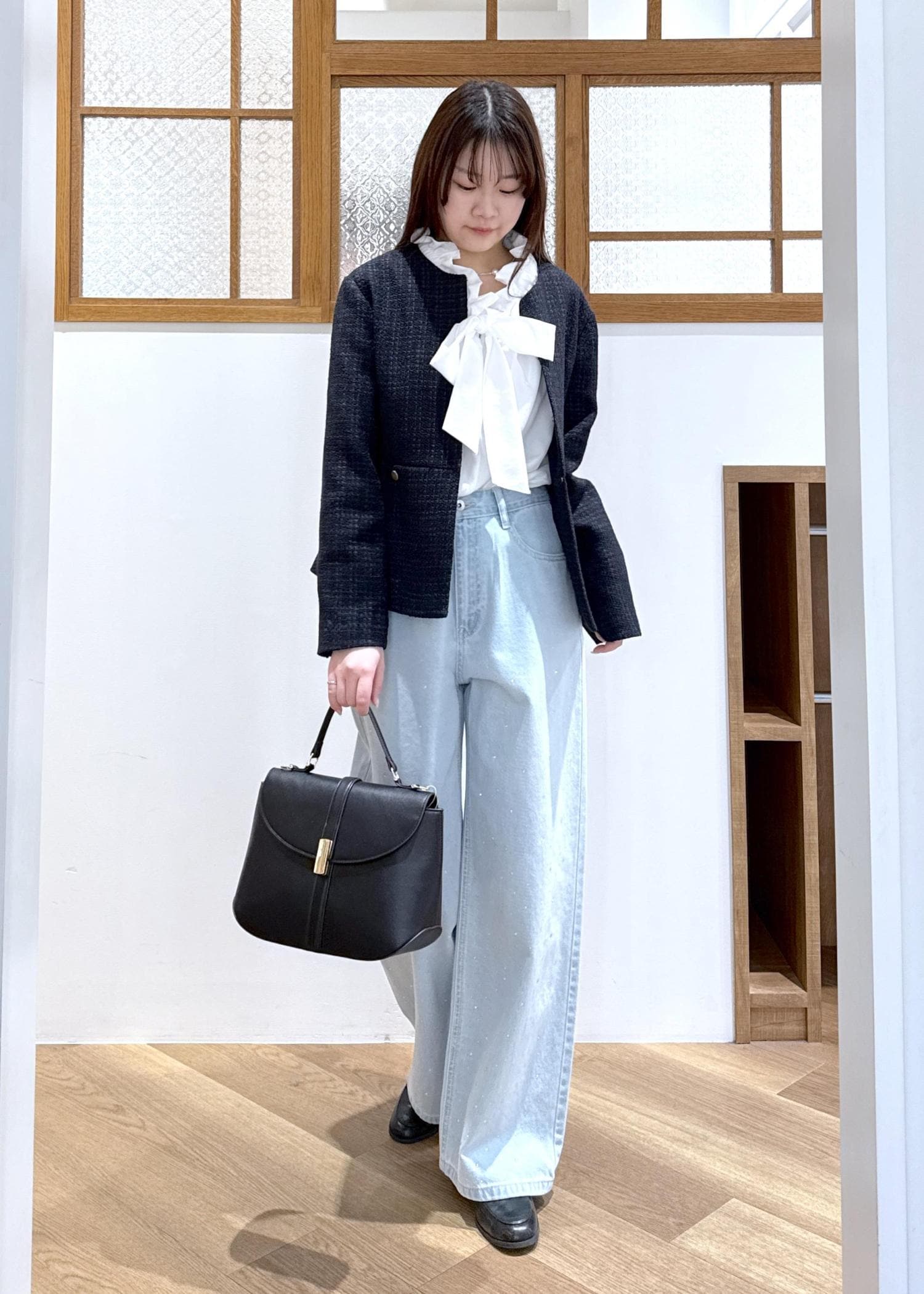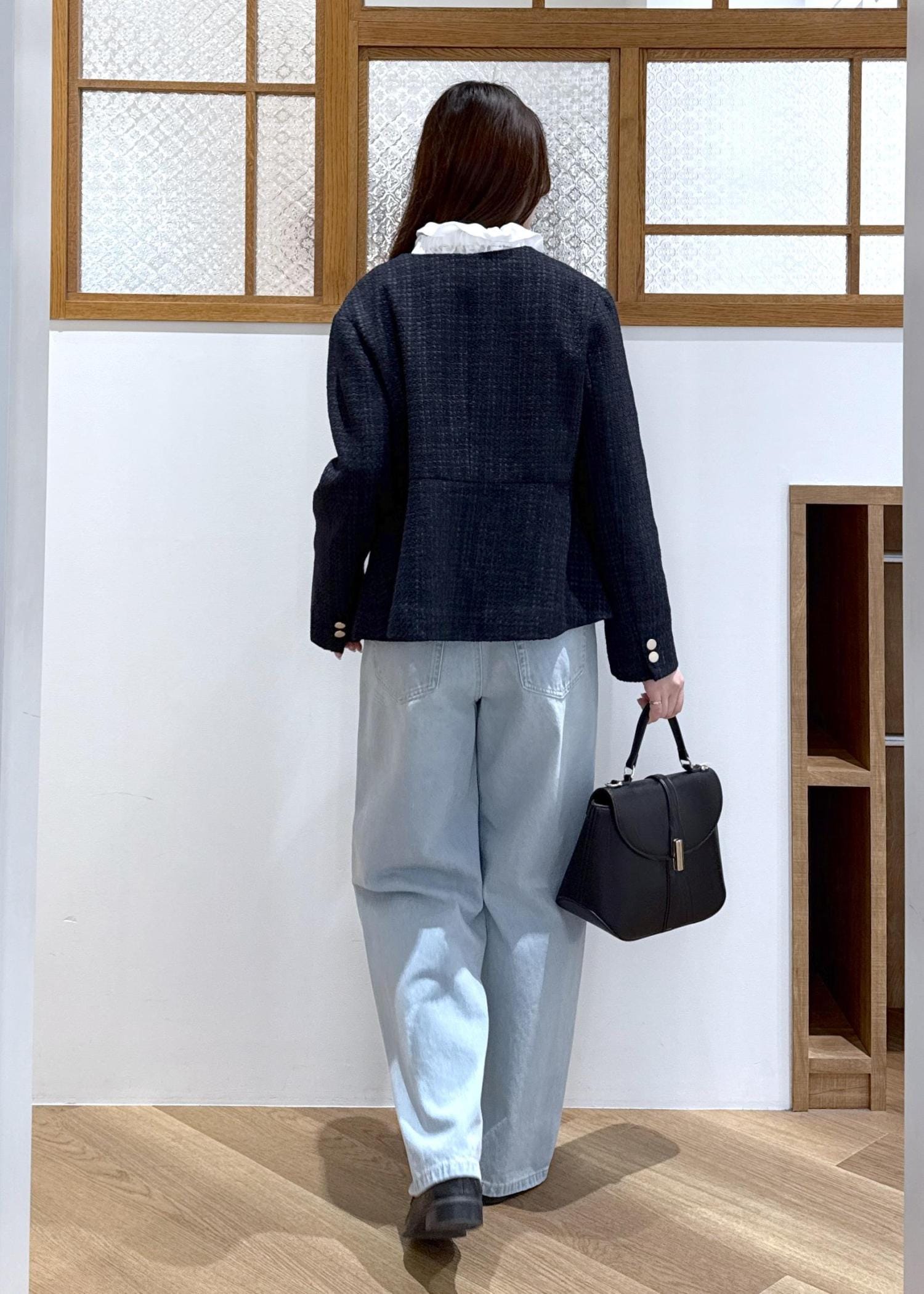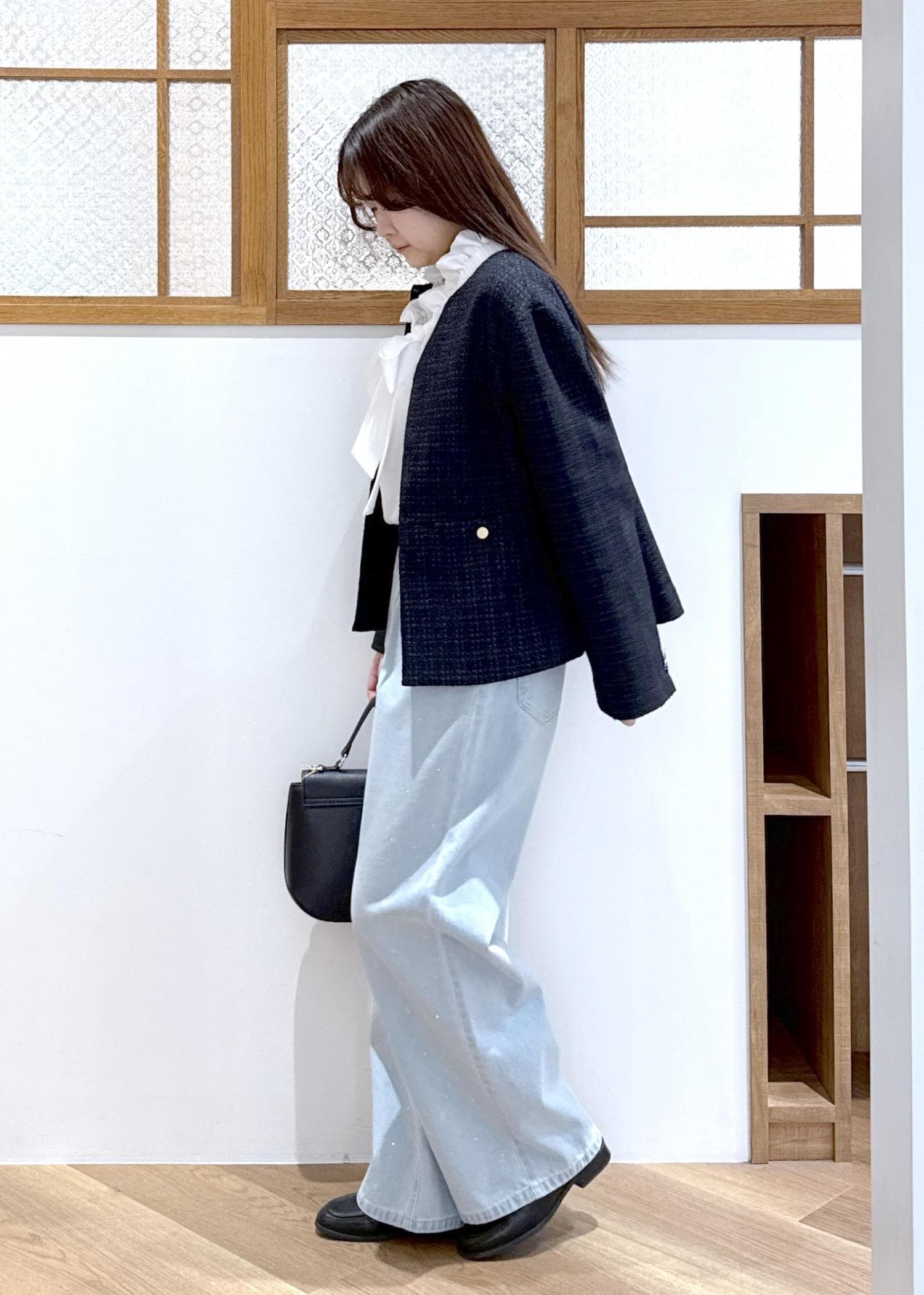 ツイードジャケットにデニムを合わせたきれいめカジュアルなコーディネートです。