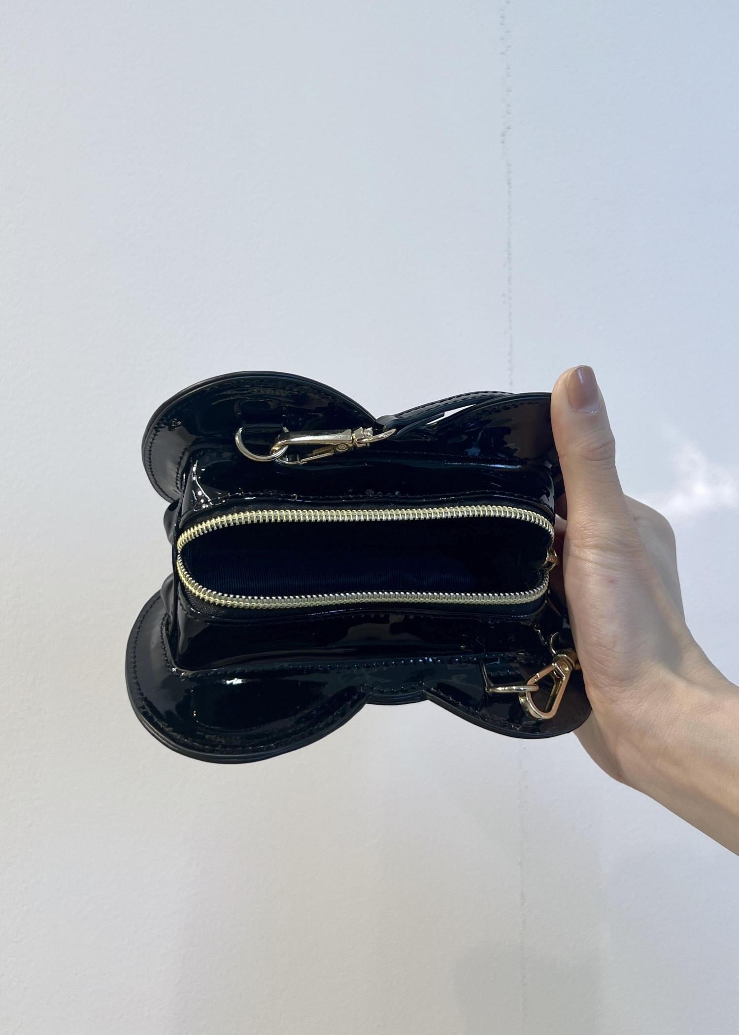 ツヤのあるエナメル素材で、コーデのワンポイントに。チェーンを付ければ斜め掛けも可能。