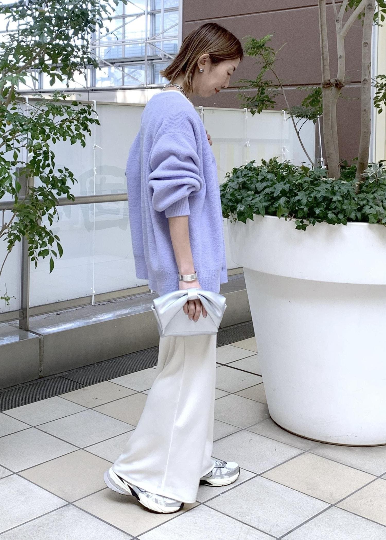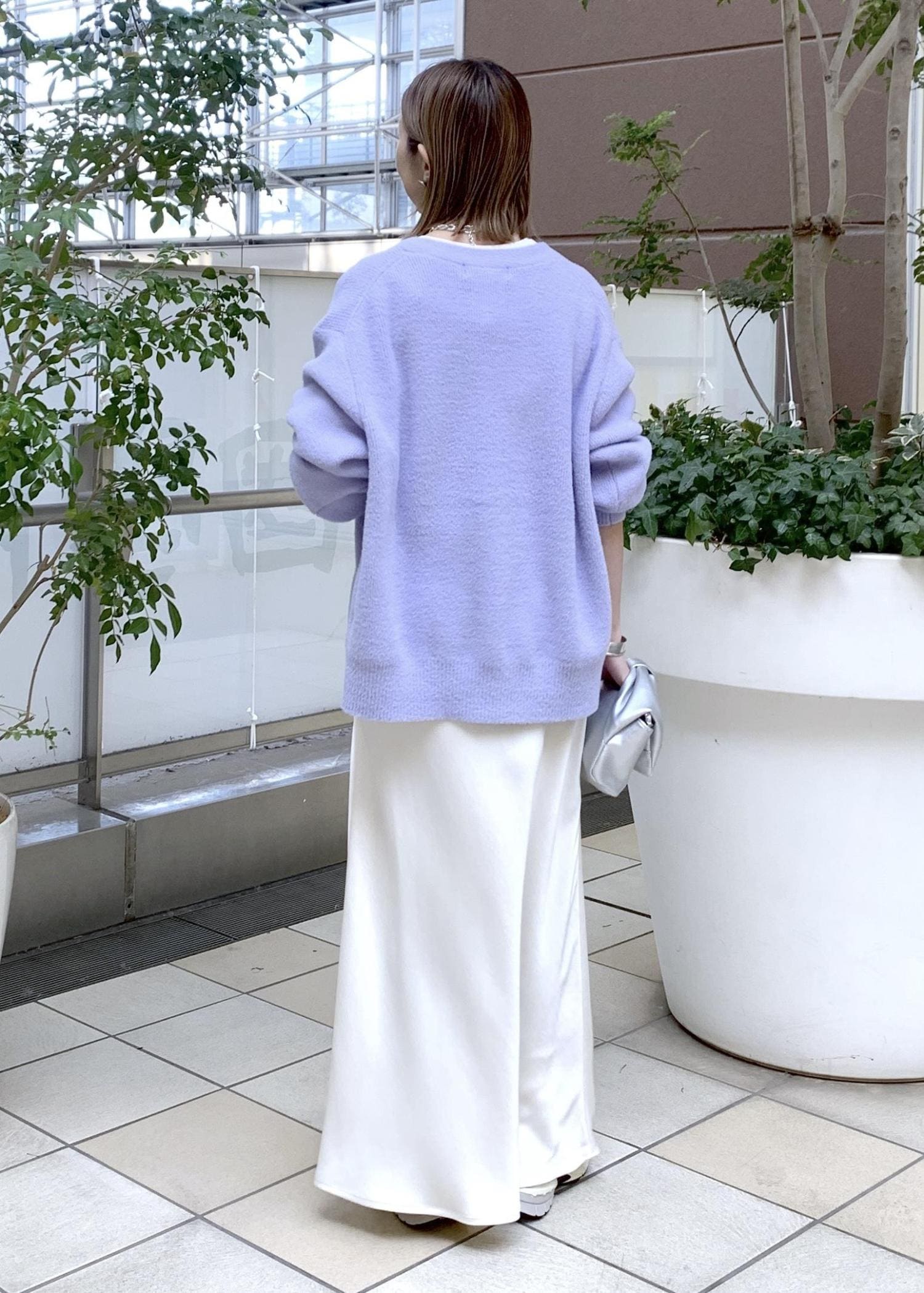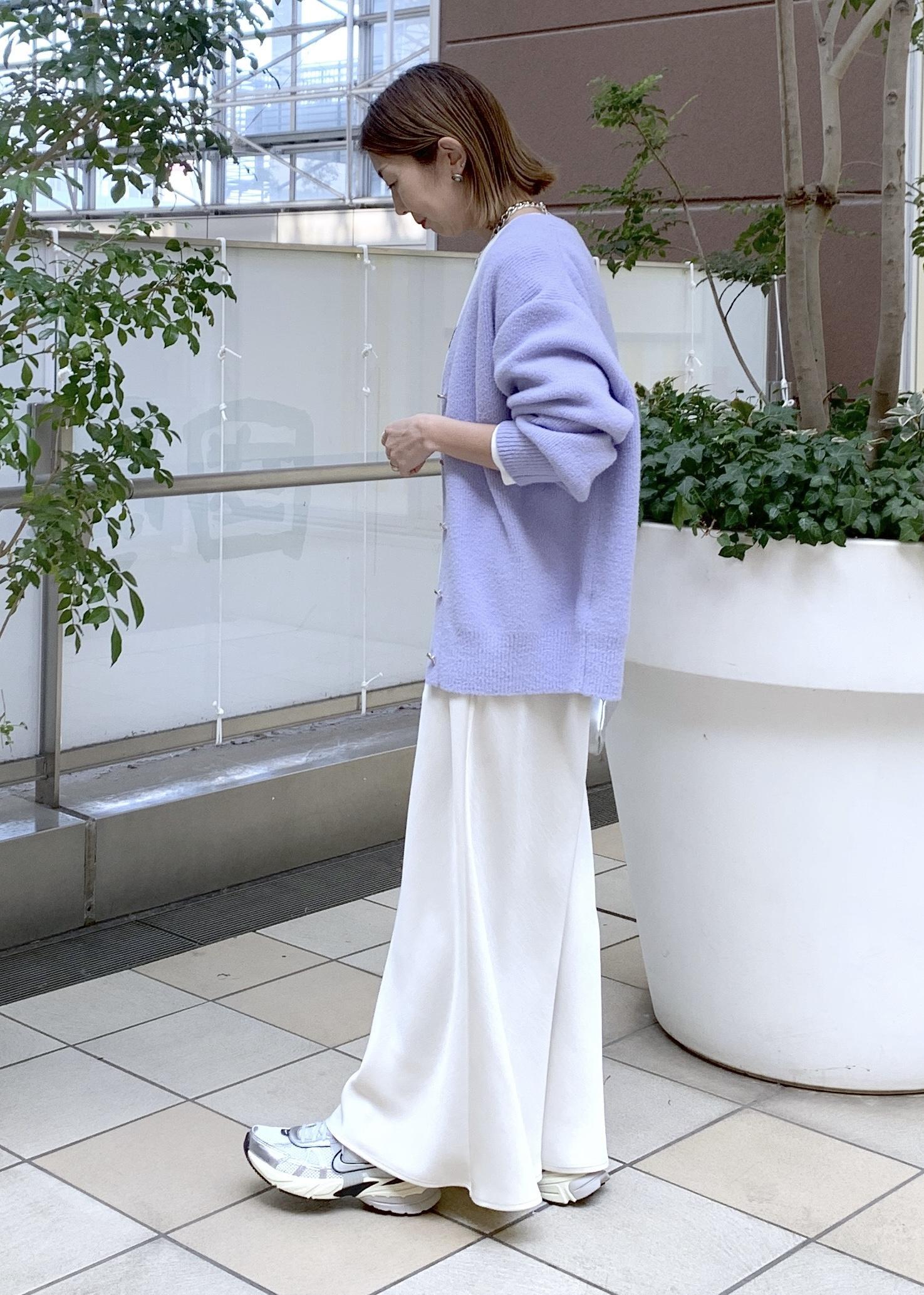 暖かい着心地のニットは春カラーを選べば、ひと足早い春カラーコーデに…