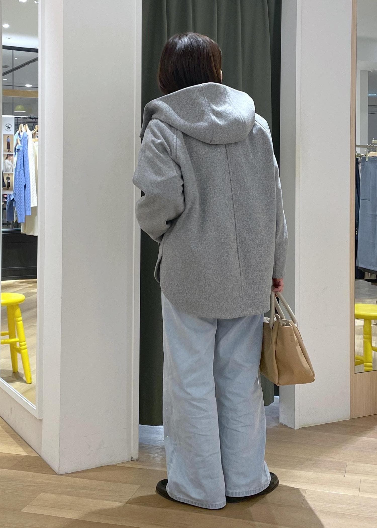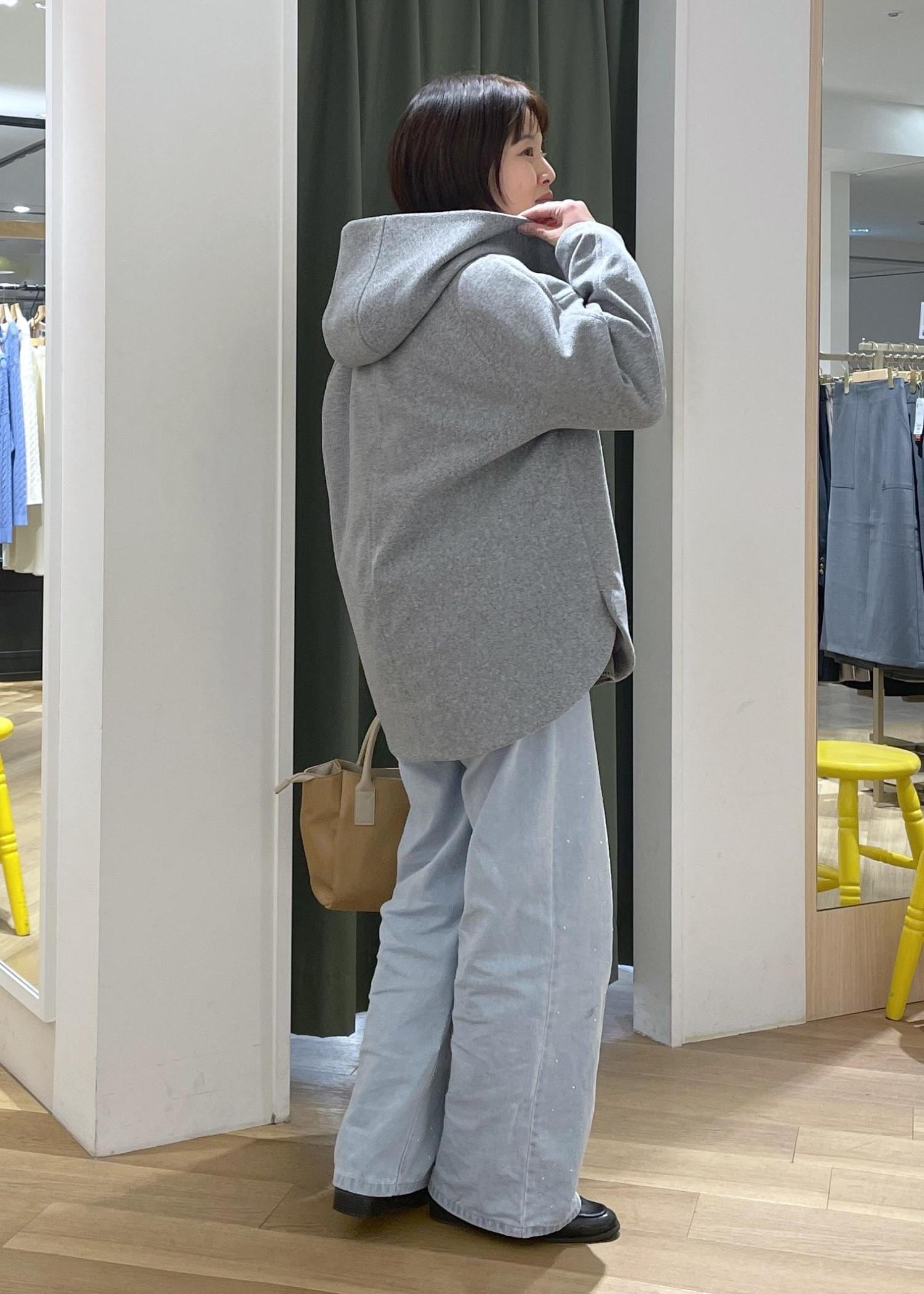 きれい見えもするフーデッドコートにビジューデニムを合わせた、トレンドカジュアルコーデです!