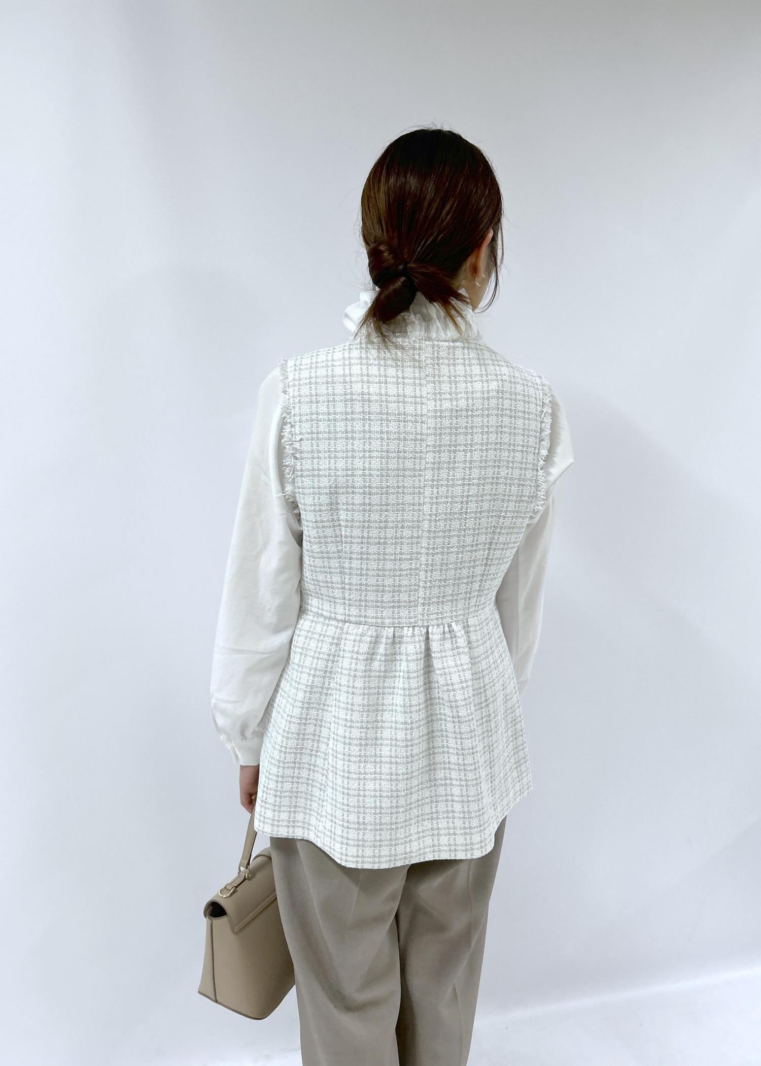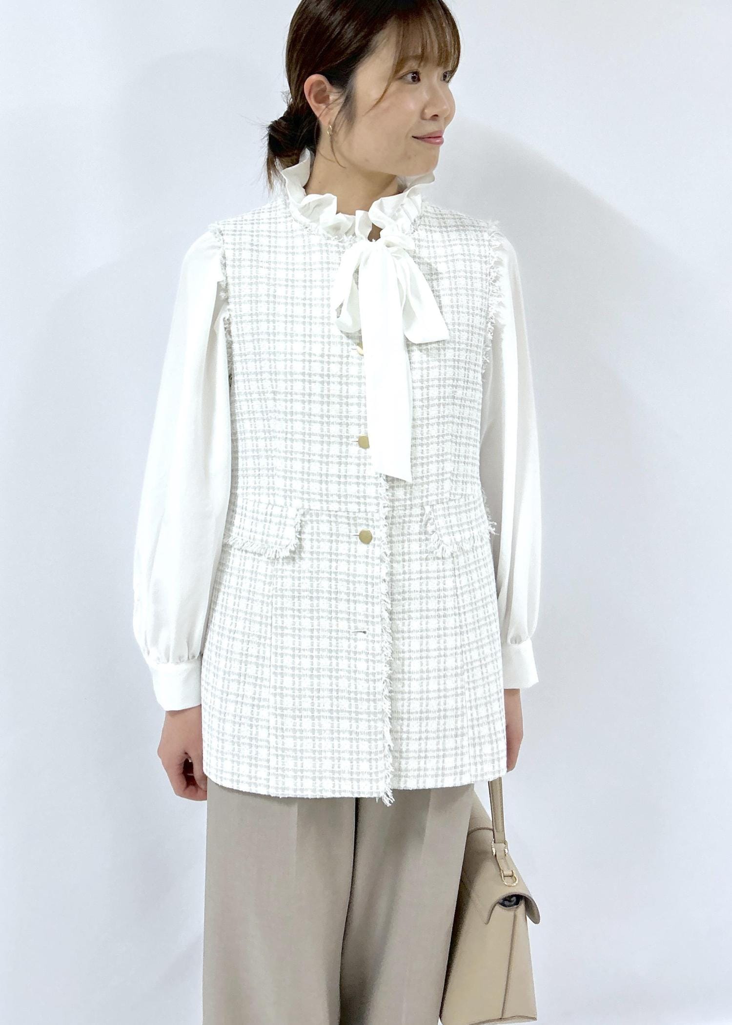 予約ROPÉ PICNIC【WEB限定カラー】ツイード金ボタンジレベスト/セレモニー対応・リンクコーデライトグレー / F¥8,998レビューフォーマルシーンからカジュアルスタイルでも着回し力抜群のジレです。バックスタイルは切り替えがありペプラムのようなシルエットです。