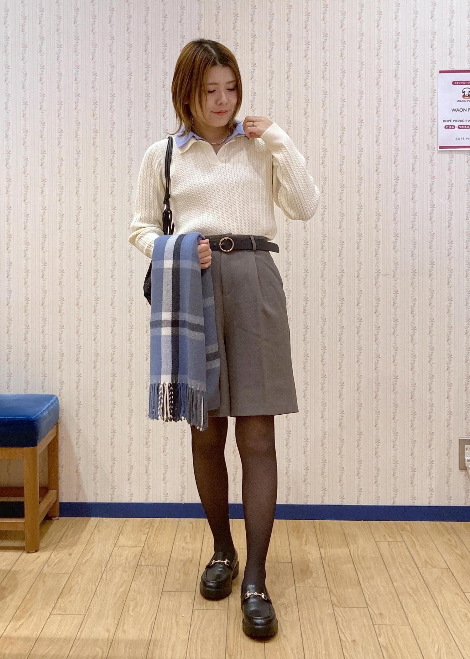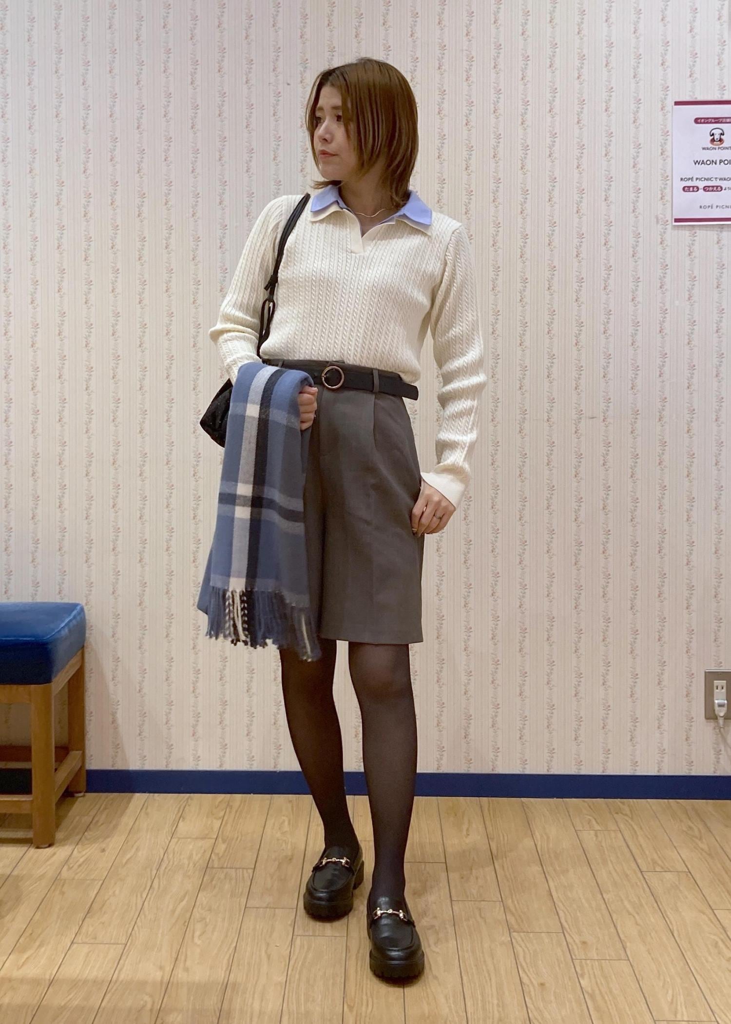 全体はモノトーン系でまとめて、ブルーのチェックストールを差し色に使いました!