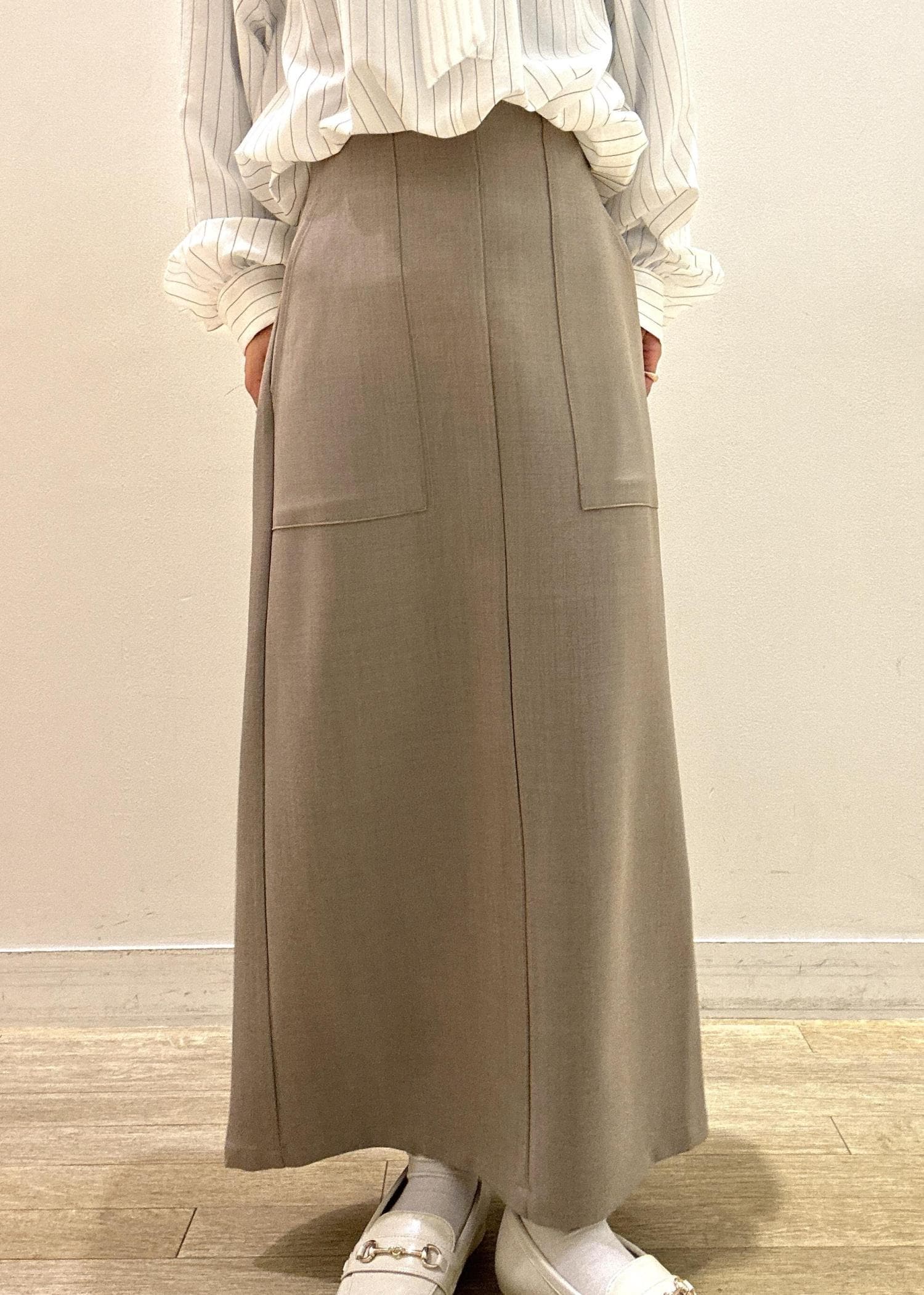 ROPÉ PICNICフロントポケットアイラインスカートベージュ / 36¥2,745レビュー147㎝でも足首ぐらいの長さで、フラットシューズでも履ける長さなので小柄な方にもおすすめです。