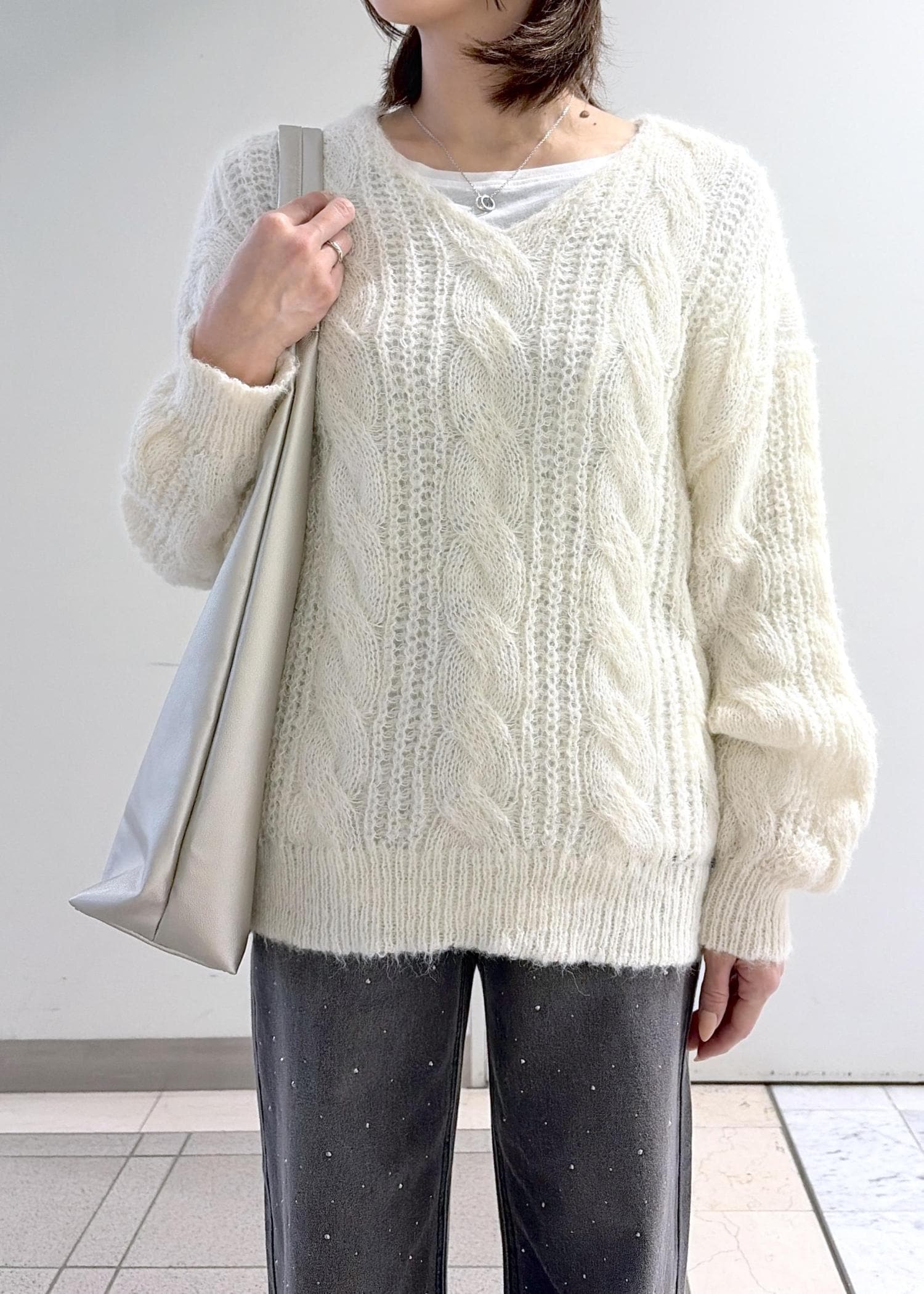 ROPÉ PICNICゆるケーブル編みVネックニットキナリ / F¥2,745レビューオーバーサイズの体のラインを拾いにくいです。袖丈は手の甲にかかる位の長さで、着丈はお尻かかる位です。シャツやカットソーとレイヤードするのもオススメです。