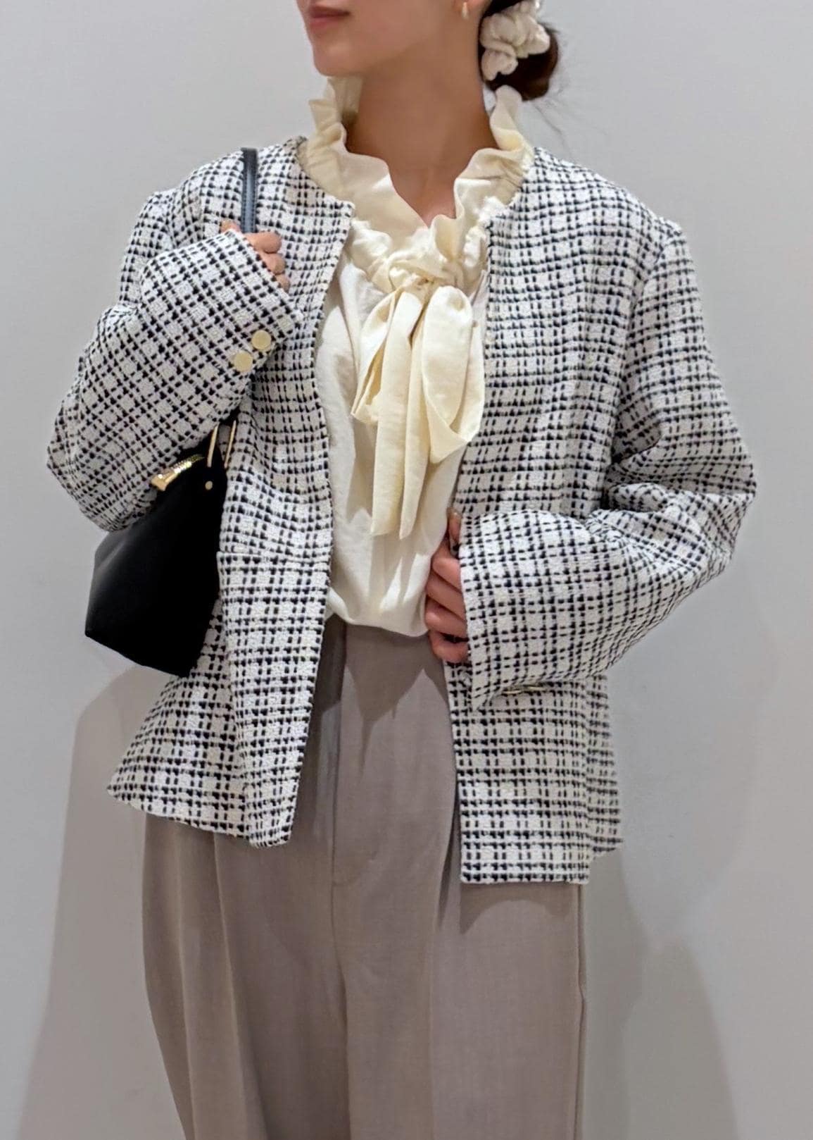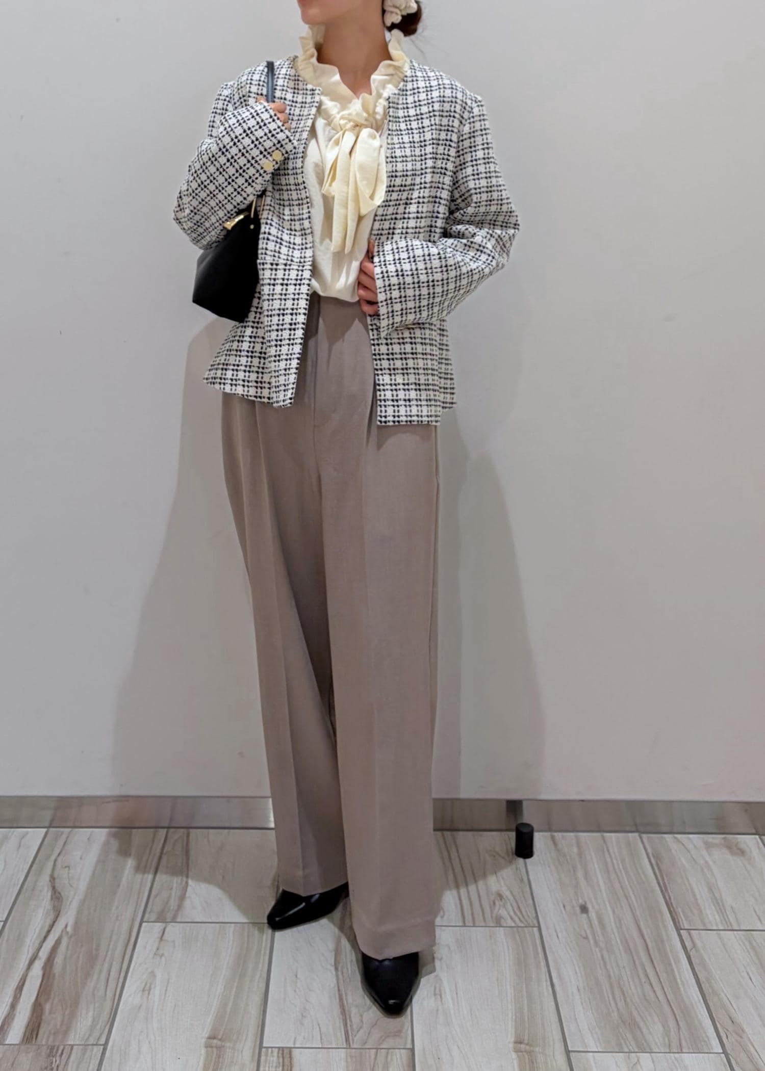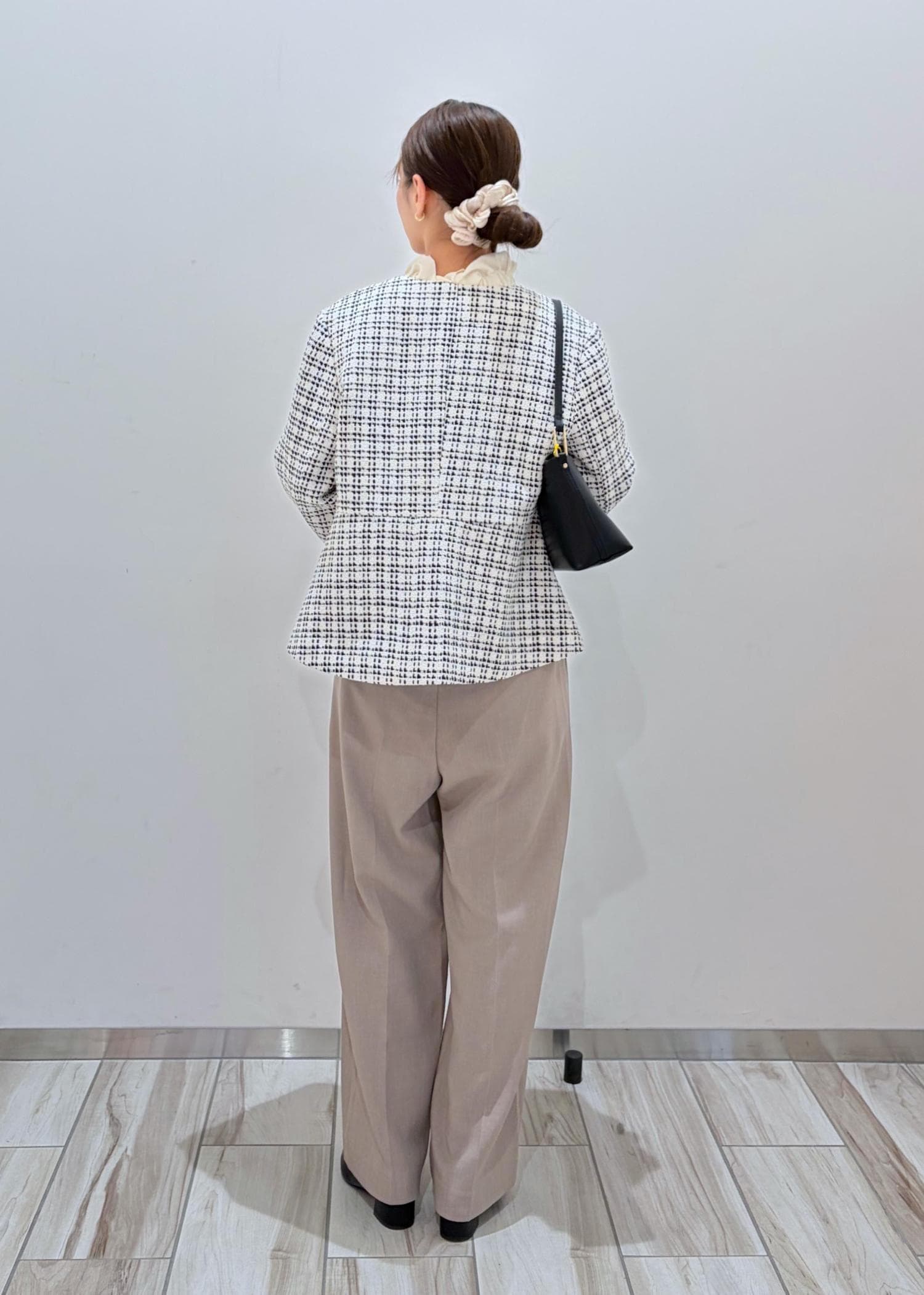 キレイめな場面やカジュアルミックスでも着回し可能な高級感のあるツイードジャケット。クリーム系のブラウスと茶系のパンツで組み合わせることで全体的に柔らかい印象に♪