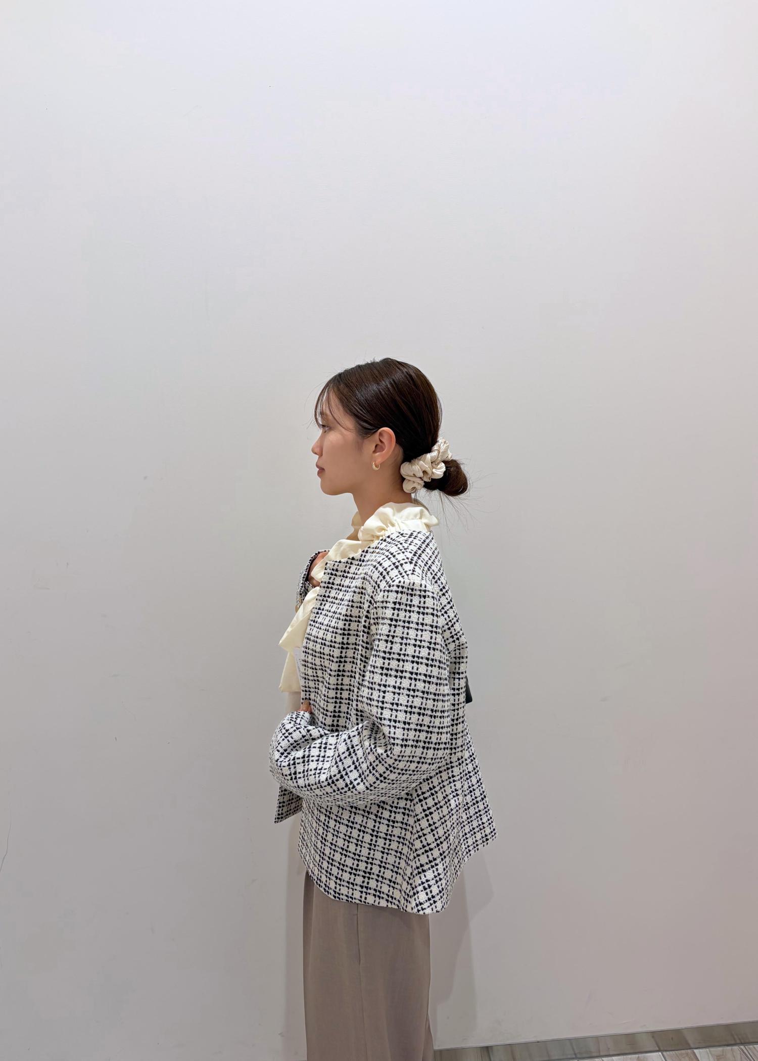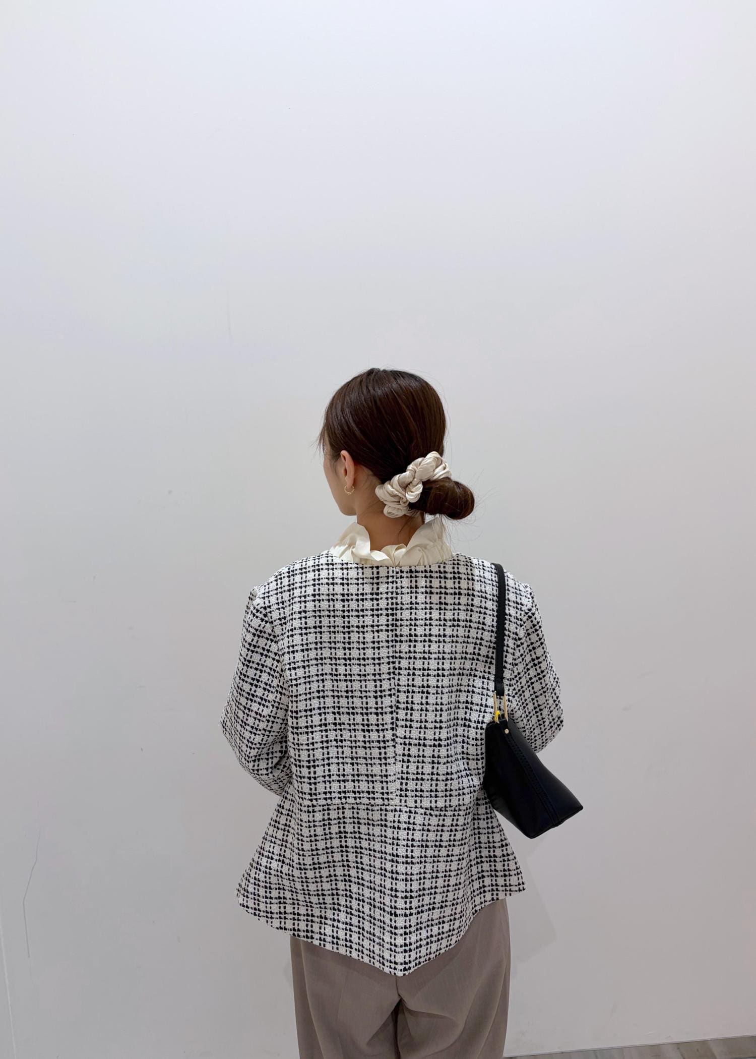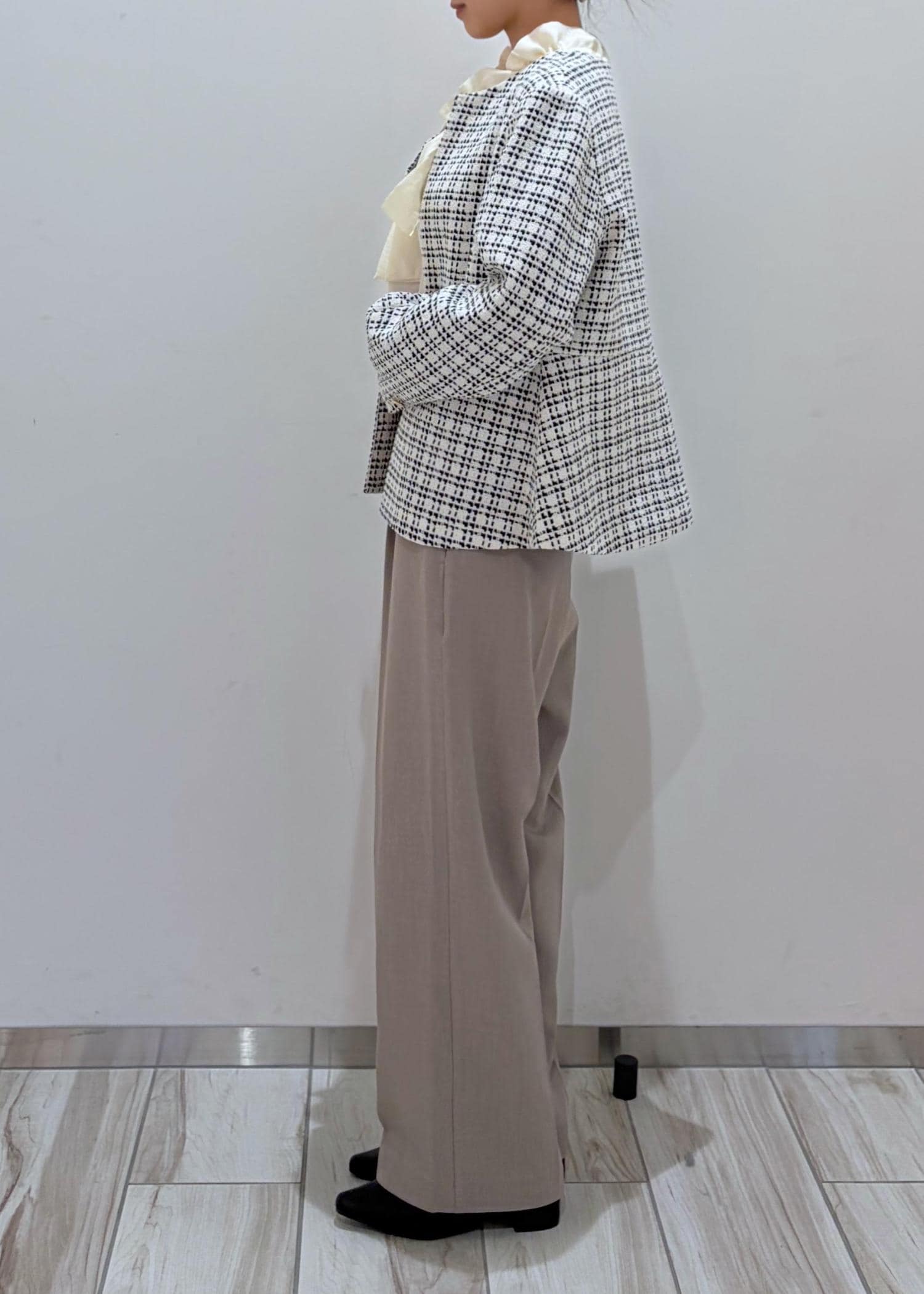 キレイめな場面やカジュアルミックスでも着回し可能な高級感のあるツイードジャケット。クリーム系のブラウスと茶系のパンツで組み合わせることで全体的に柔らかい印象に♪