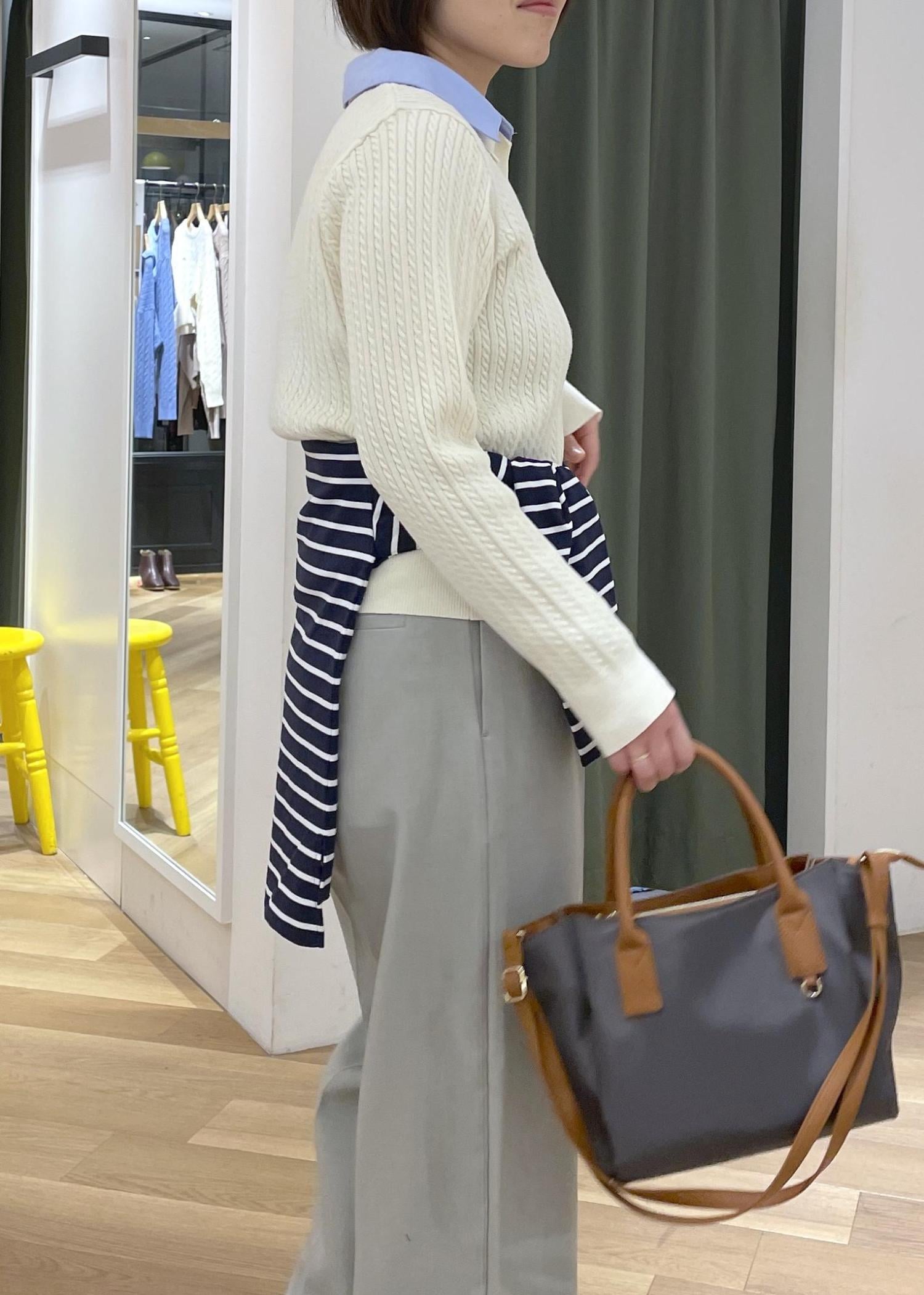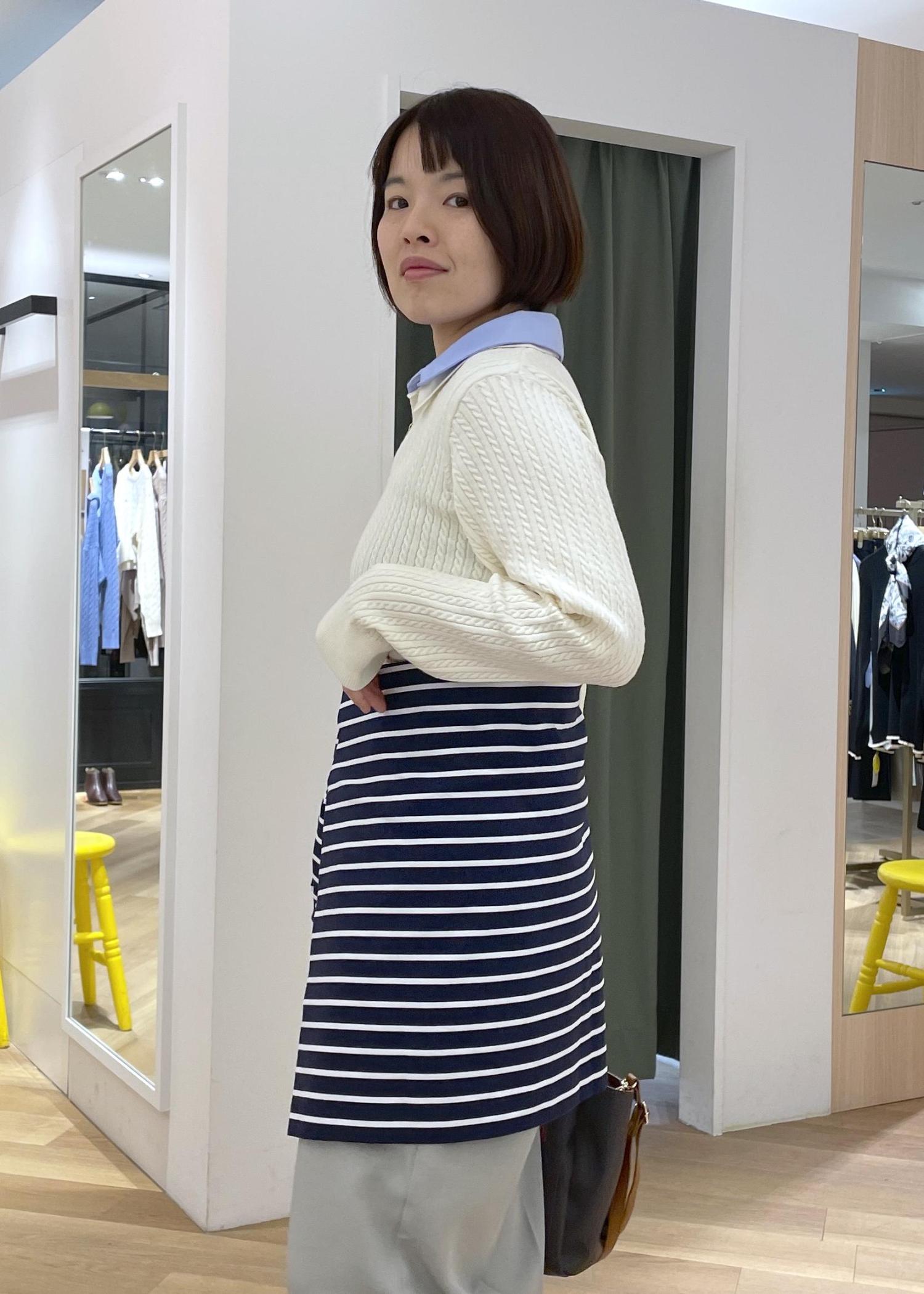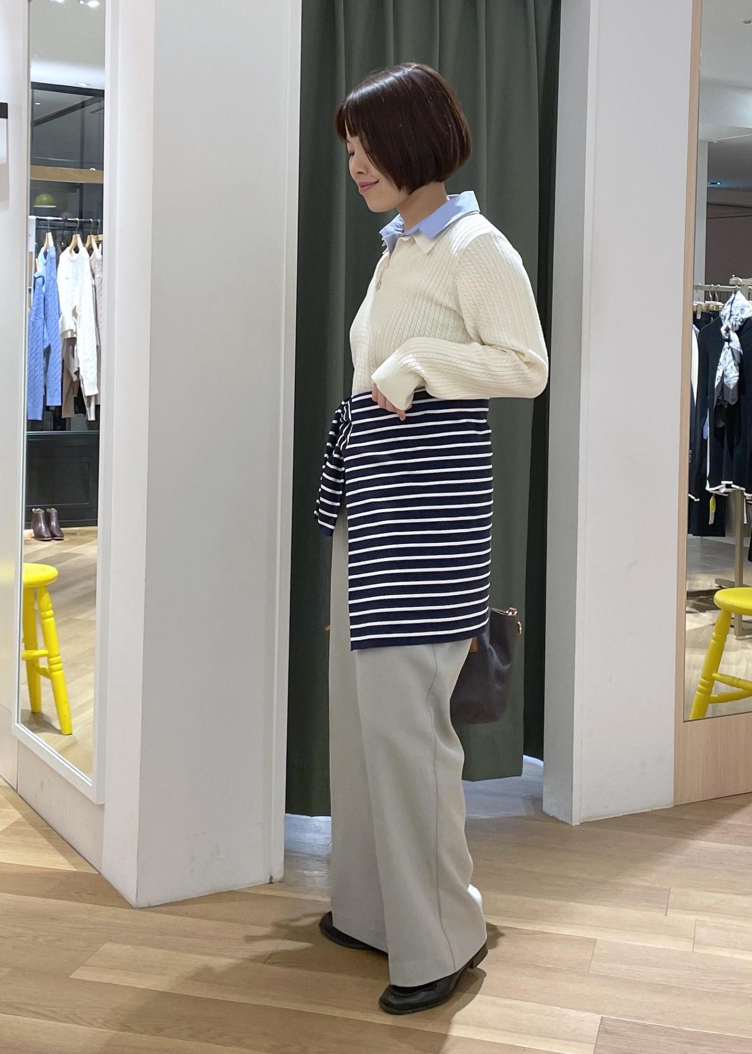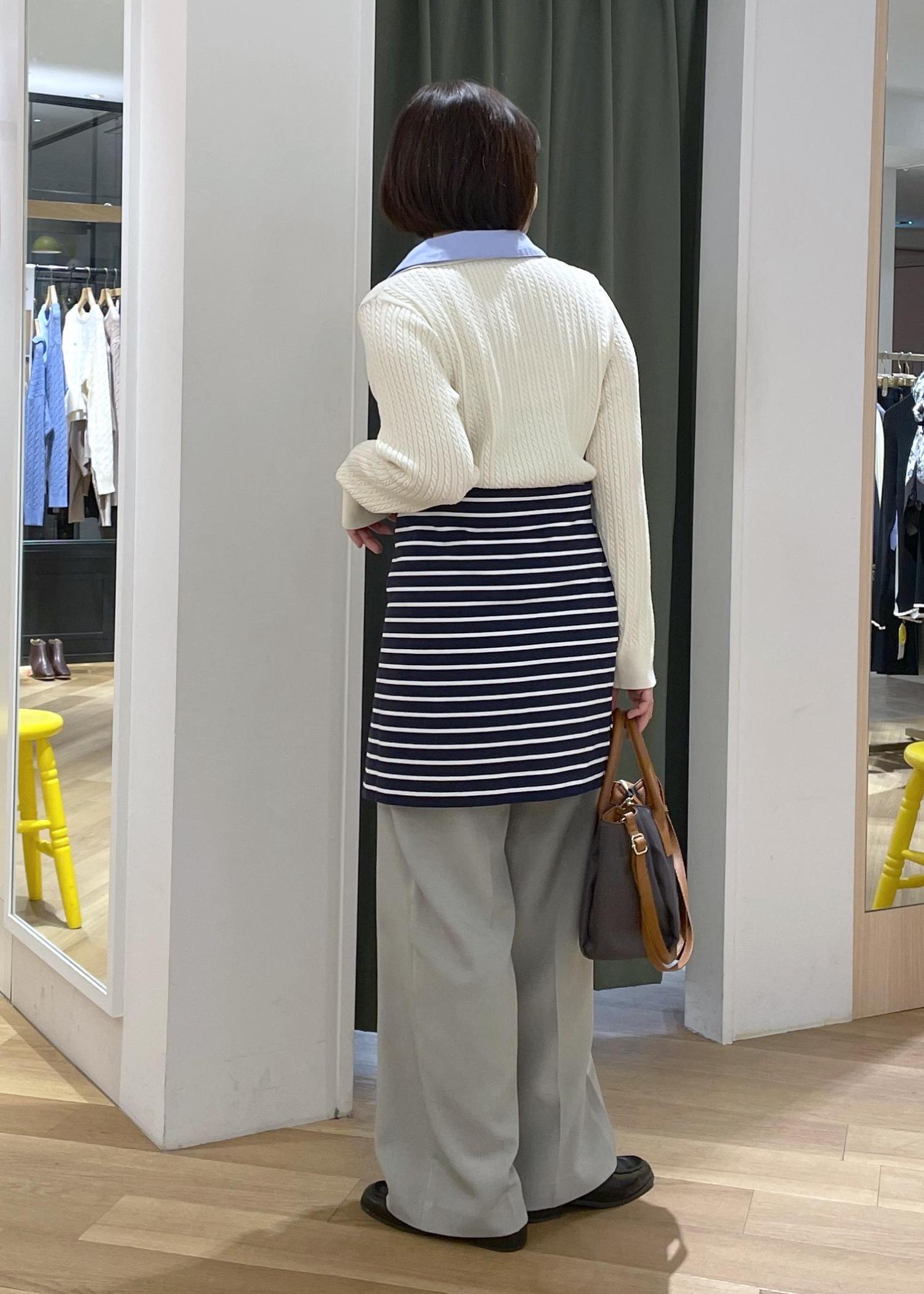 淡いトーンのコーデだったので、ネイビーのボーダーカットソーを腰巻きして、メリハリをつけた大人カジュアルコーデに◎