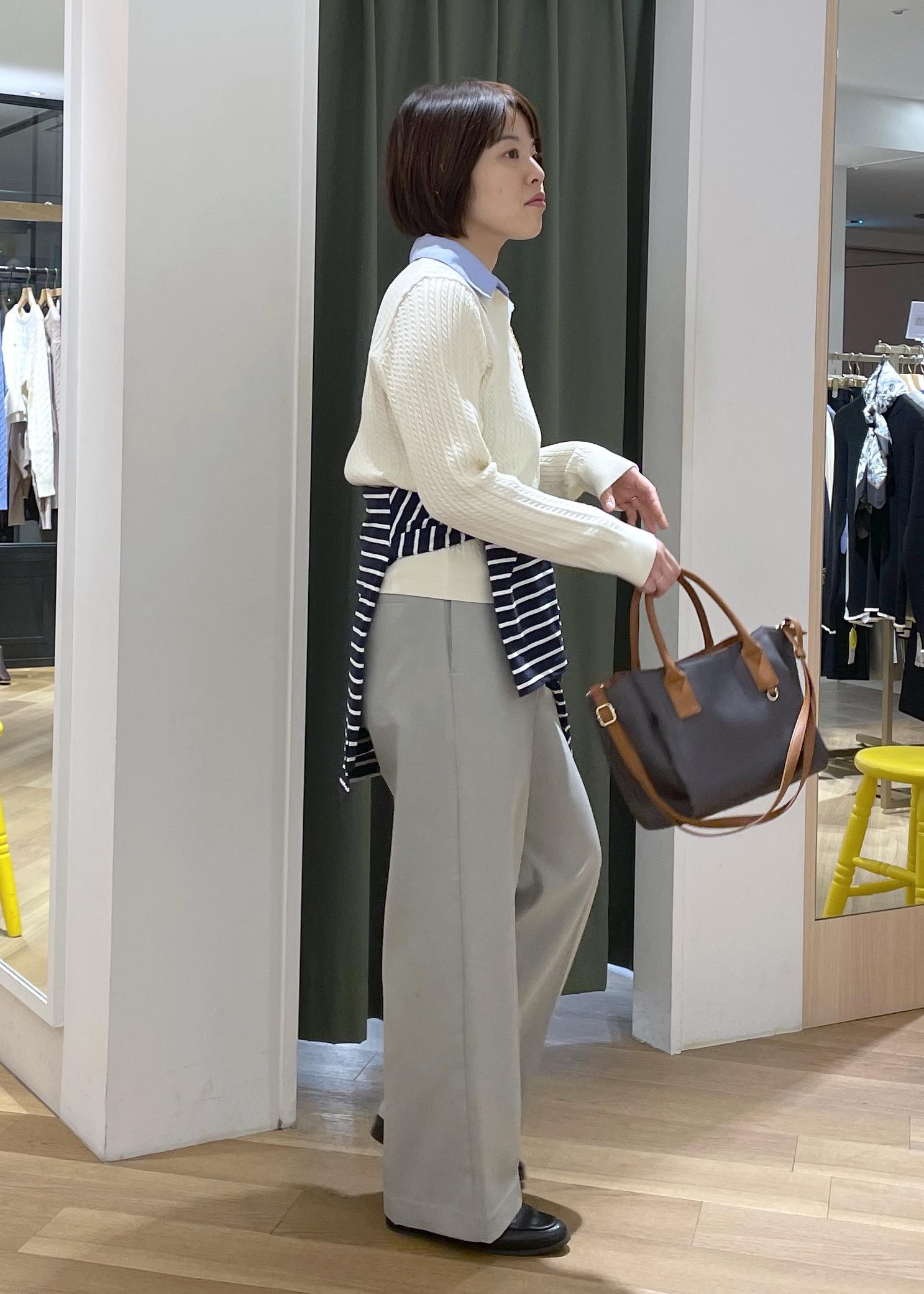 白のミニケーブルニットにライトグリーンのワイドパンツを合わせた、春にぴったりの爽やかなカラーコーデです!