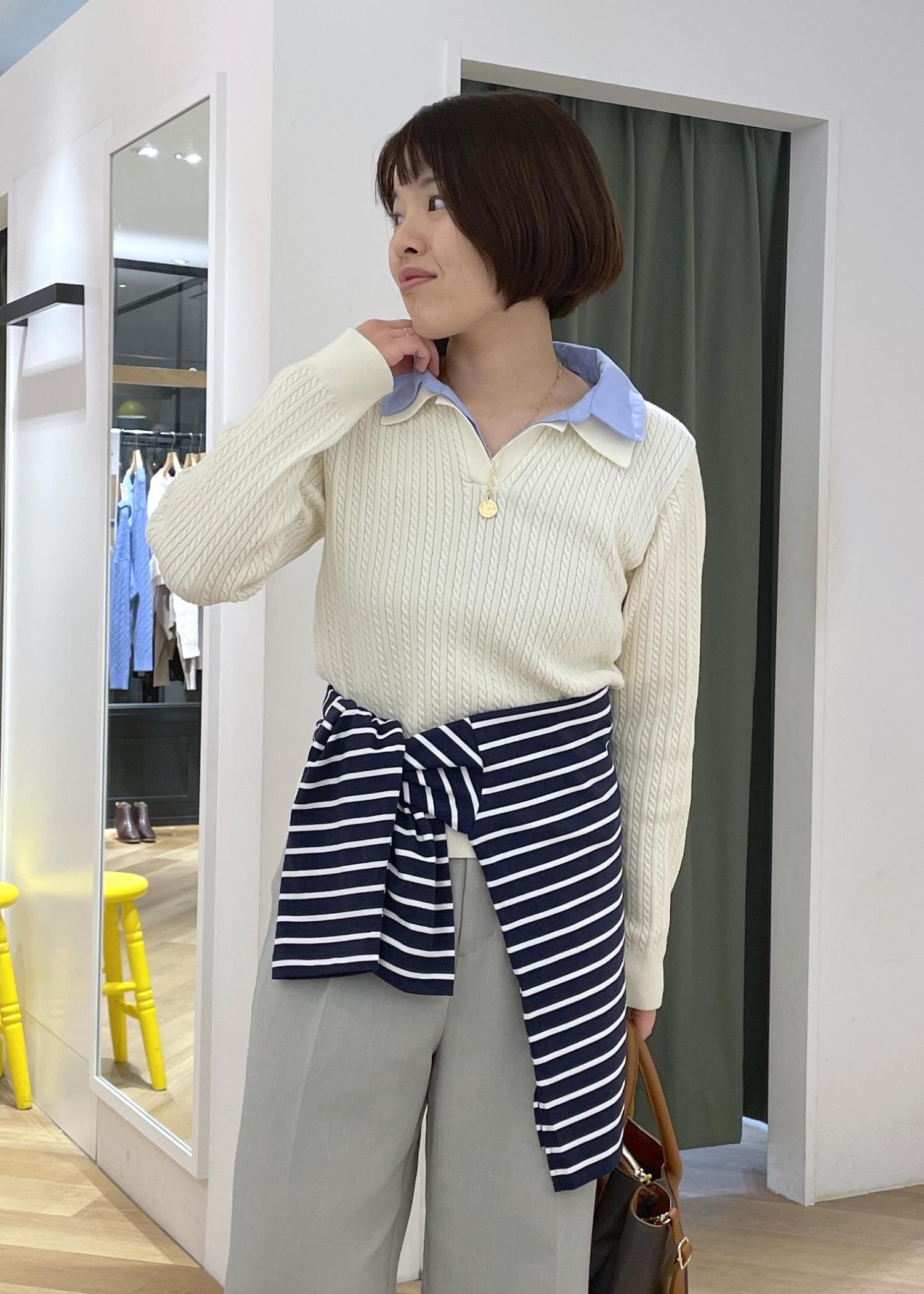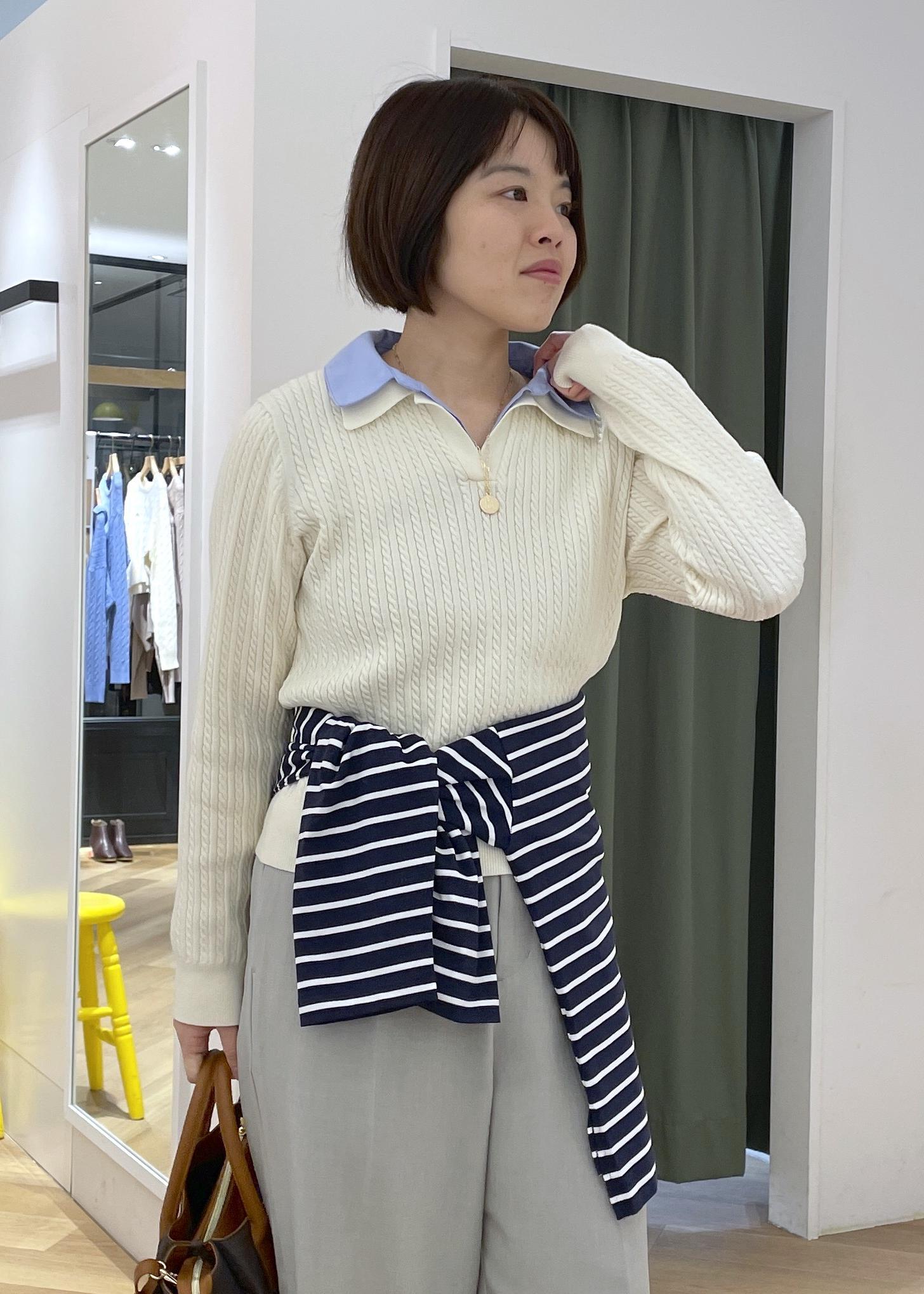 ROPÉ PICNICダブルカラーミニケーブルニットキナリ / F¥5,995レビュージャストなサイズ感で、すっきりと着こなして頂けるニットです。肌触りも柔らかく、伸縮性もあり着心地も良かったです。襟元のデザインが、ブルーシャツとレイヤードしたような見た目になっているので、1枚でお洒落見えが叶うニットです。