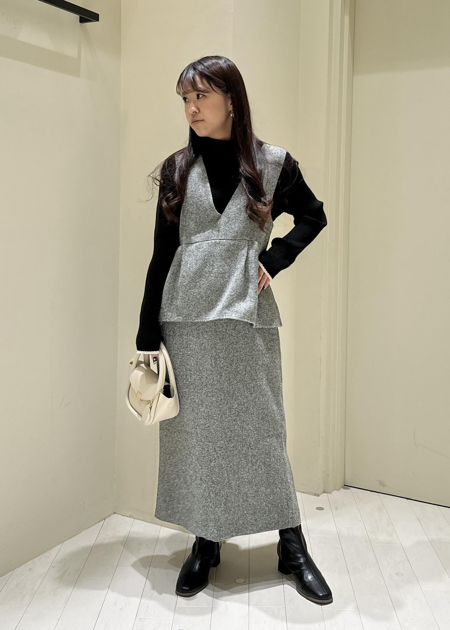 中を今はニットで着ていますが、シャツやブラウスでキレイめに合わせていただくとより素敵なコーデに✨