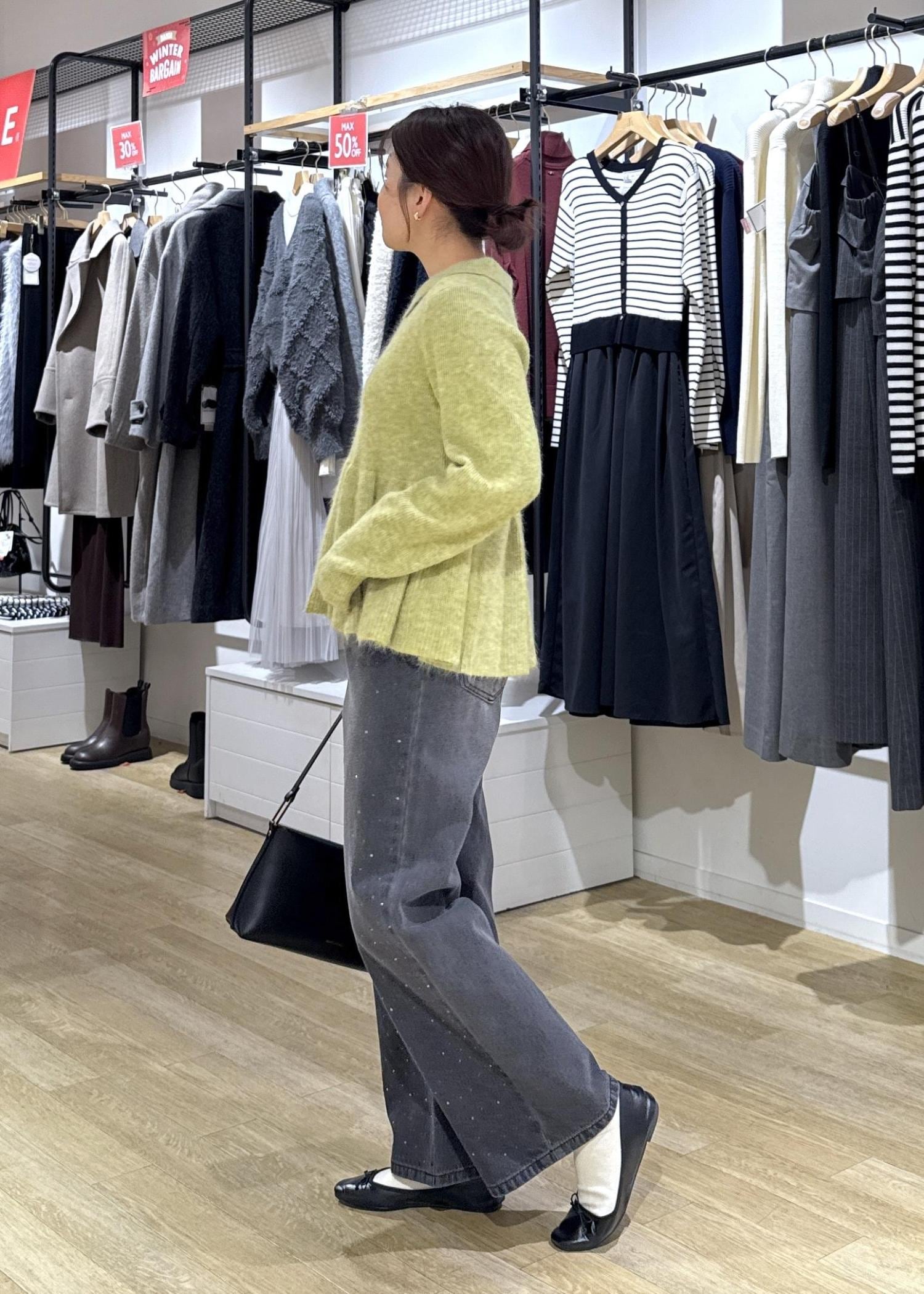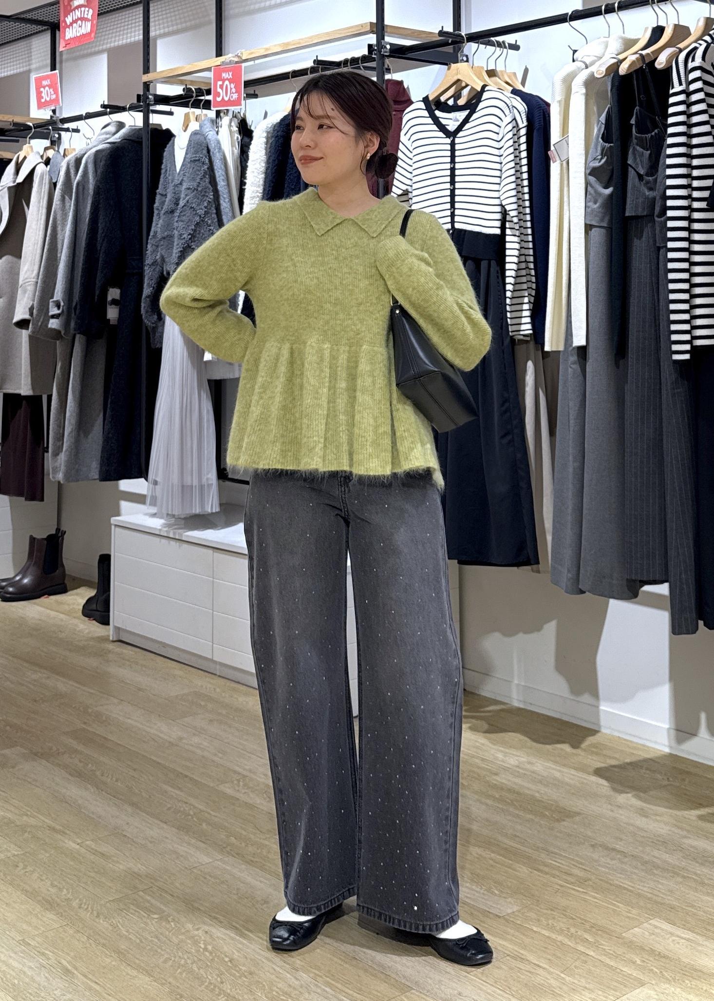 ペプラムデザインが可愛いニットにキラキラデニムを合わせて