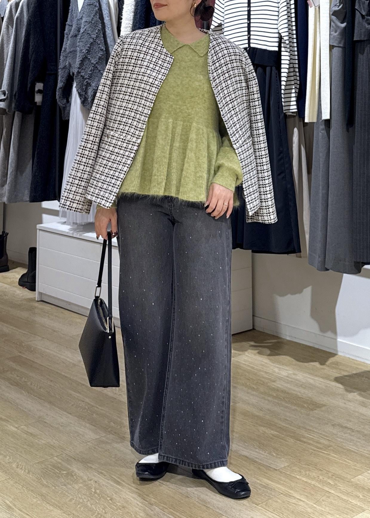 ペプラムデザインが可愛いニットにキラキラデニムを合わせて