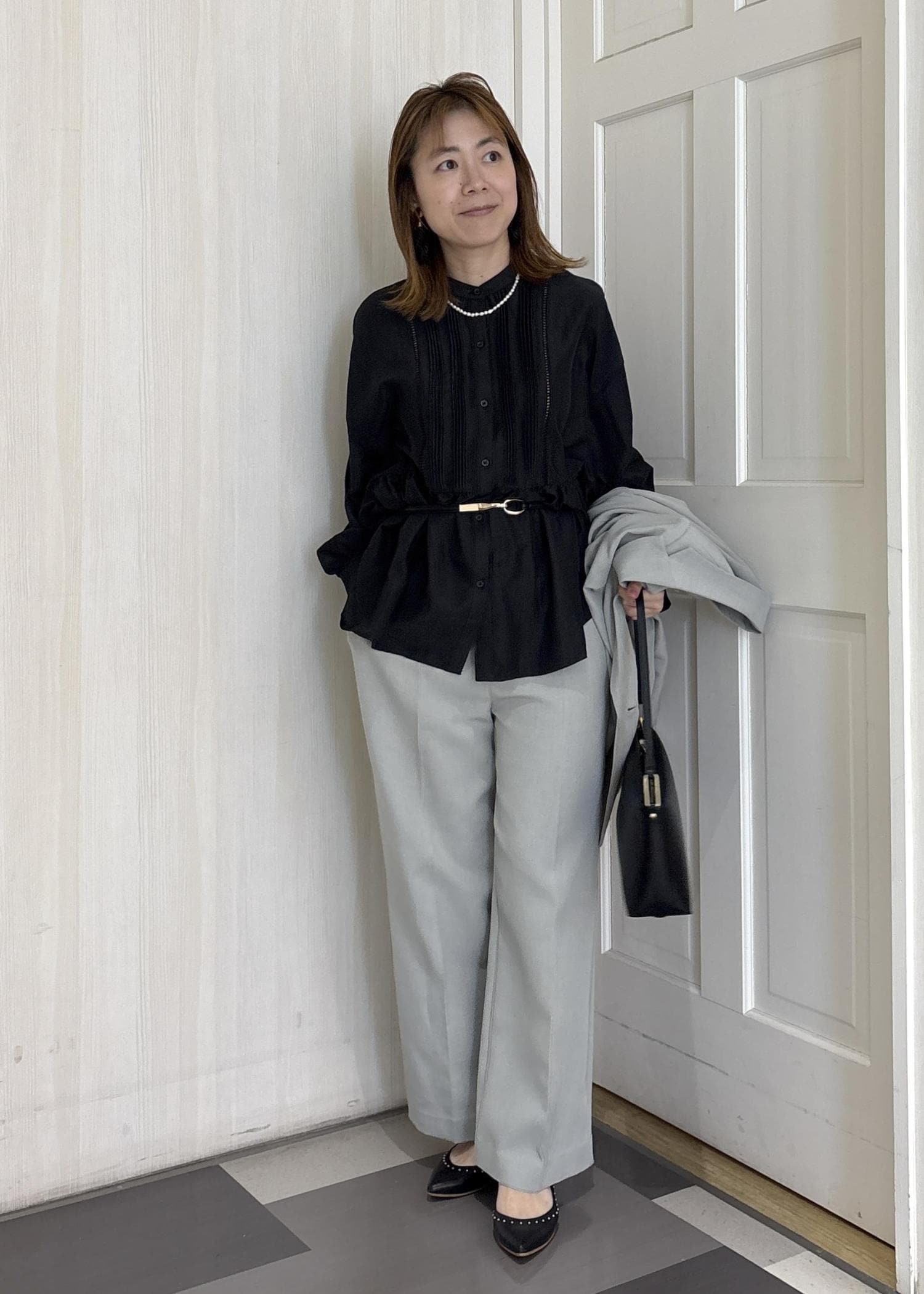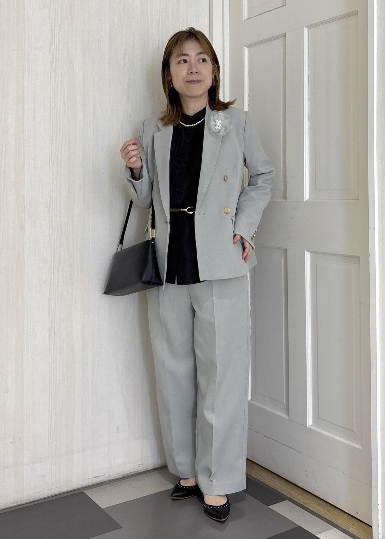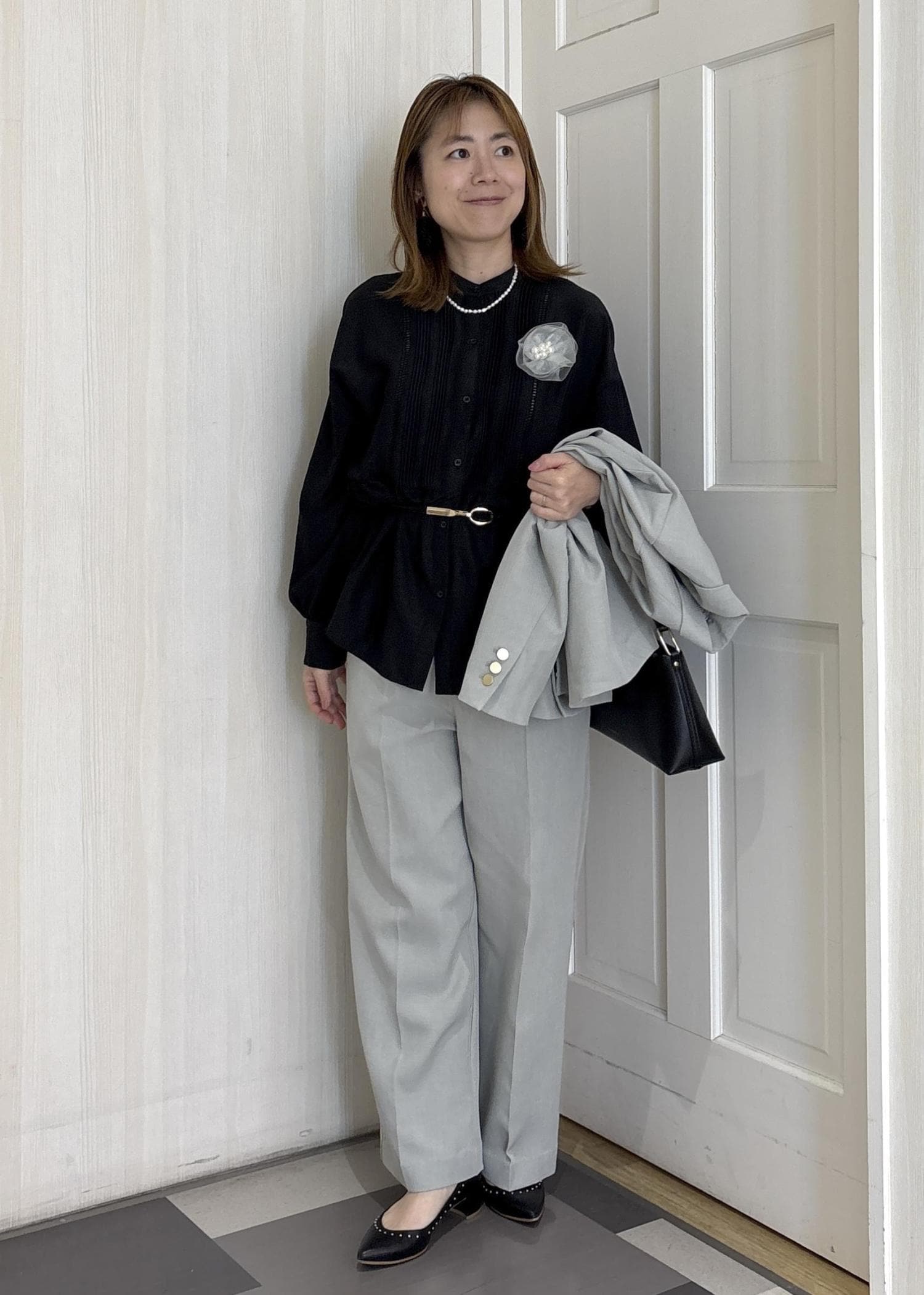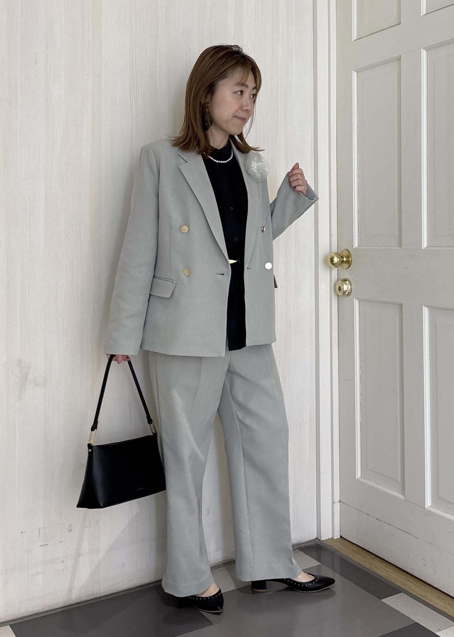 明るいカラーのセットアップにしたので、今回は卒園式イメージで、インナーと小物は黒を合わせました。