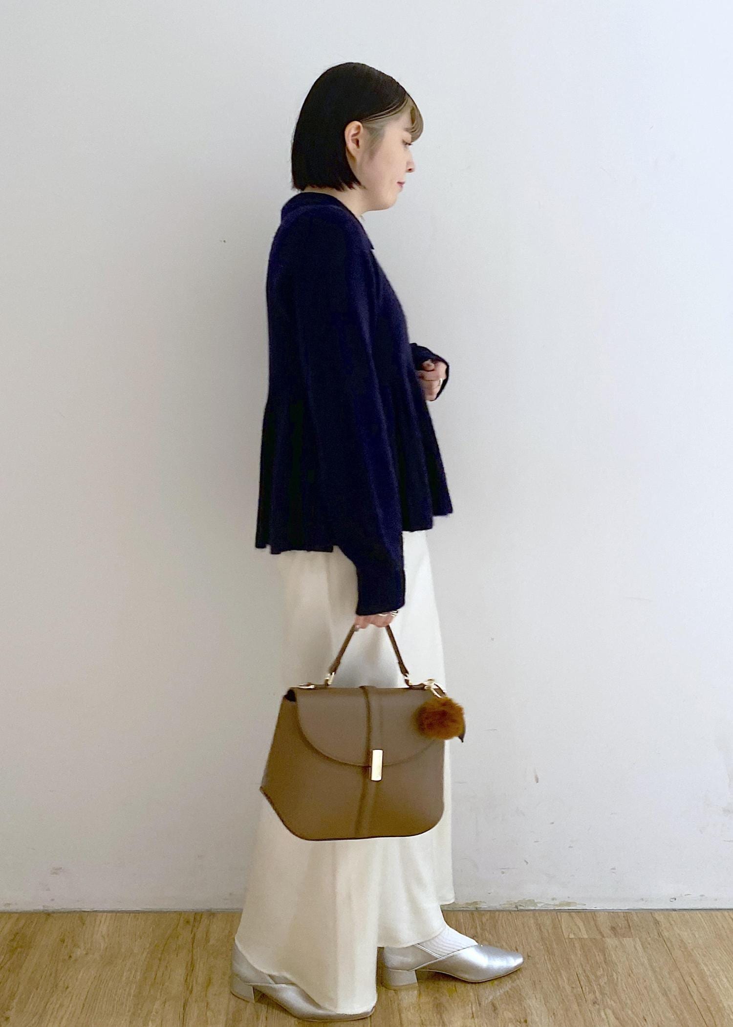 足元はシルバーのシューズを合わせて