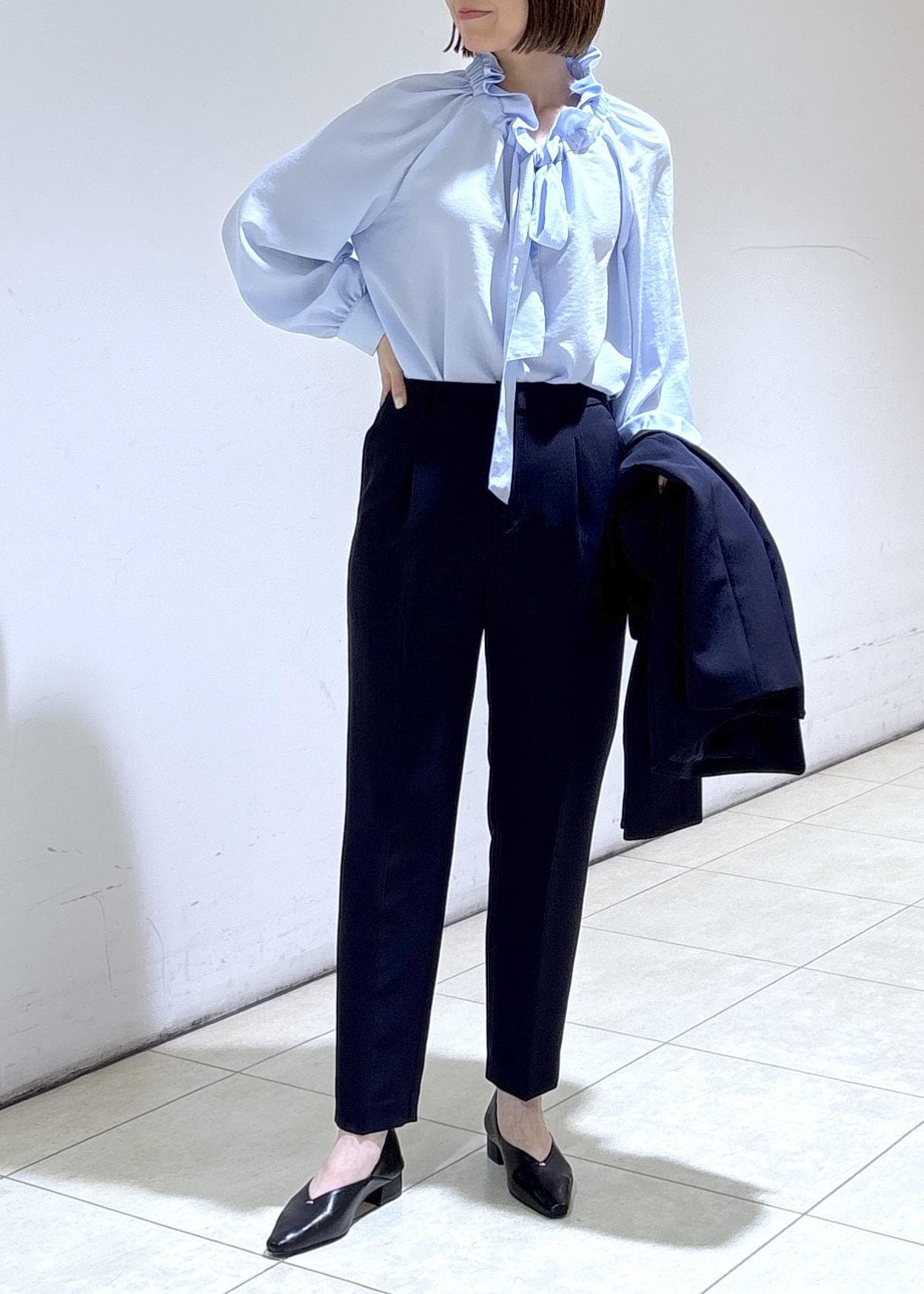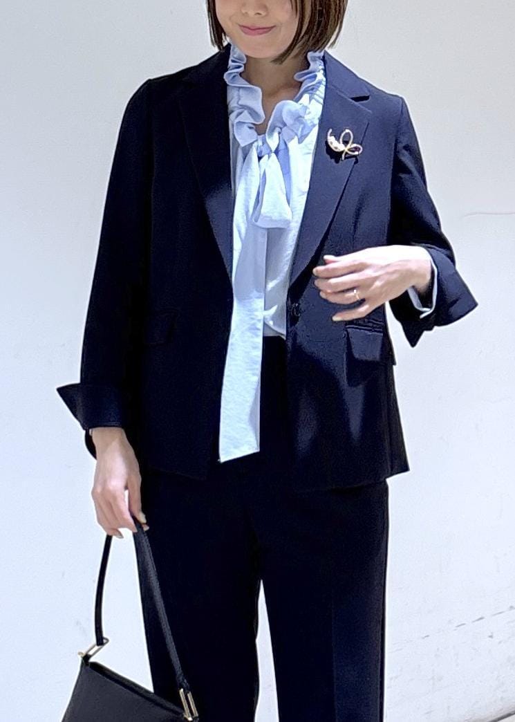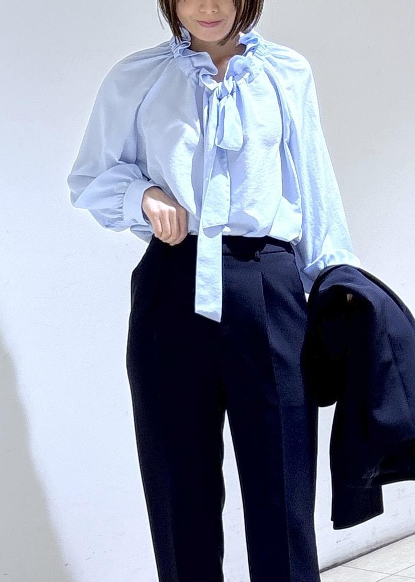 ブルーのリボンブラウスで華やかに。
