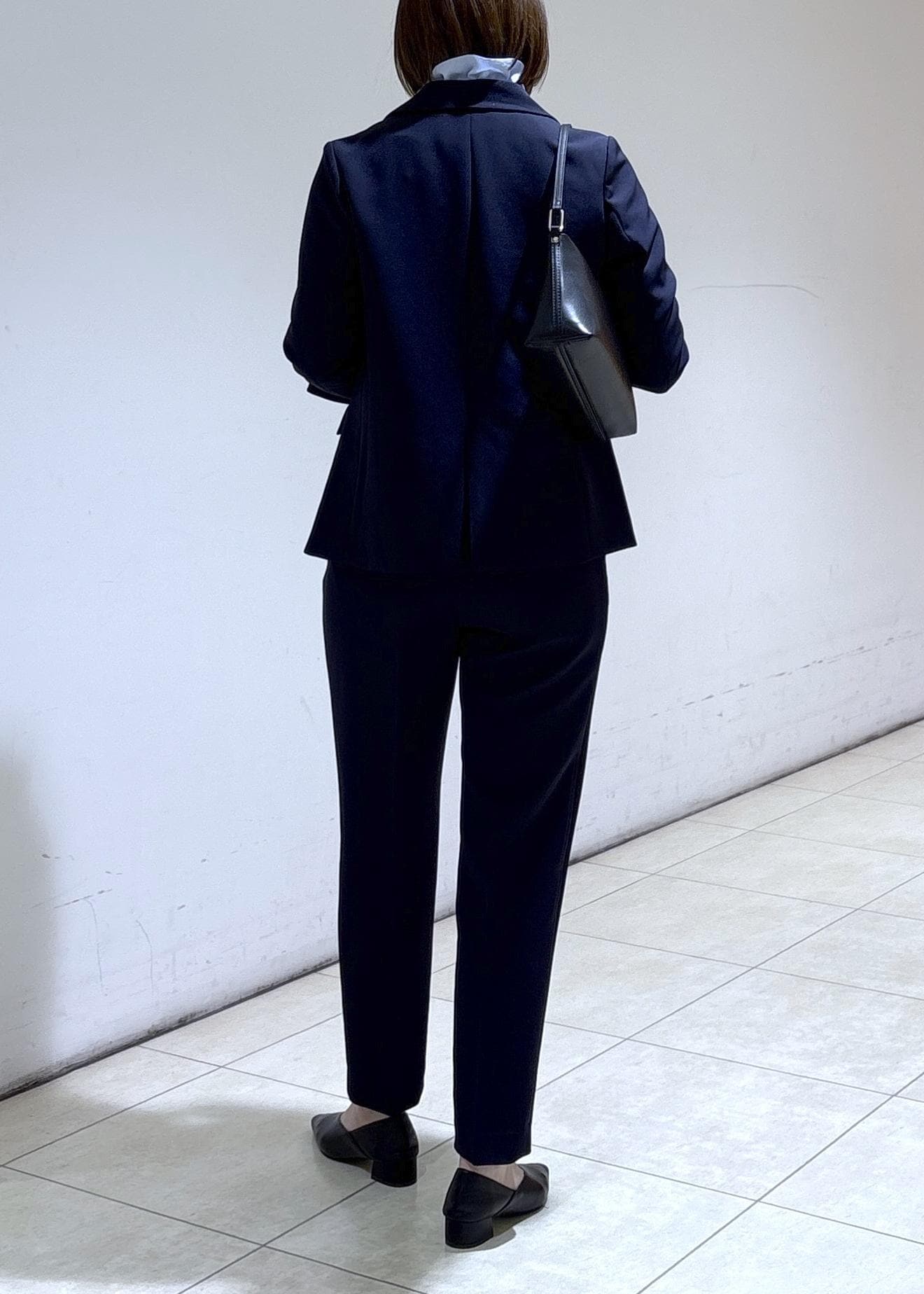 ネイビーのジャケットにテーパードパンツを合わせたセットアップコーデ。