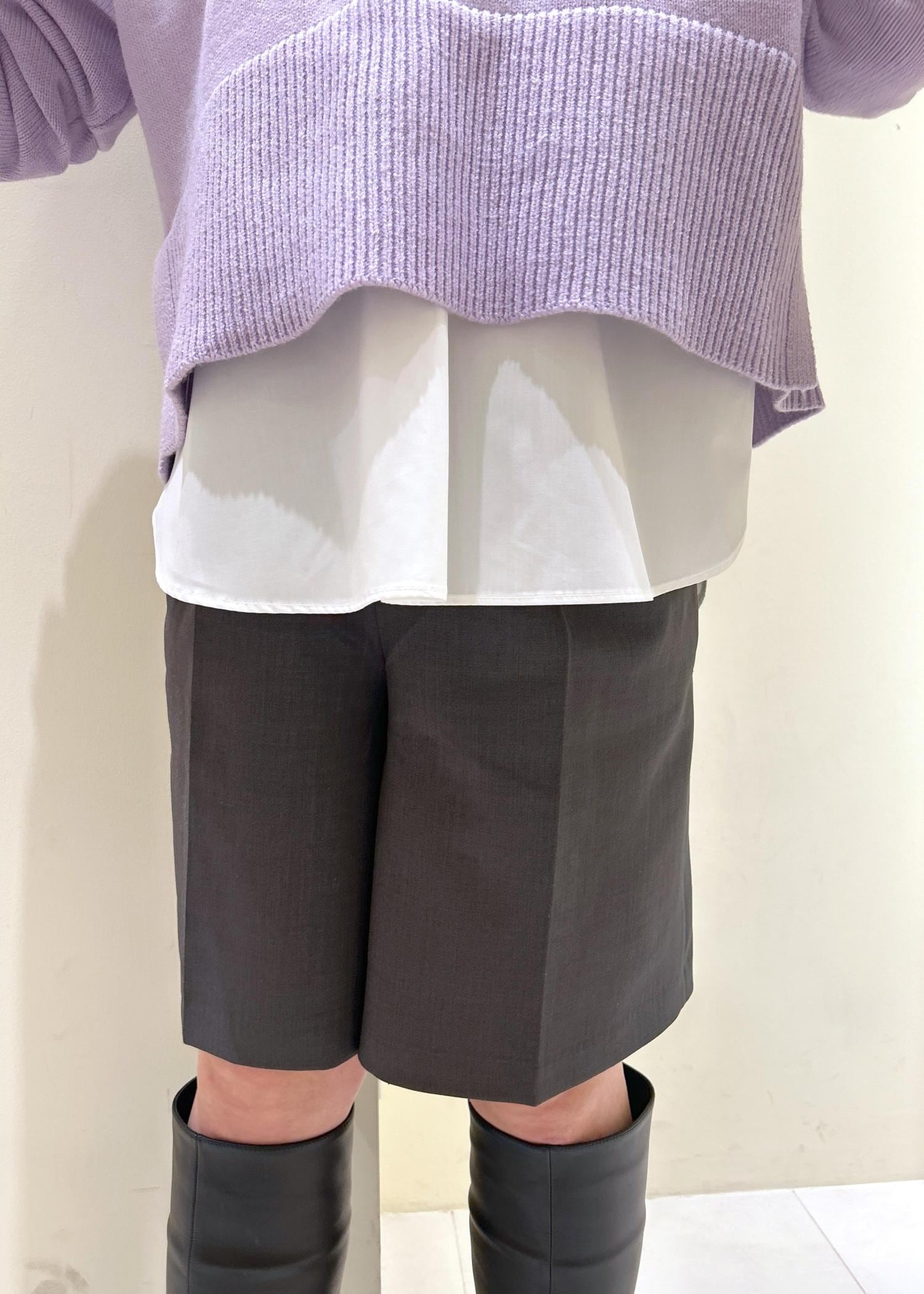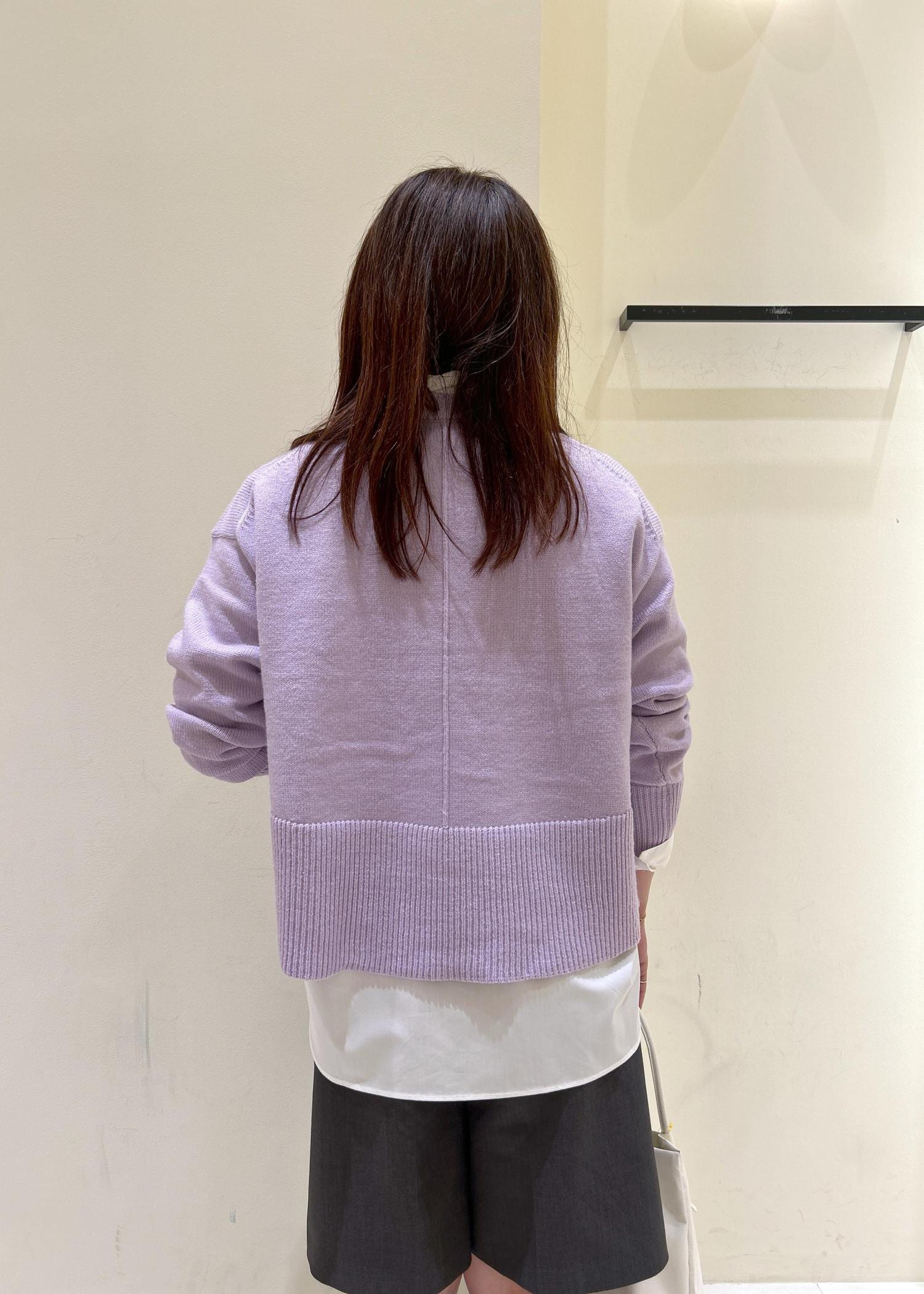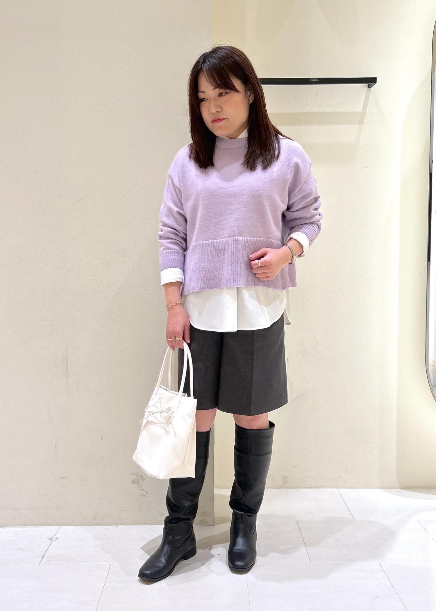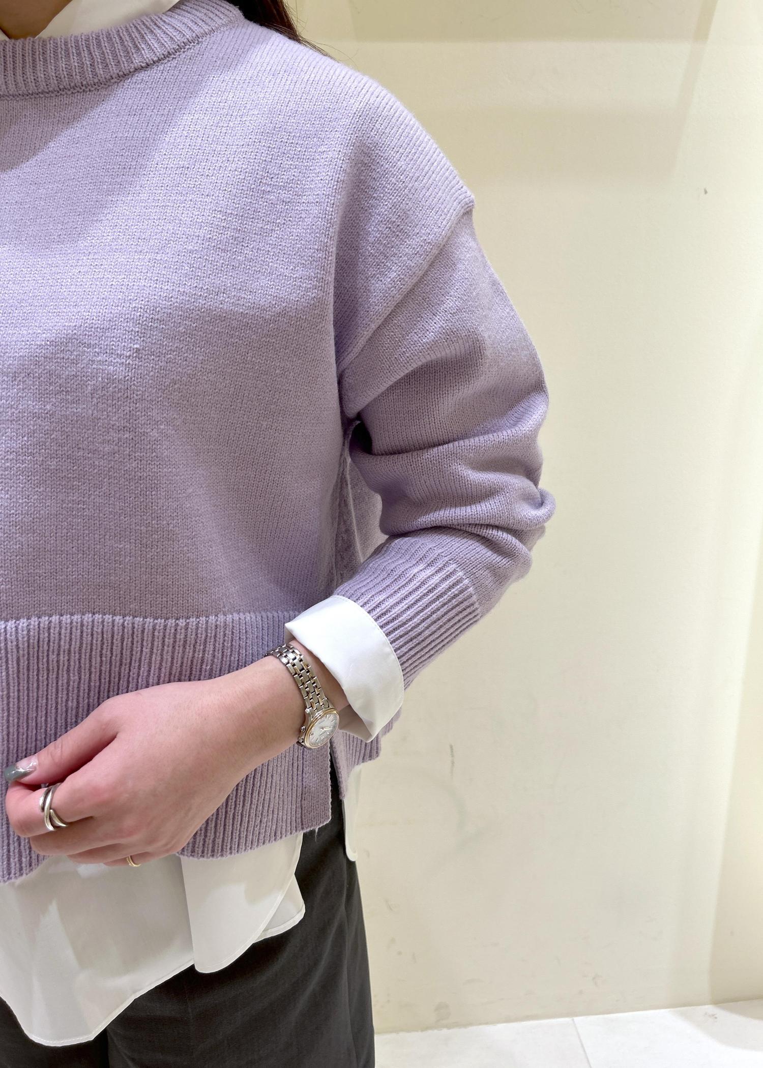 春にも着れるラベンダーカラーのニットに白シャツを合わせたレイヤードスタイル。