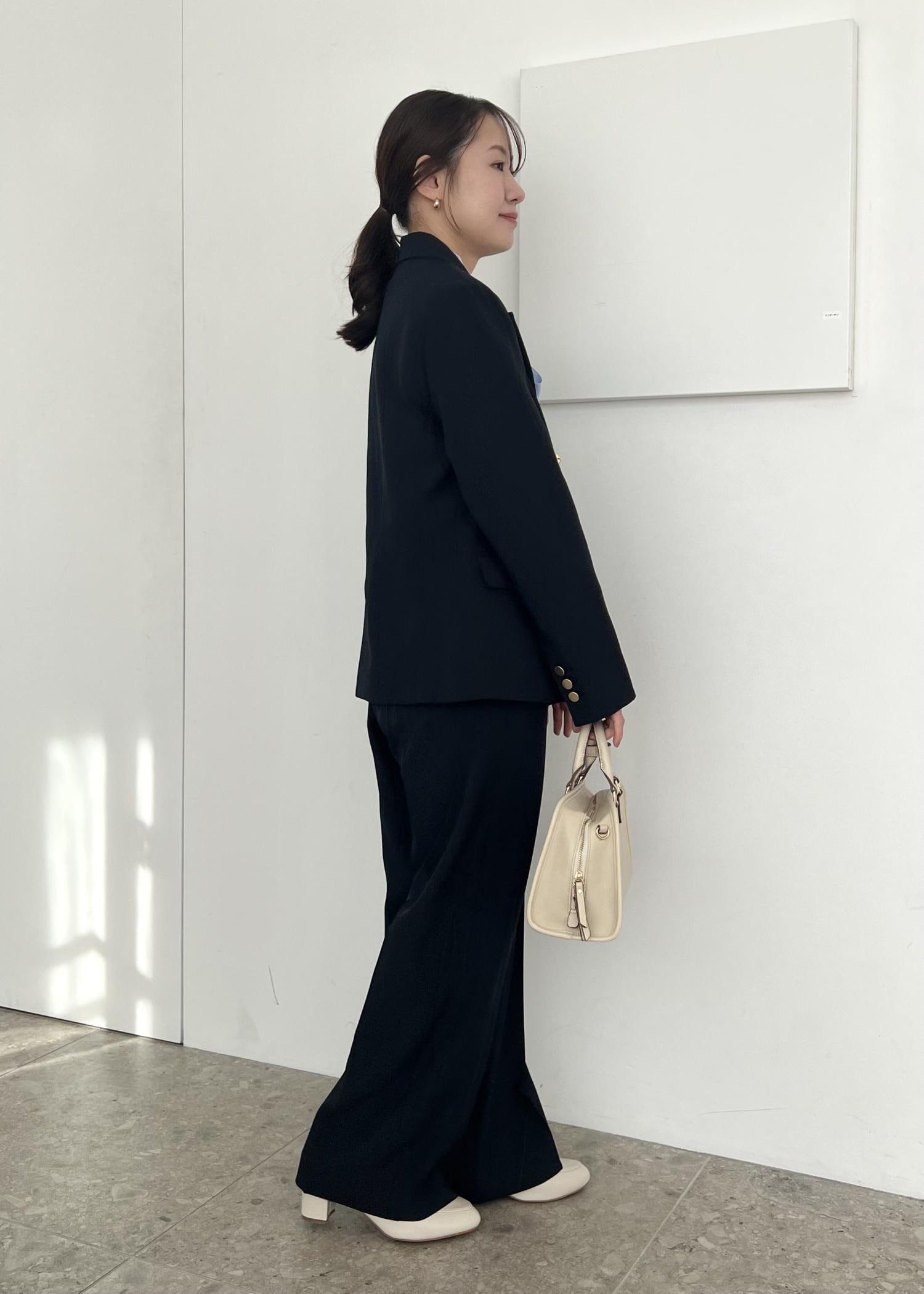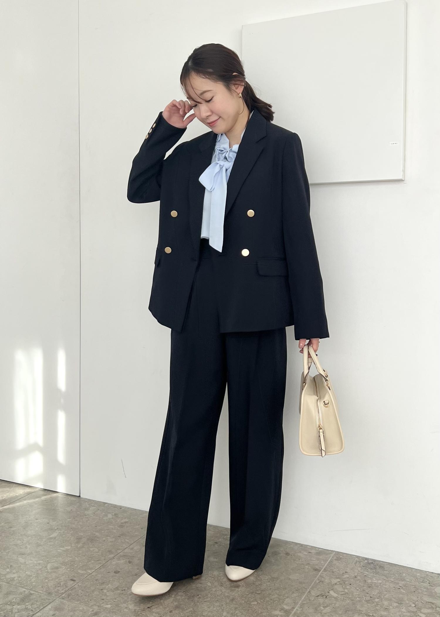 ブルーのフリルシャツと合わせて、セレモニーコーデに。